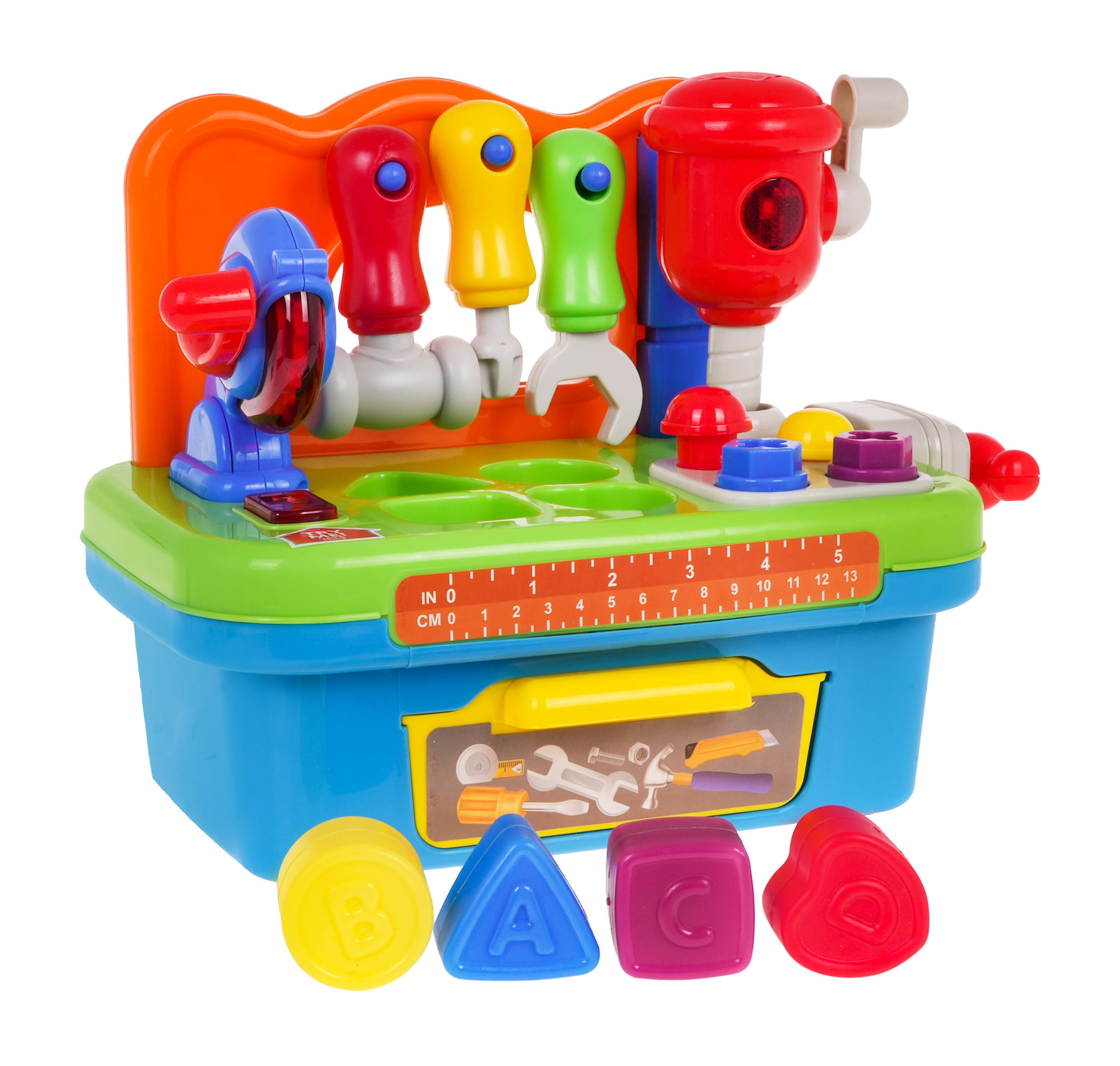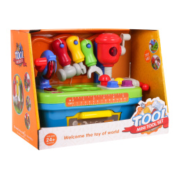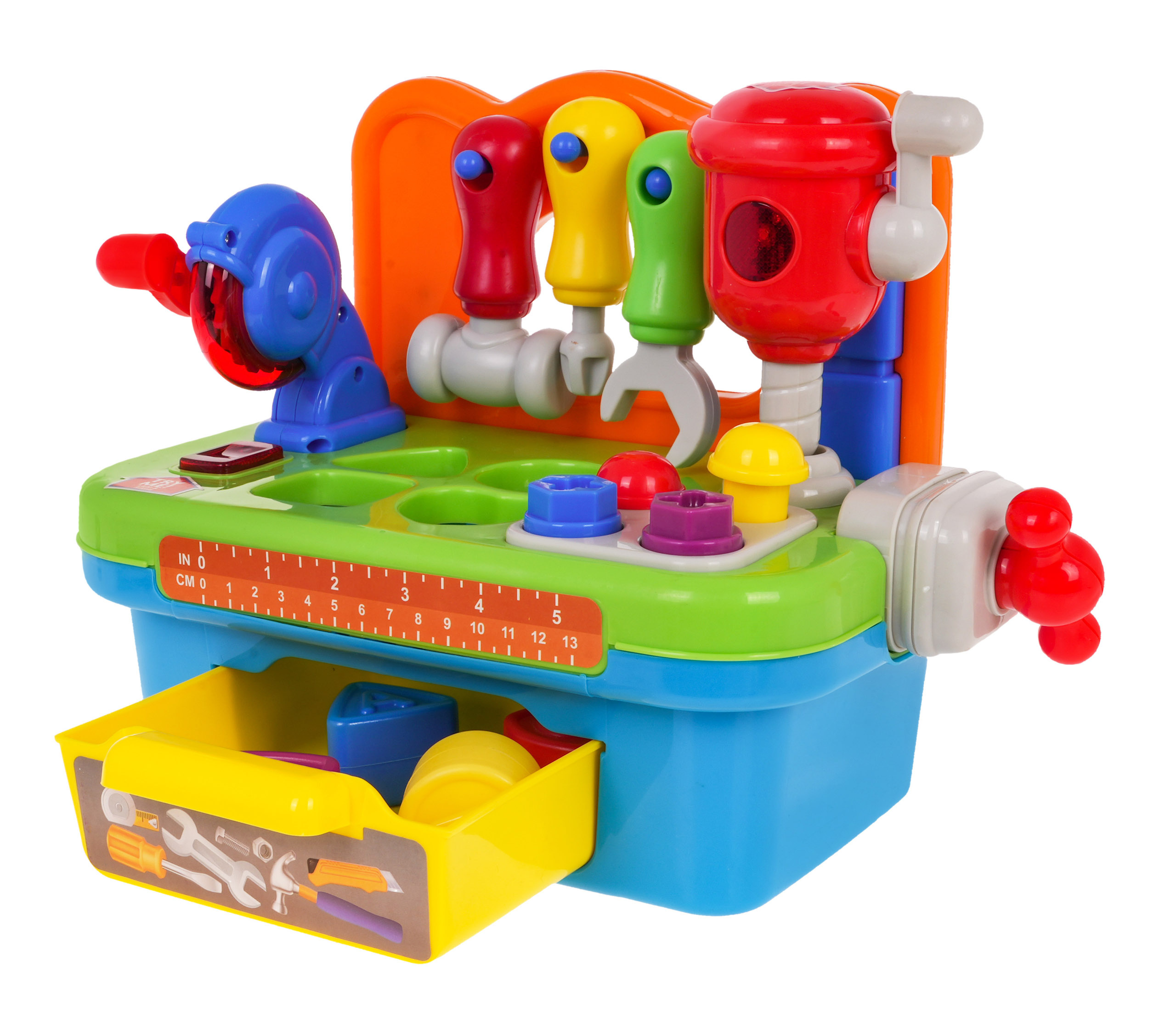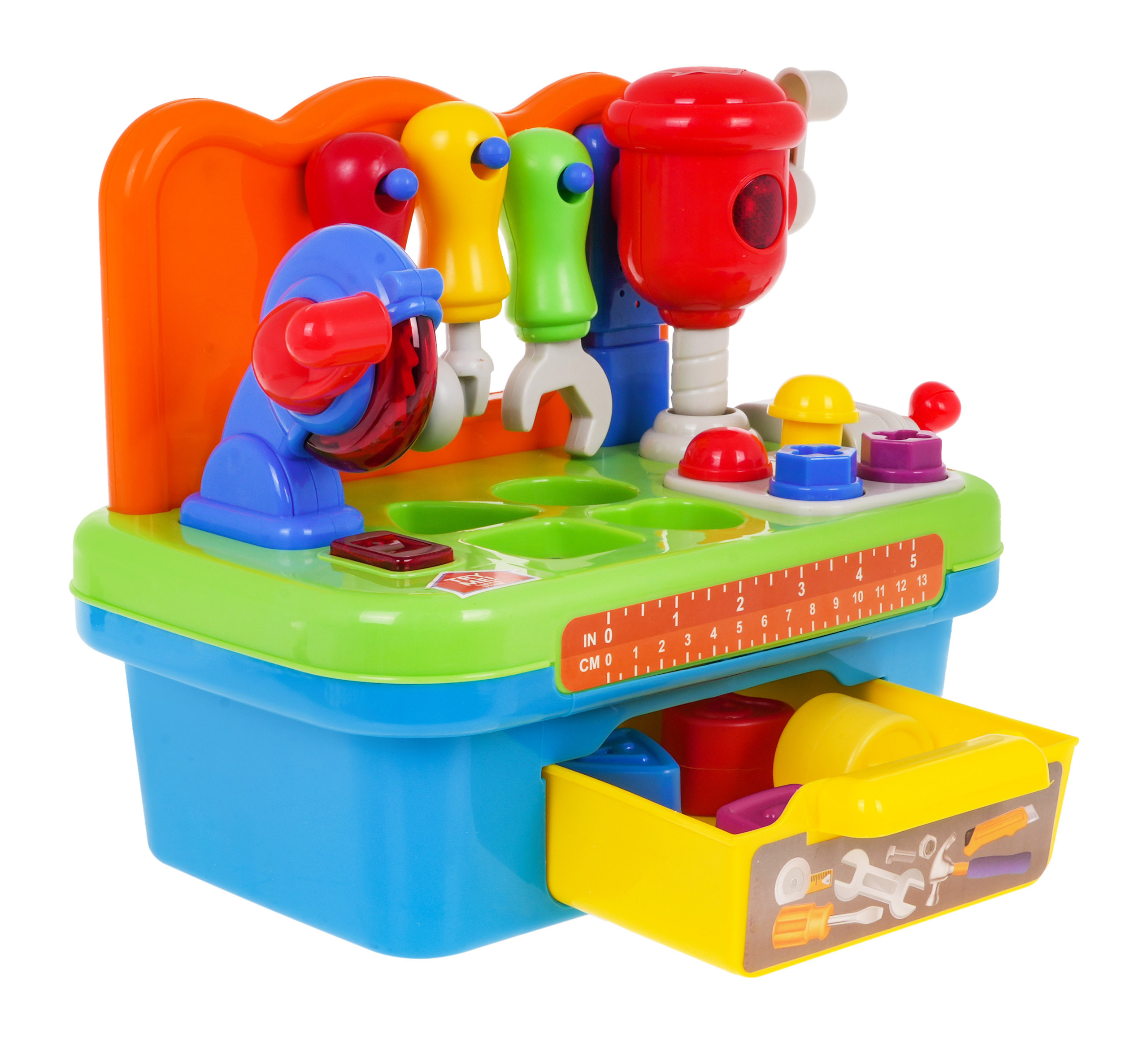 Мултифункционалната интерактивна играчка със звукова и светлинна функция е подходяща за деца над 24 месеца. Работилницата за майстори е оборудвана с редица функции. На разположение са ротационен циркуляр и ударен чук. Всяко сечиво е оборудвано с практична дръжка, с която се стартира. На плота на работната маса е прикрепен менгеме, което позволява на нашето малко дете да се научи на рефлекси при завиване и отвиване, придружени от дрънчащи звуци. Част от работилницата ще бъдат пирони за забиване и винтове за завиване. Към допълнителното оборудване принадлежат инструменти: отвертка, ключ и чук, всичко в размери, идеално подходящи за малки детски ръце. Работилницата също е чудесно място за упражняване на разпознаване на форми и съпоставяне. Плотът на работния плот е оборудван с разделител, който е отличен за развитие на детските умения. Всички части, които пасват в съответните отвори, ще намерите в практичното чекмедже в долната част на играчката. Работилницата се захранва от 3 батерии AG13, които са включени в доставката.