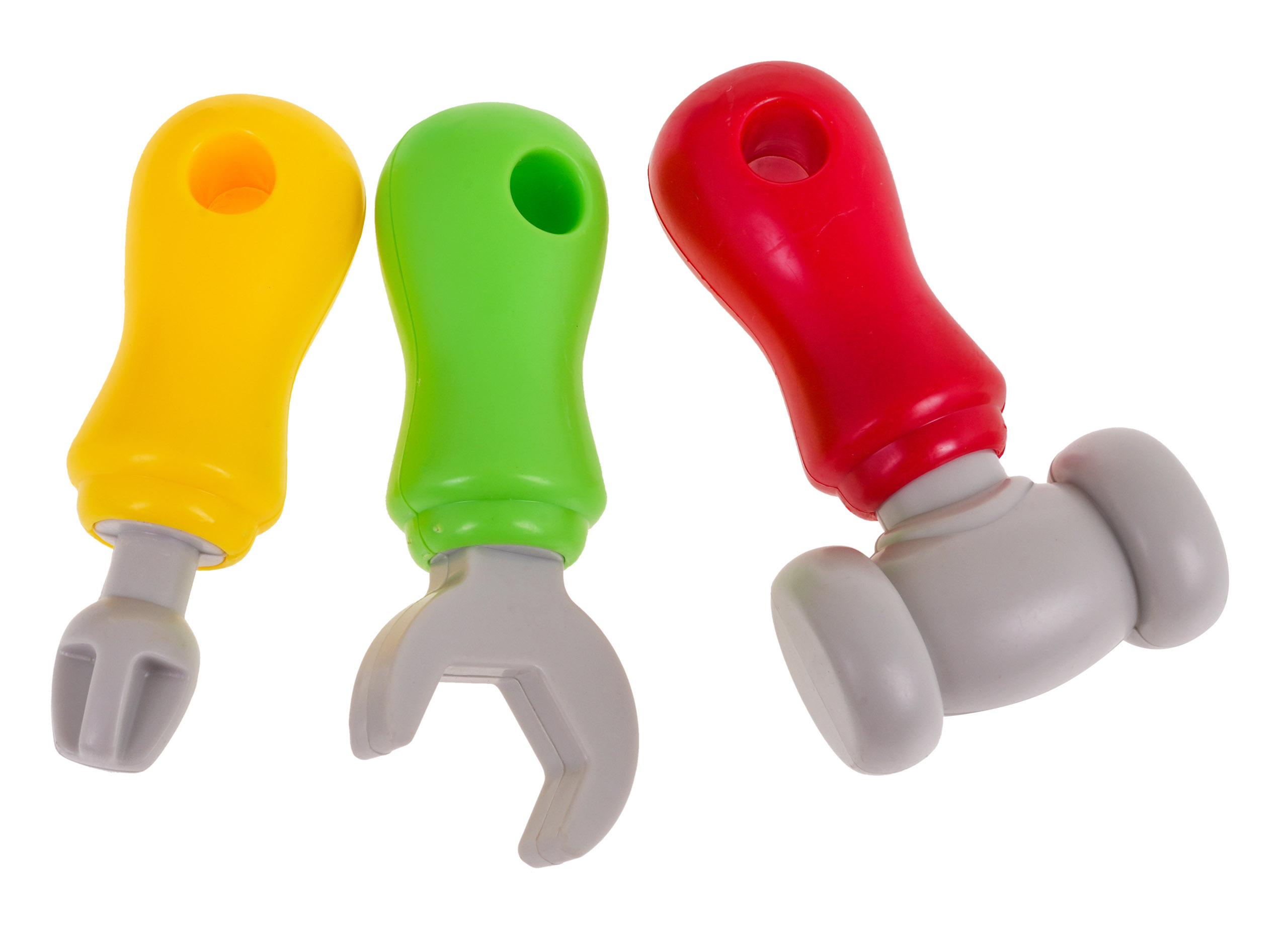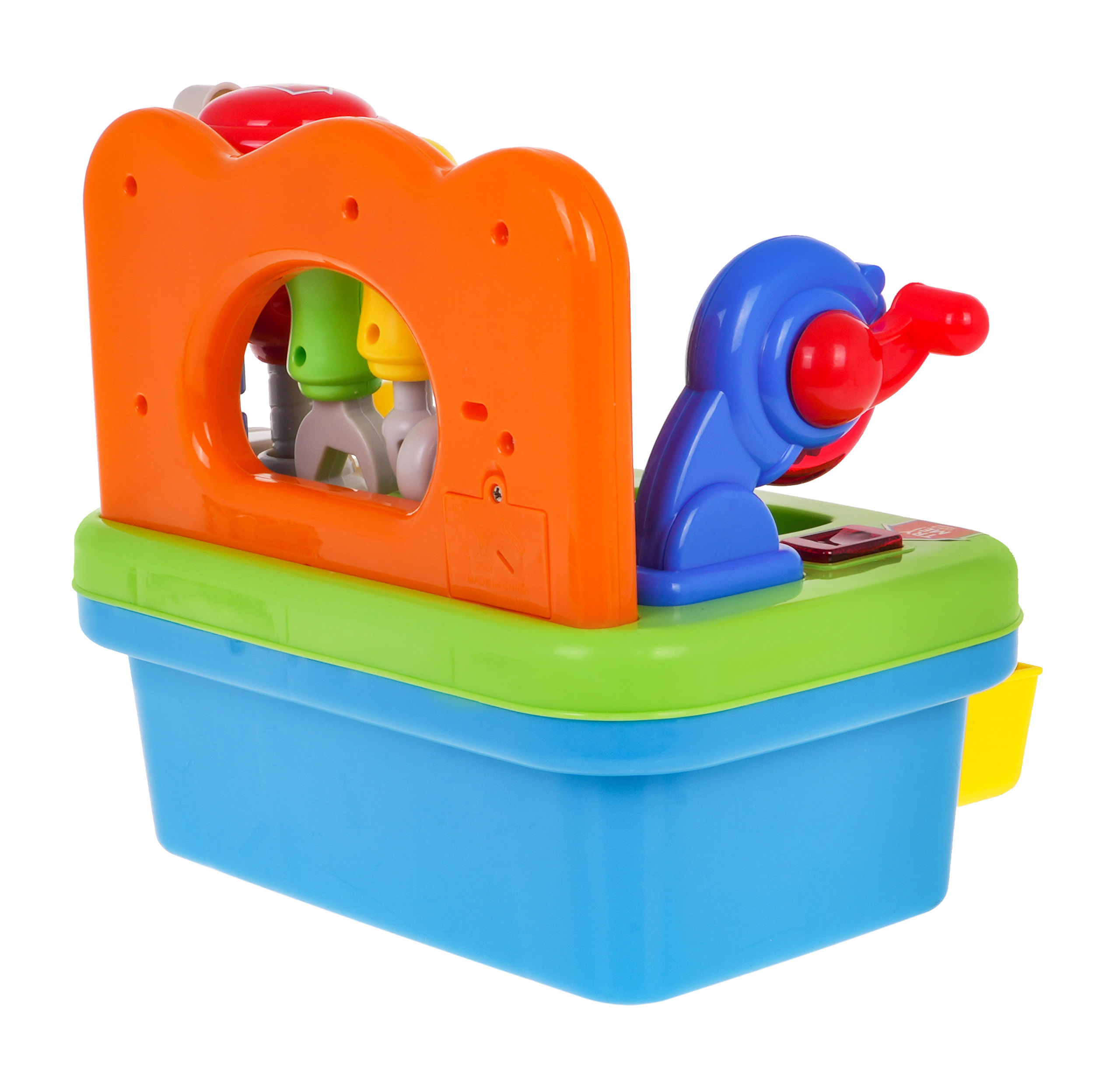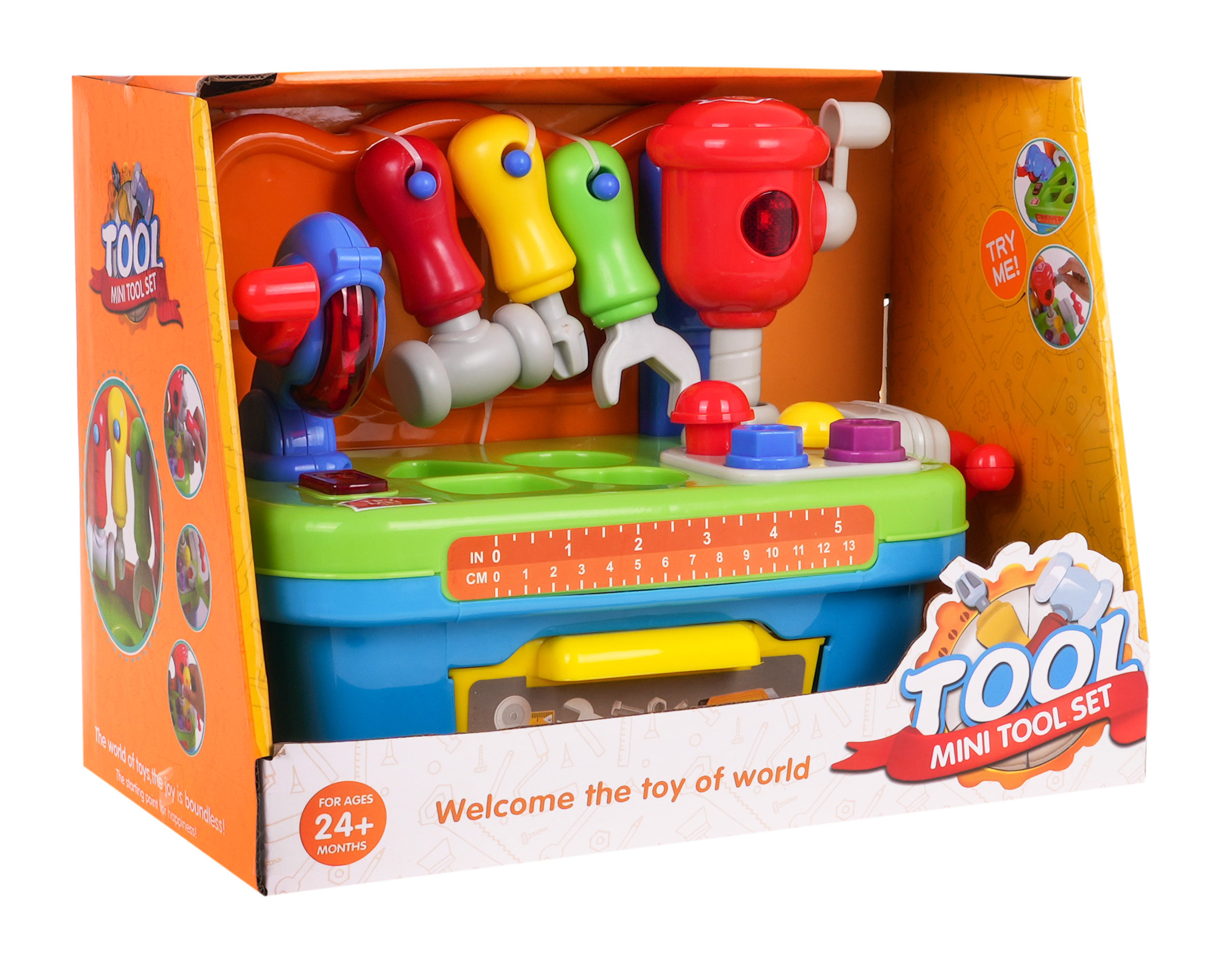 Мултифункционалната интерактивна играчка със звукова и светлинна функция е подходяща за деца над 24 месеца. Работилницата за майстори е оборудвана с редица функции. На разположение са ротационен циркуляр и ударен чук. Всяко сечиво е оборудвано с практична дръжка, с която се стартира. На плота на работната маса е прикрепен менгеме, което позволява на нашето малко дете да се научи на рефлекси при завиване и отвиване, придружени от дрънчащи звуци. Част от работилницата ще бъдат пирони за забиване и винтове за завиване. Към допълнителното оборудване принадлежат инструменти: отвертка, ключ и чук, всичко в размери, идеално подходящи за малки детски ръце. Работилницата също е чудесно място за упражняване на разпознаване на форми и съпоставяне. Плотът на работния плот е оборудван с разделител, който е отличен за развитие на детските умения. Всички части, които пасват в съответните отвори, ще намерите в практичното чекмедже в долната част на играчката. Работилницата се захранва от 3 батерии AG13, които са включени в доставката.