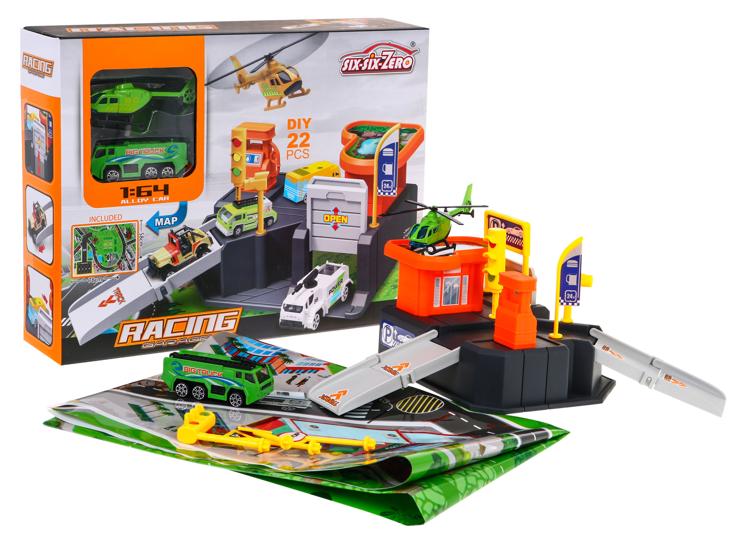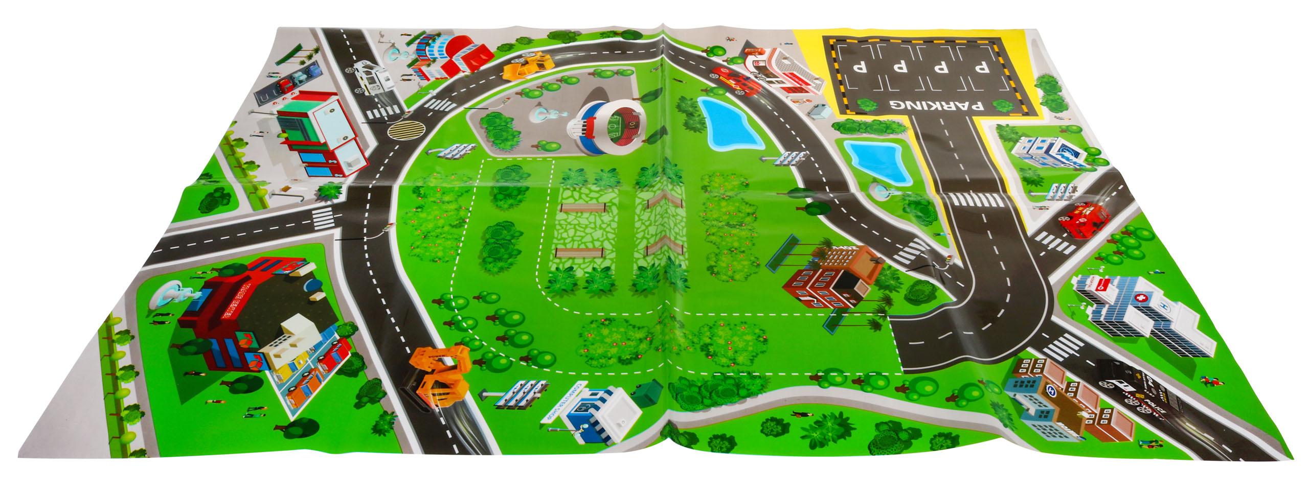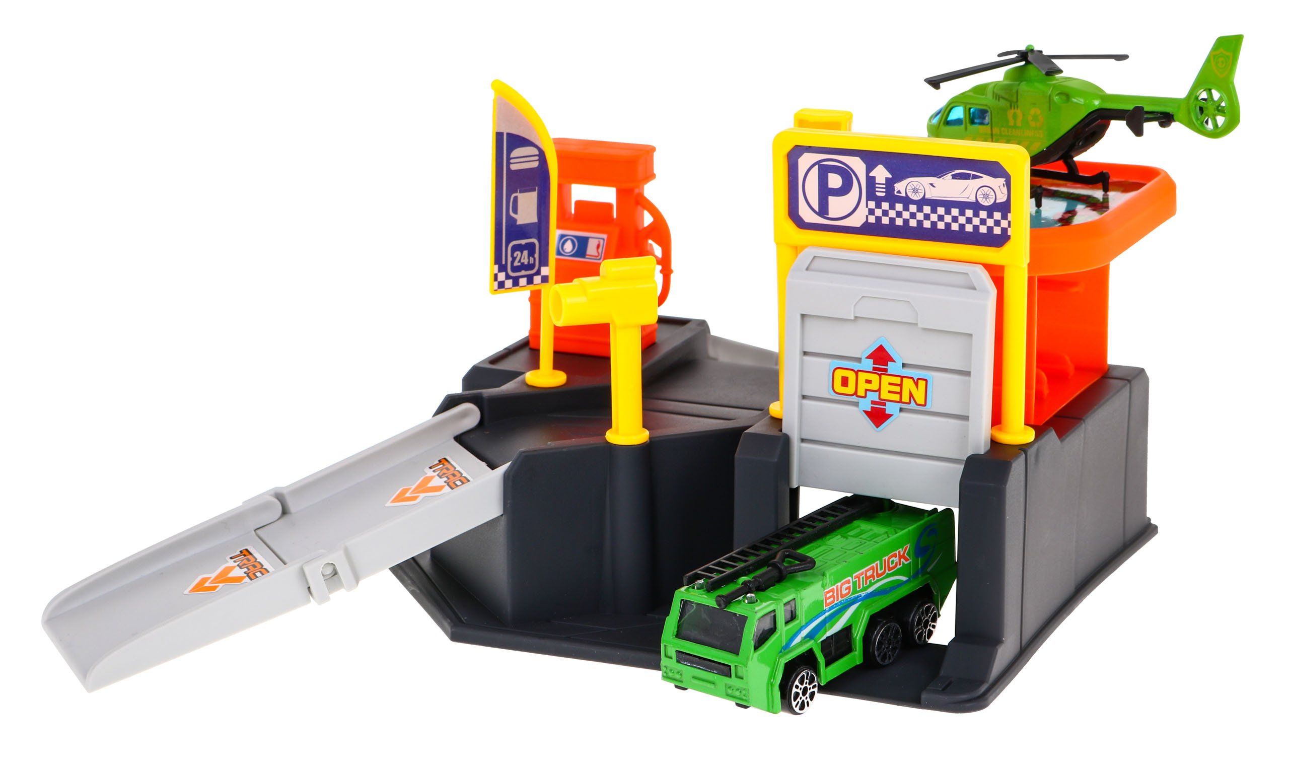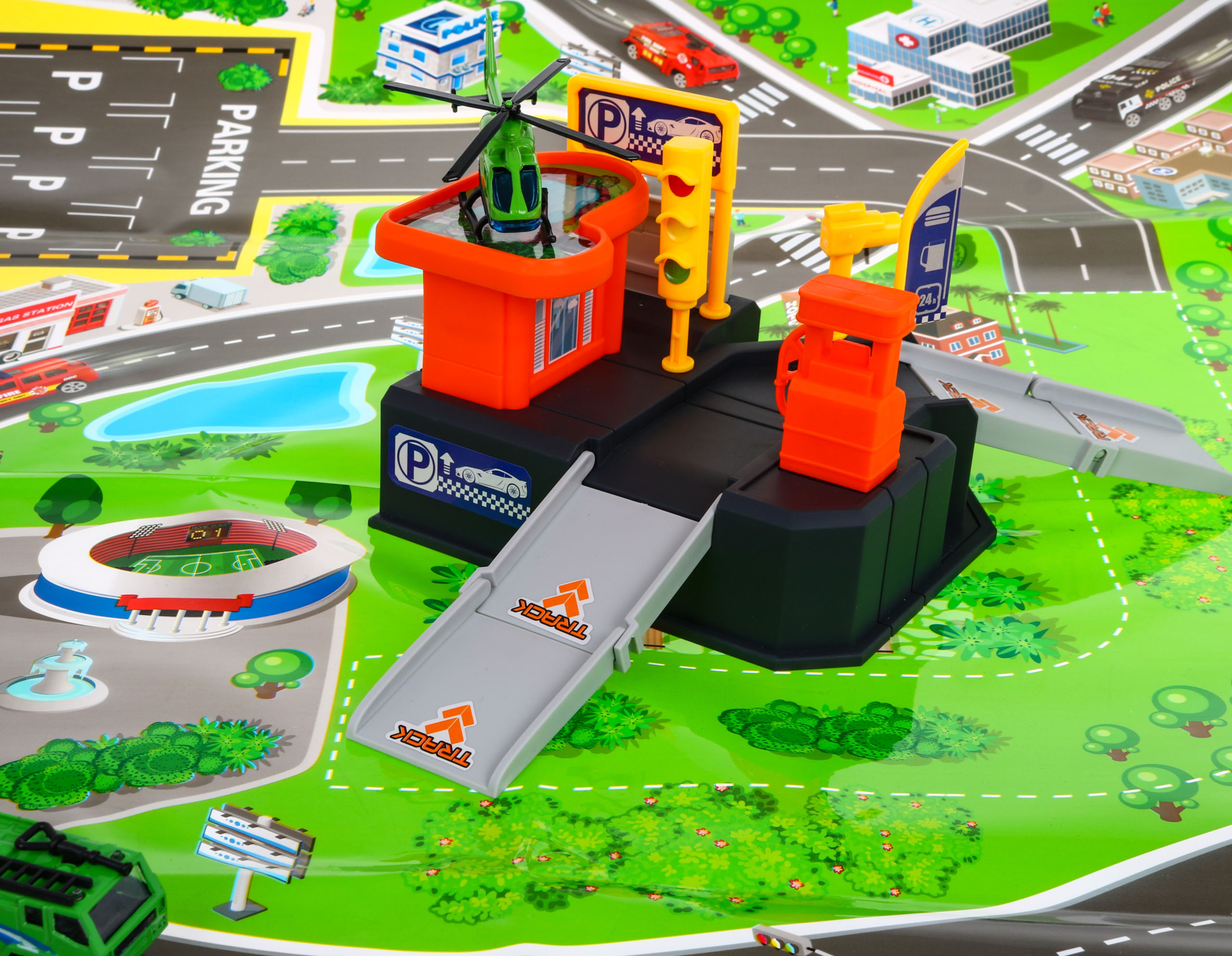 Комплектът се състои от 22 елемента. Част от паркинга е подложка с пътища, по които децата могат да карат колички. Несъмнено предимство на този паркинг е неговият размер, не заема много място в помещението. Играчката е предназначена за деца над три години.