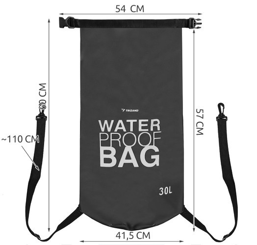 Чантата е изработена от издръжлив материал, който не само е водоустойчив, но и ефективно защитава предметите вътре от надраскване и замърсяване.като брод, пясък и сол. Черният цвят и гладката, хлъзгава повърхност не абсорбират влага или замърсявания, което го прави перфектен дори при екстремна, интензивна употреба и освен това гарантира лесно почистване. Продуктът е здрав и може да се използва многократно за дълъг период от време . 30-литровата чанта позволява да се поставят в нея много полезни и ценни предмети, като телефон, портфейл, дрехи, обувки, книги, карти, фотоапарат, електронни устройства, професионално оборудване, както и предмети с големи размери, в зависимост от индивидуалните нужди.