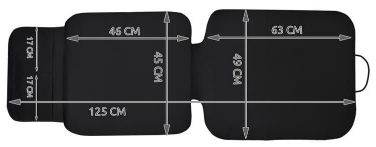 СПЕЦИФИКАЦИИ - общи размери (дължина / ширина) 125 / 49см, размери на седалката (дължина / ширина) 46 / 45см, размери на облегалката (дължина / ширина) 63 / 49см, тегло 240г.