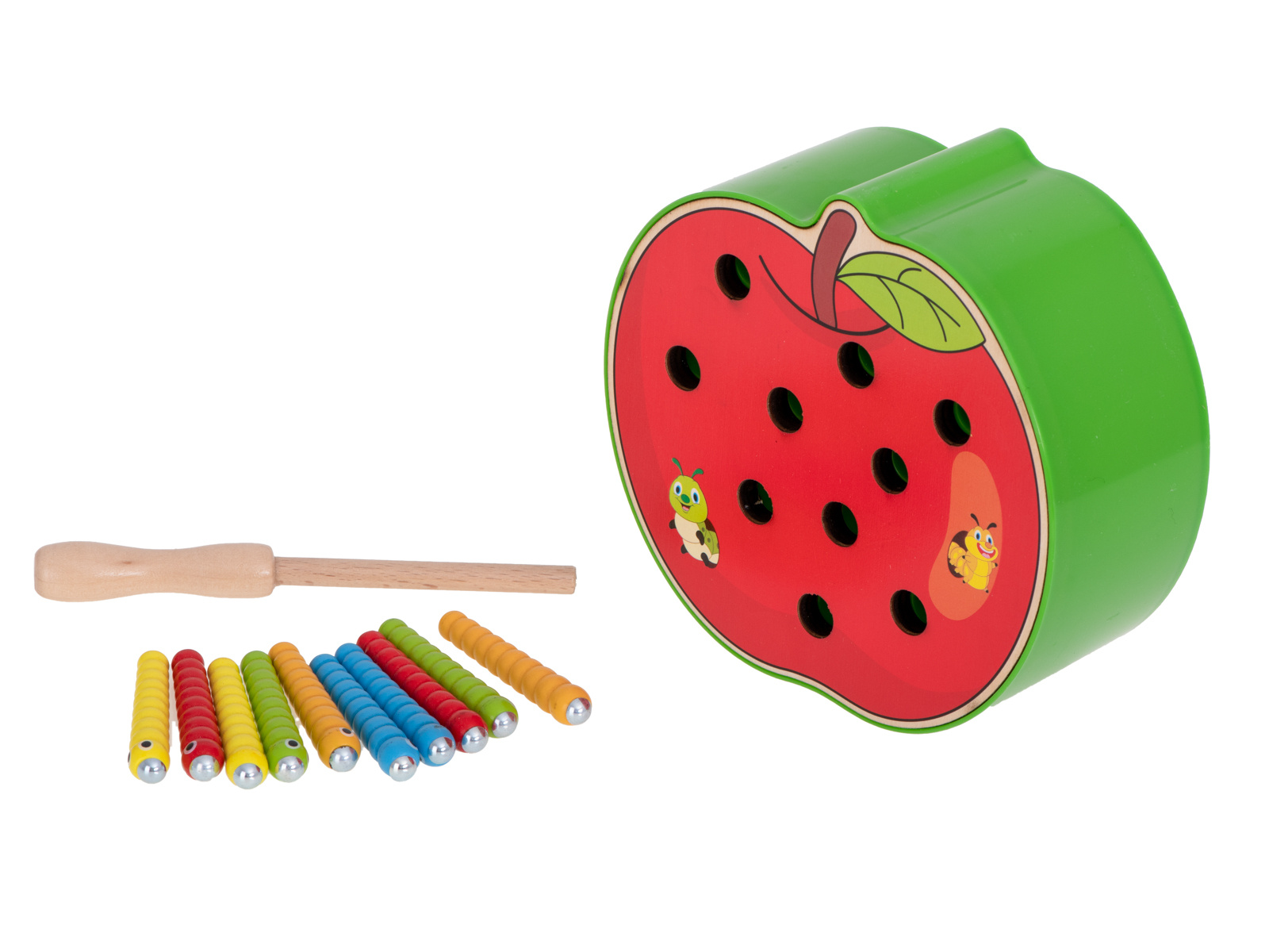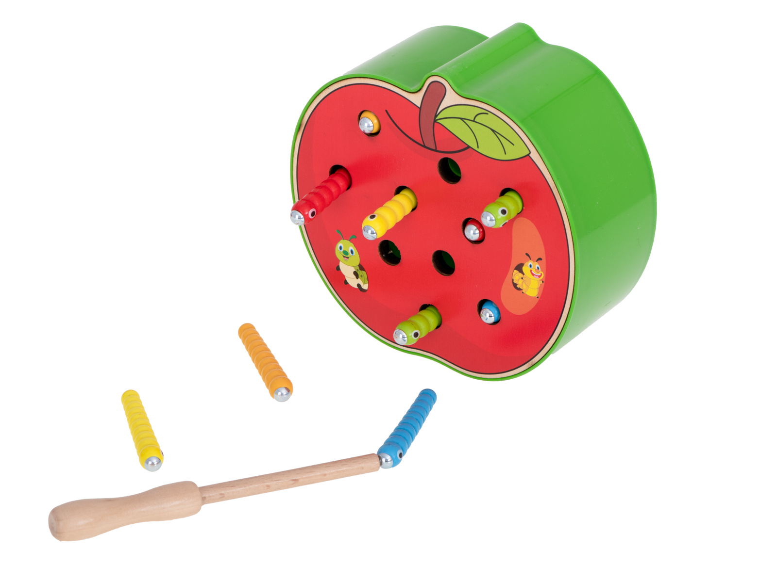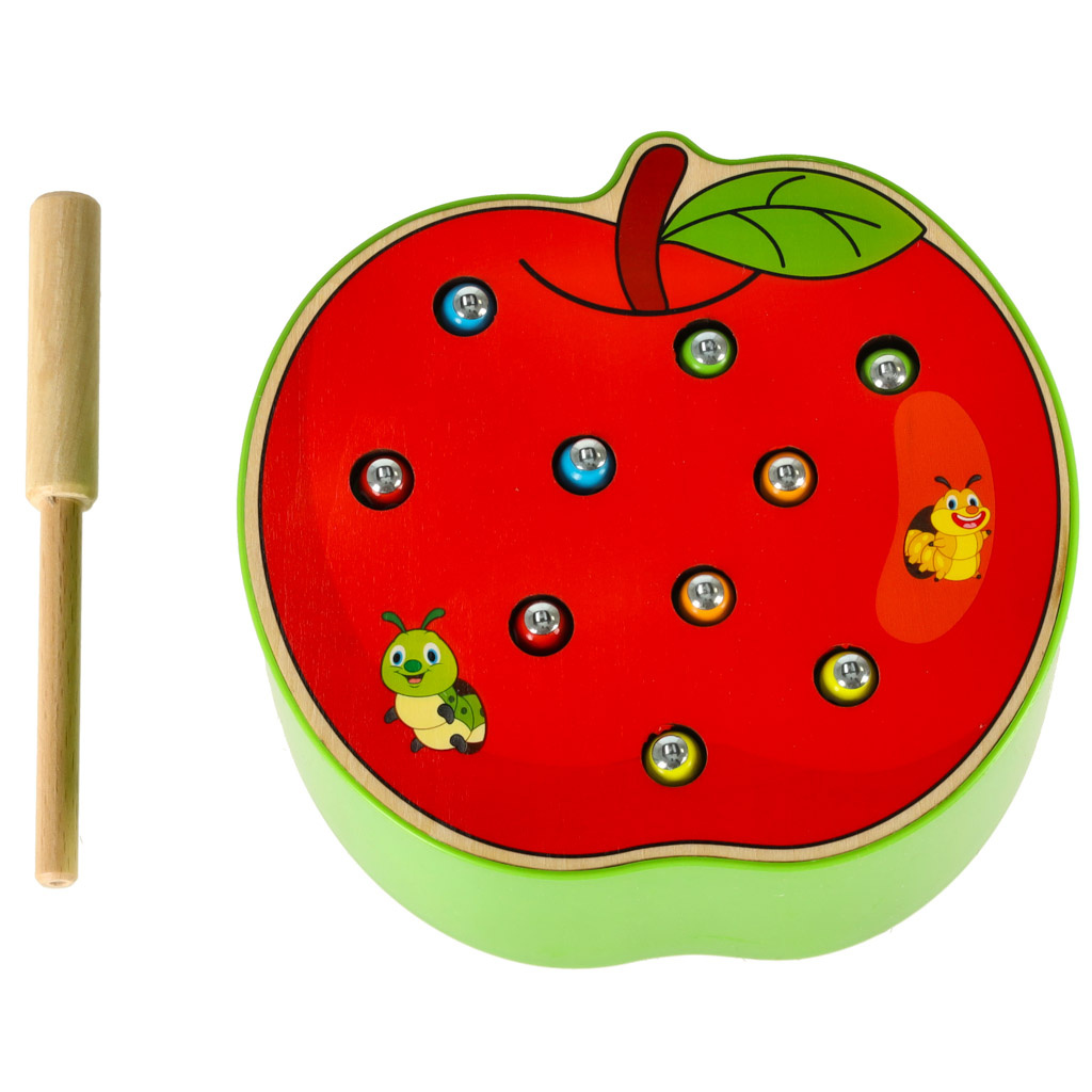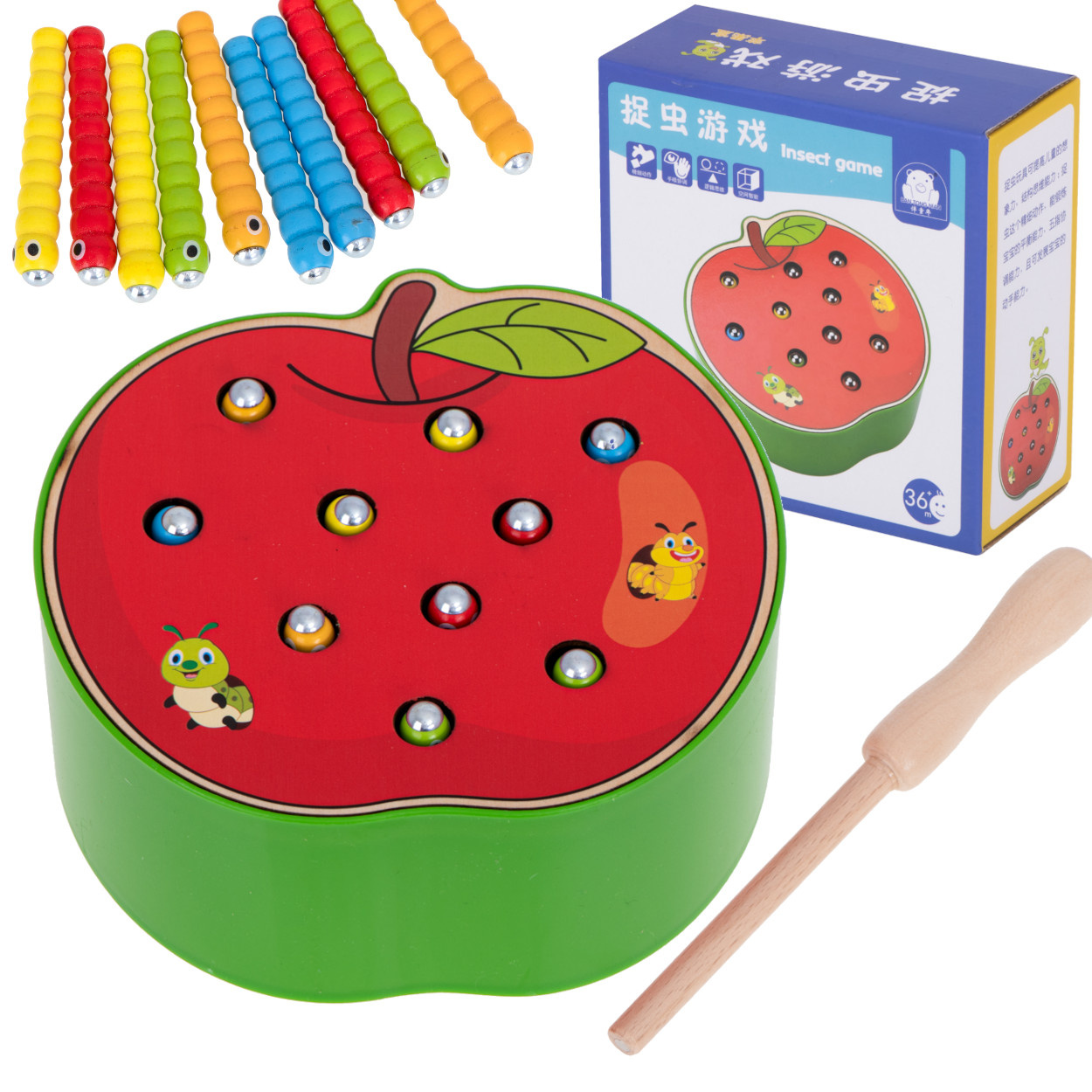 Част от комплекта е основа с форма на ягода, която крие 10 цветни гъсеници от дърво и метал, дървена пръчка с магнит на края. Задачата на детето е да "хване" гъсениците с магнит и да ги премахне от основата. По-трудната версия се състои в поставянето на червеите обратно в базата.