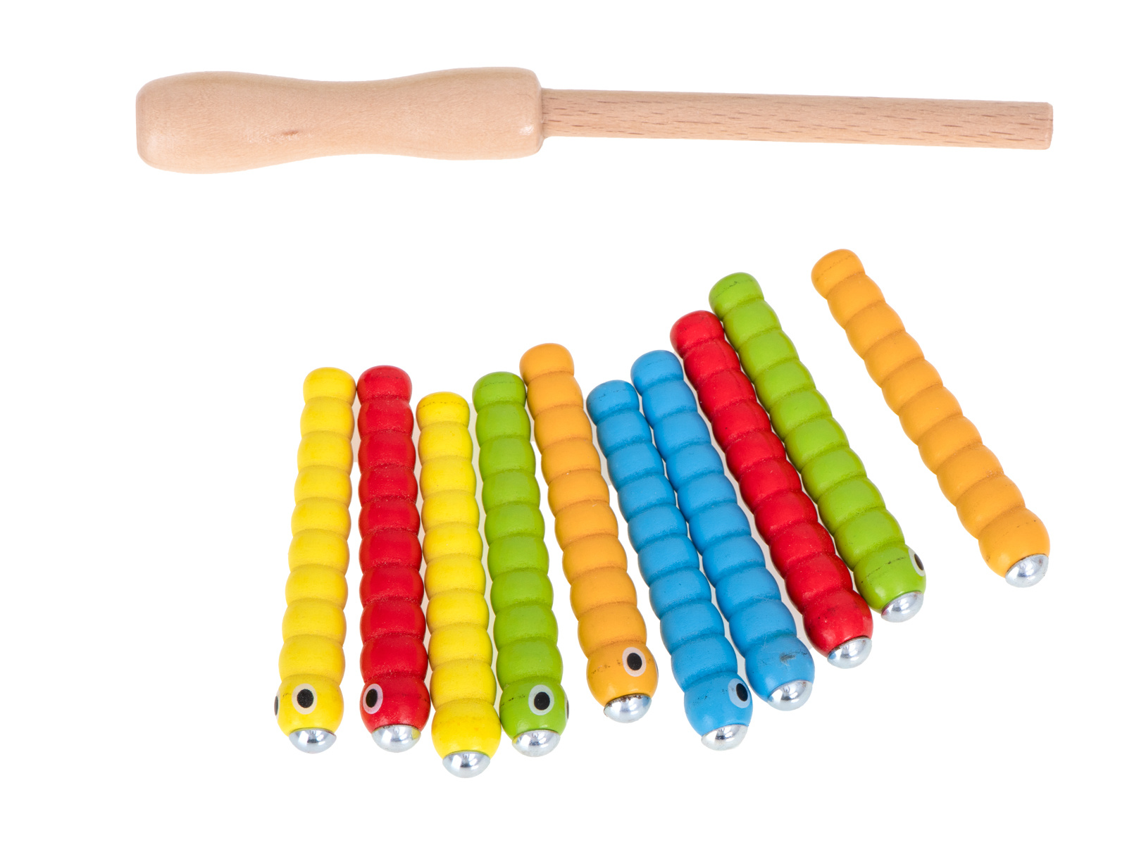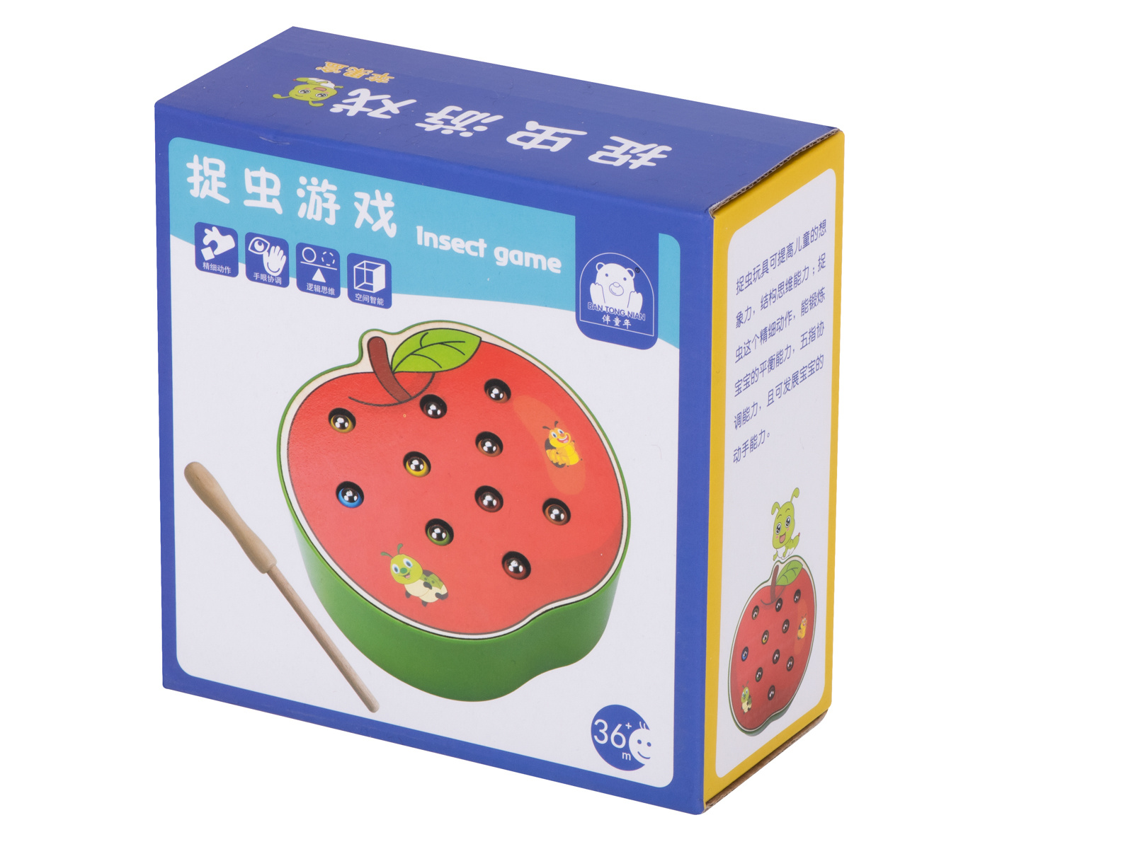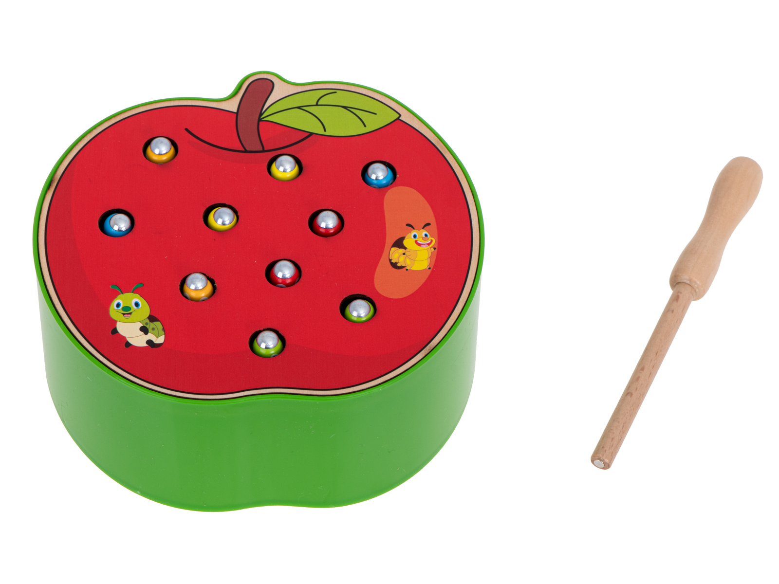 Част от комплекта е основа с форма на ягода, която крие 10 цветни гъсеници от дърво и метал, дървена пръчка с магнит на края. Задачата на детето е да "хване" гъсениците с магнит и да ги премахне от основата. По-трудната версия се състои в поставянето на червеите обратно в базата.