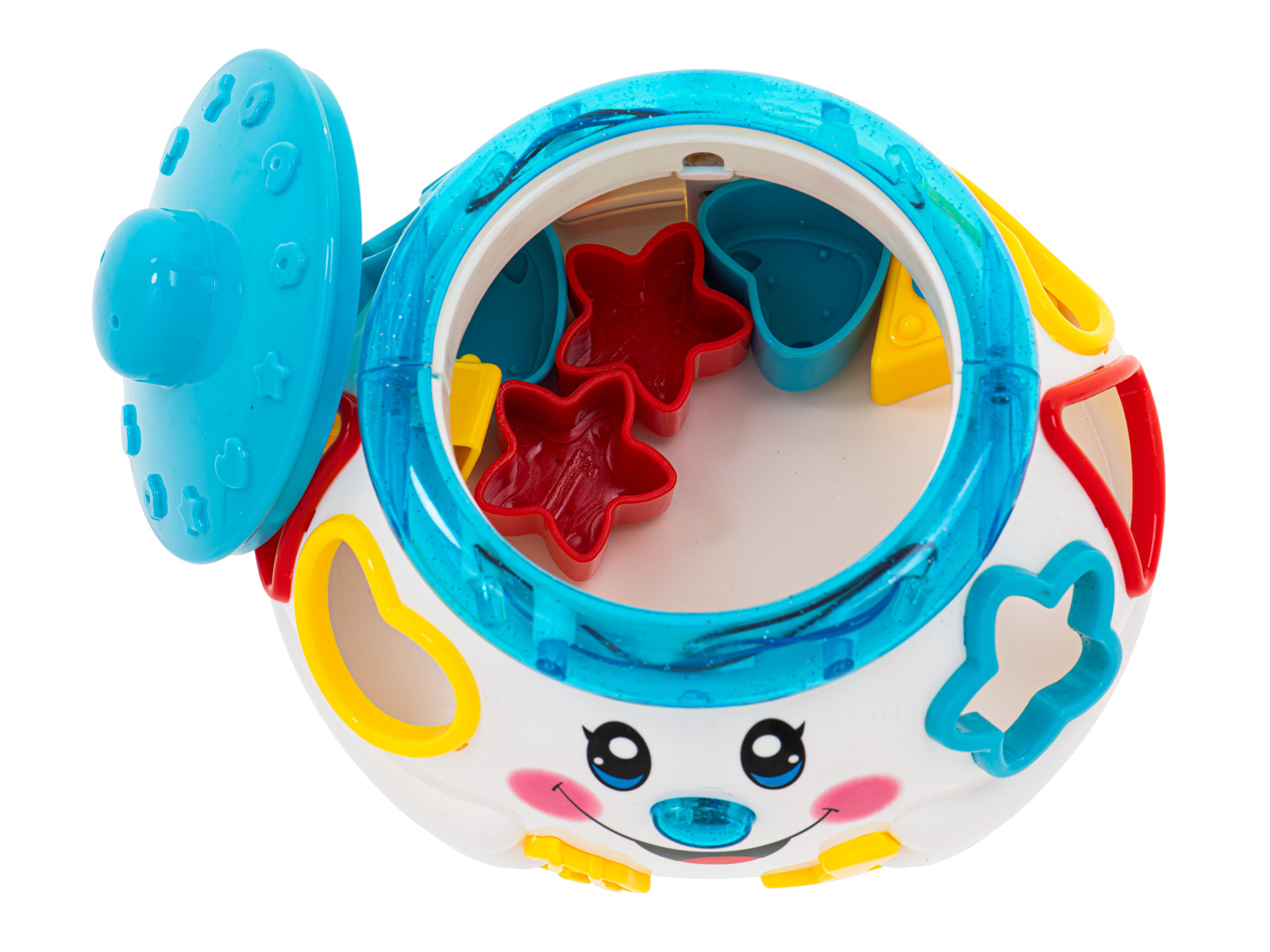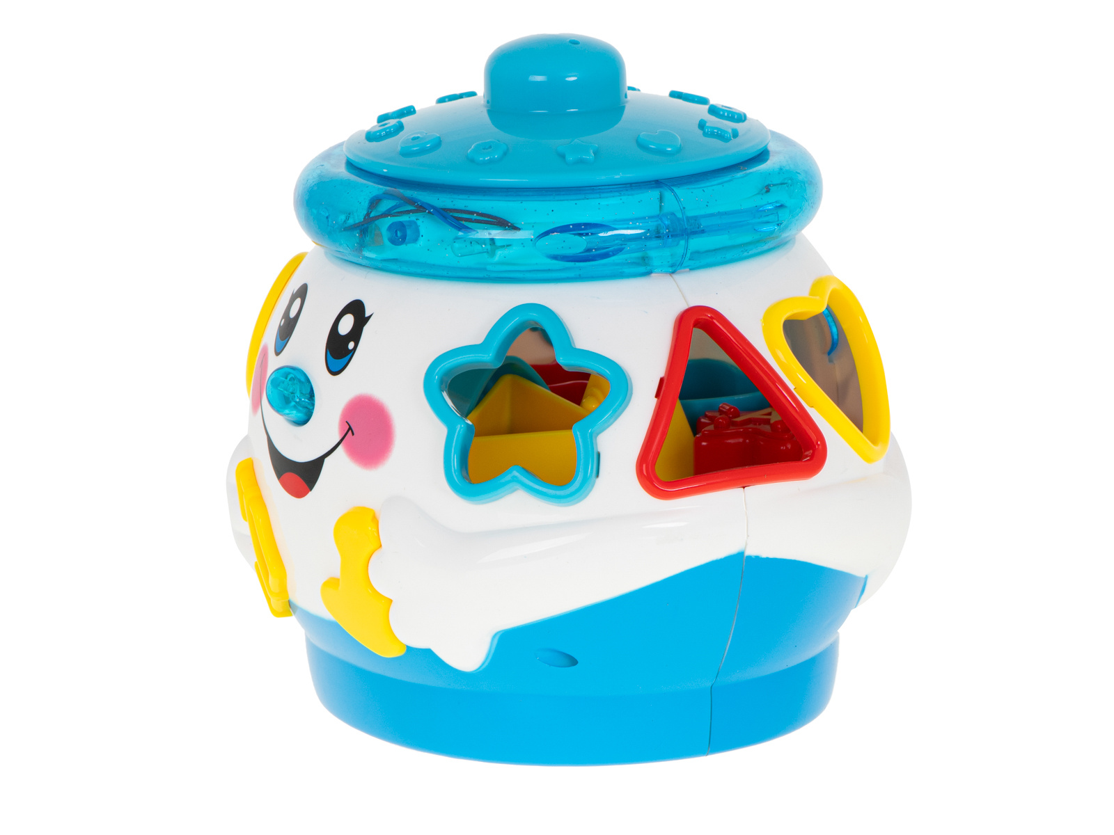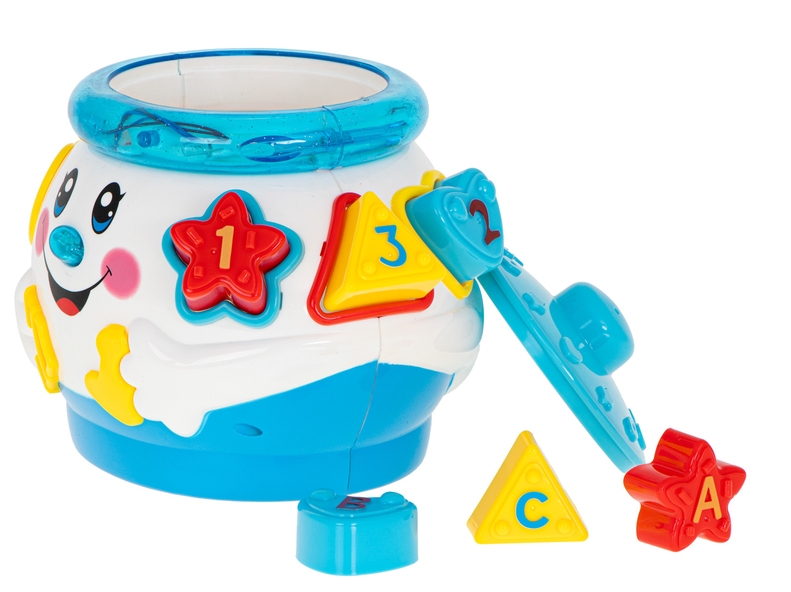 - Комплектът допълнително съдържа 6 кубчета с различни форми, които детето трябва да постави в съответните отвори.