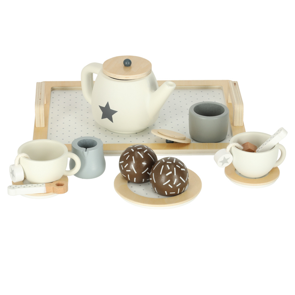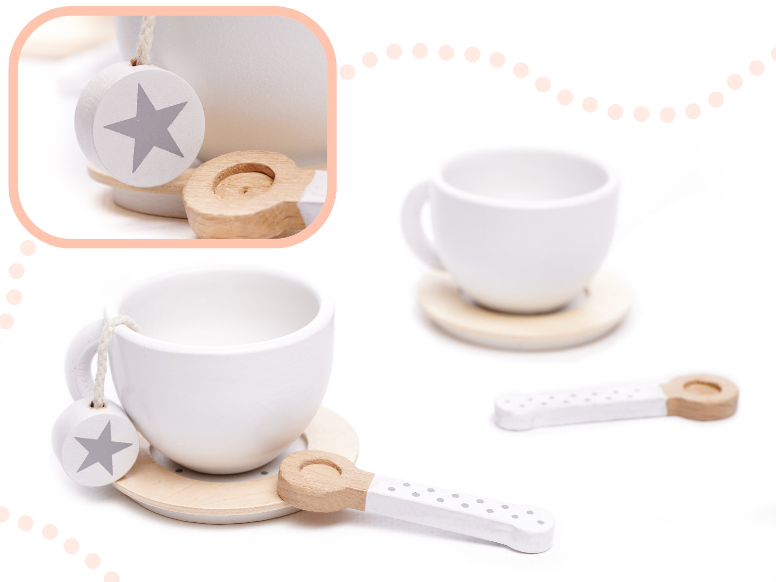 Сензационният комплект за чай е практично допълнение към всеки дом. След като свършите задълженията си, можете да седнете с приятелите си или с куклата си на чаша хубав чай и да поговорите за това, което всеки е преживял днес. Комплектът е изработен от дърво и всъщност имитира истински сервиз за чай.