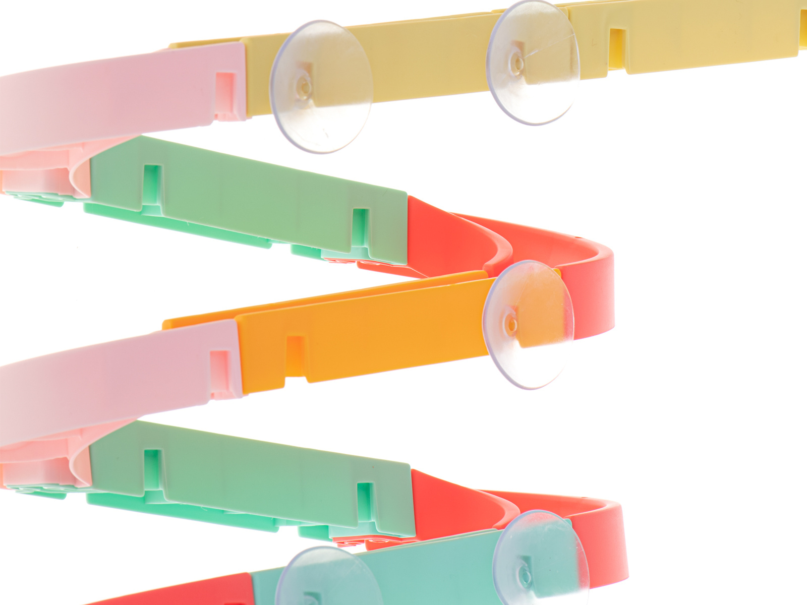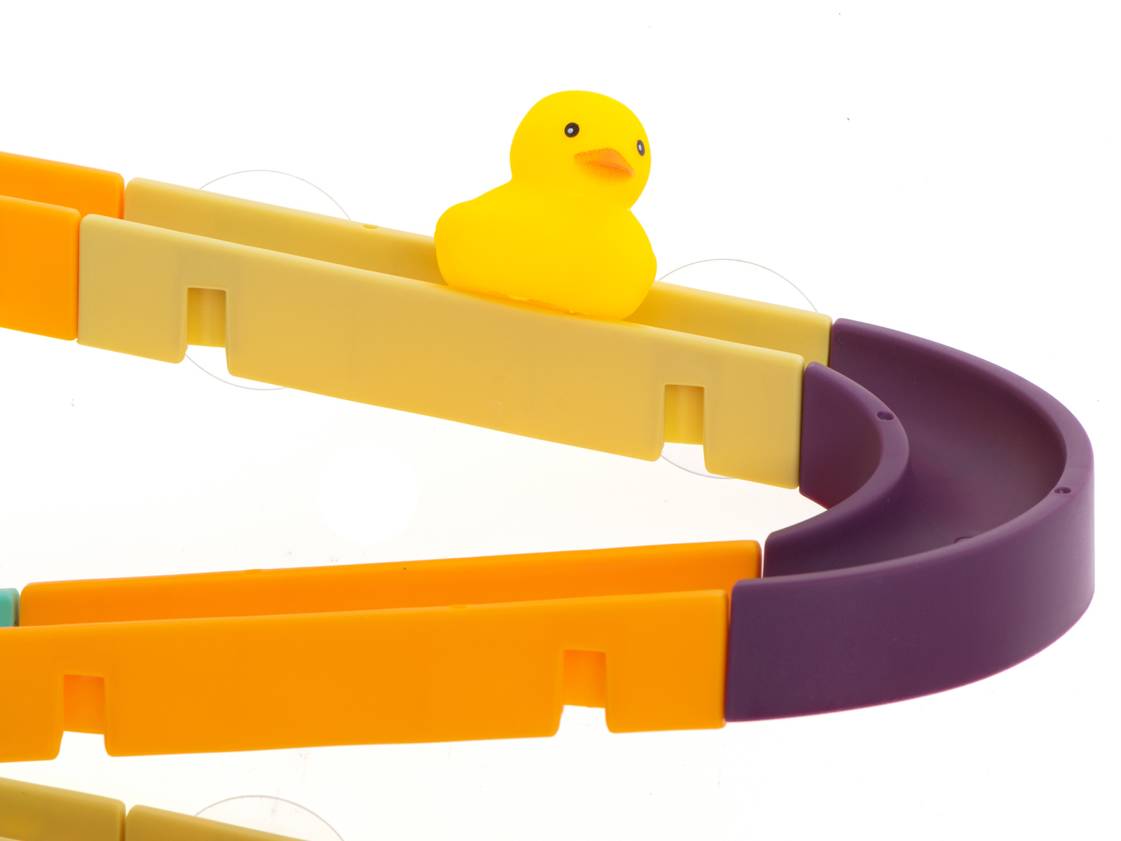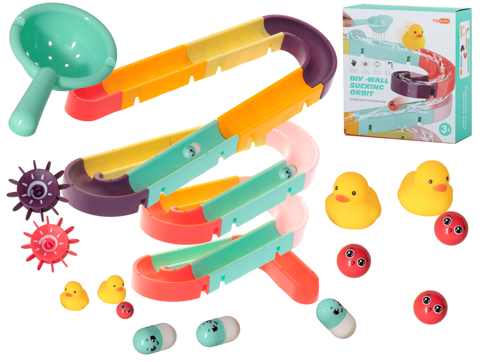 Играчката включва вендузи, които улесняват прикрепването на пистата към плочките или ваната.