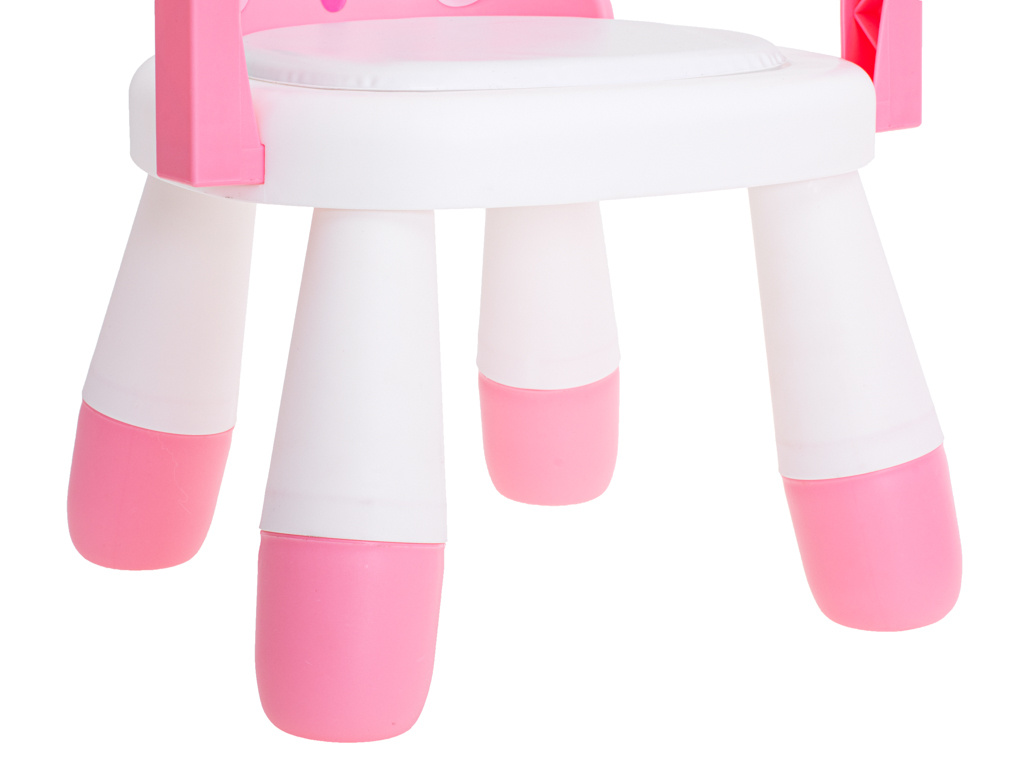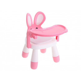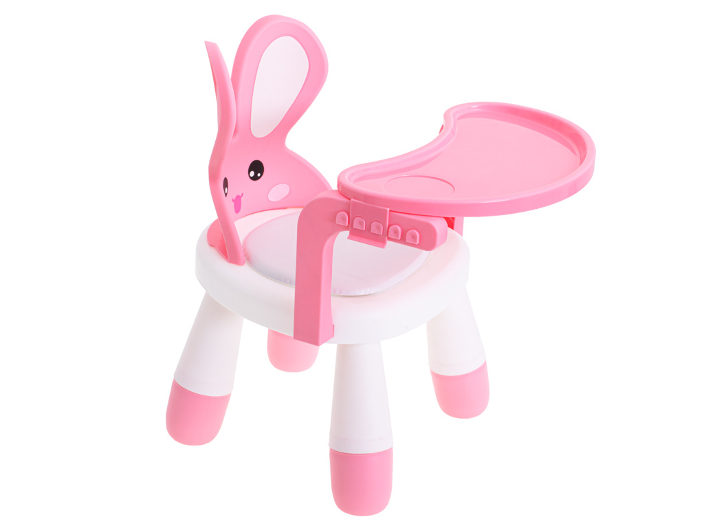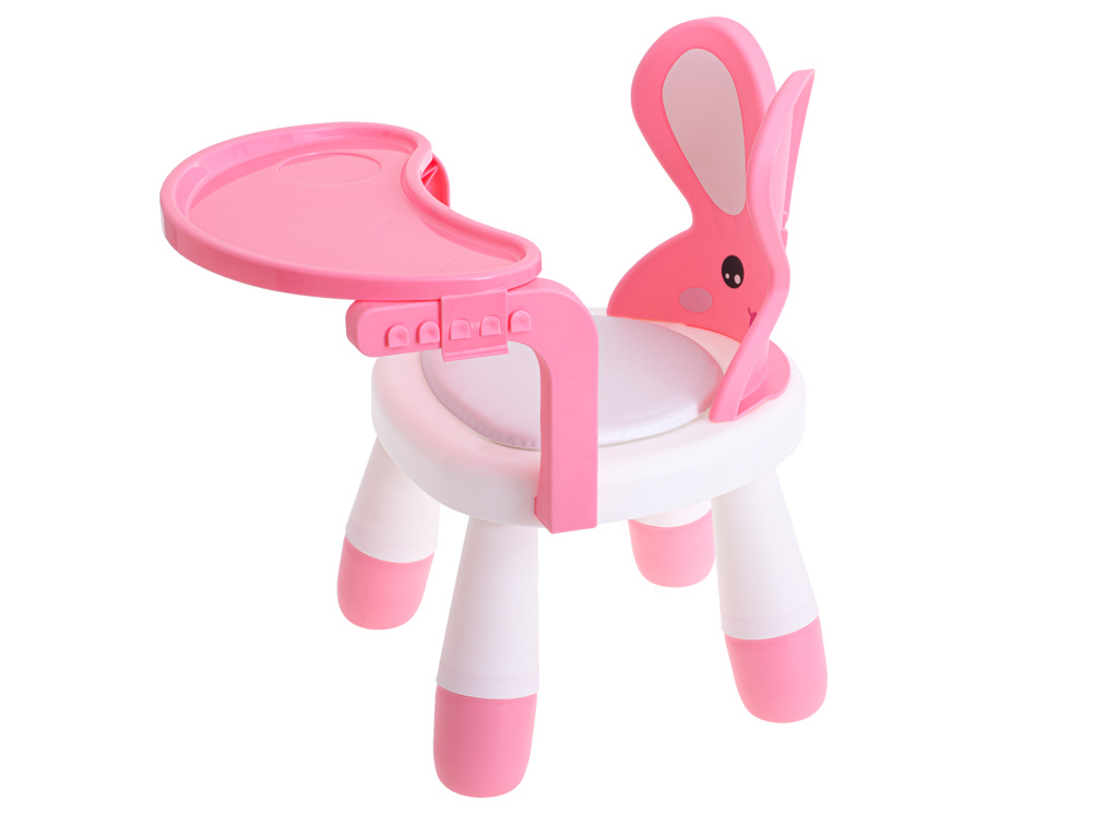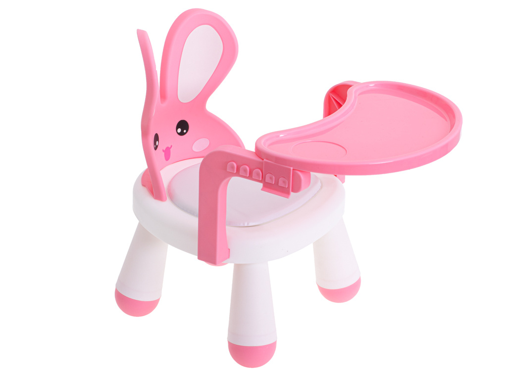 Модерният дизайн привлича вниманието на малчугана и го насърчава да се храни в определеното за това място. Можете да сте сигурни, че детето ви няма да иска да слезе от този стол. Ергономичната форма "принуждава" детето да заеме правилна и безопасна поза, когато се храни. Заешките уши са идеалната опора за гърба. Удобната седалка с възглавница ще осигури на детето ви комфортна почивка. Масата може да се използва успешно, когато детето ви играе и създава първите си произведения на изкуството. Тя обособява зона за игра и можете да сте сигурни, че вашето малко дете е в безопасност, докато вие трябва да вършите домакинската работа. Столът расте заедно с детето ви! Малките деца растат и се променят много бързо. Двустепенното регулиране на височината позволява на стола да се адаптира към нуждите на растящото дете. За да увеличите височината на стола, просто заменете подложките за крака с по-високи. Освен това масата може да се демонтира напълно, така че детето да седи само на стола.Комплектът е изработен от висококачествена пластмаса, която гарантира дълъг експлоатационен живот. Стабилната конструкция и удобната седалка ще зарадват както родителите, така и малките деца. Цялата система е лесна за почистване. Столът може да се избърше с влажна кърпа или да се измие под течаща вода в случай на силно замърсяване. Столът може лесно да се сгъва и е лек, така че можете да го вземете със себе си на гости при баба или на почивка. успешно ще замени големите и тежки столове за хранене.