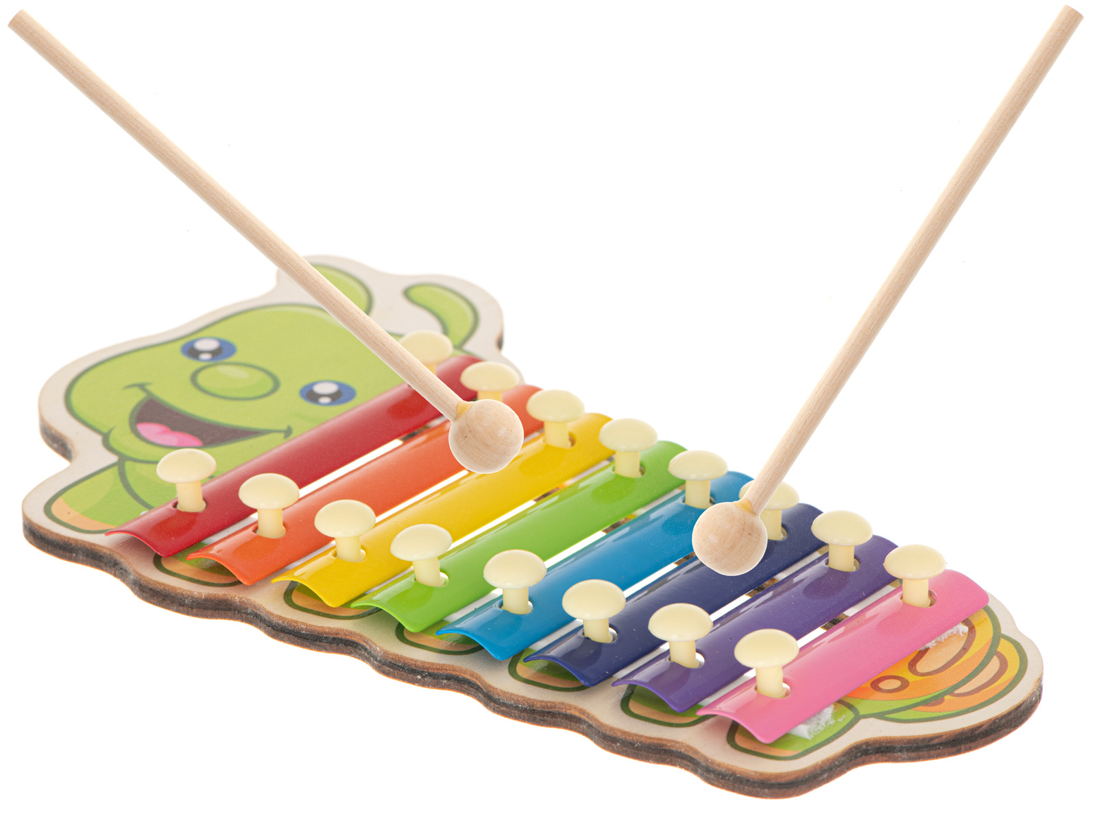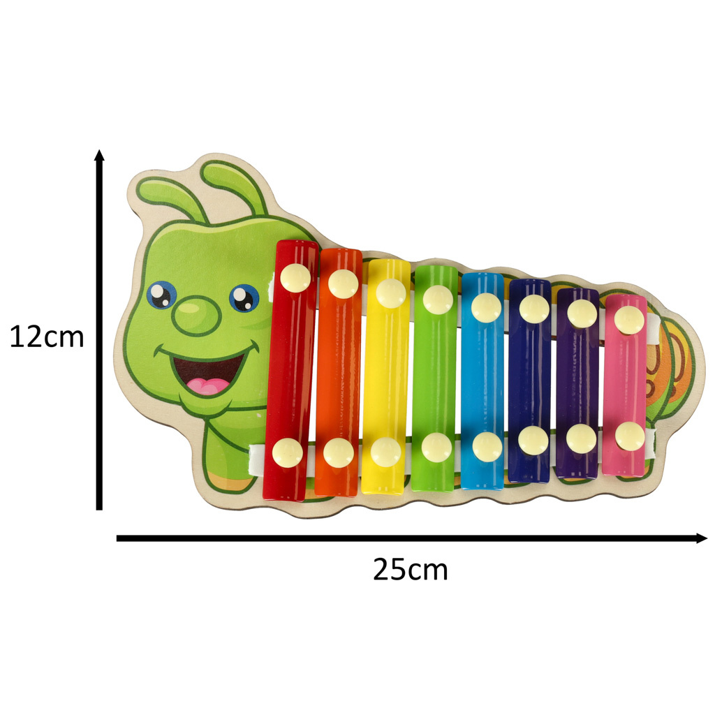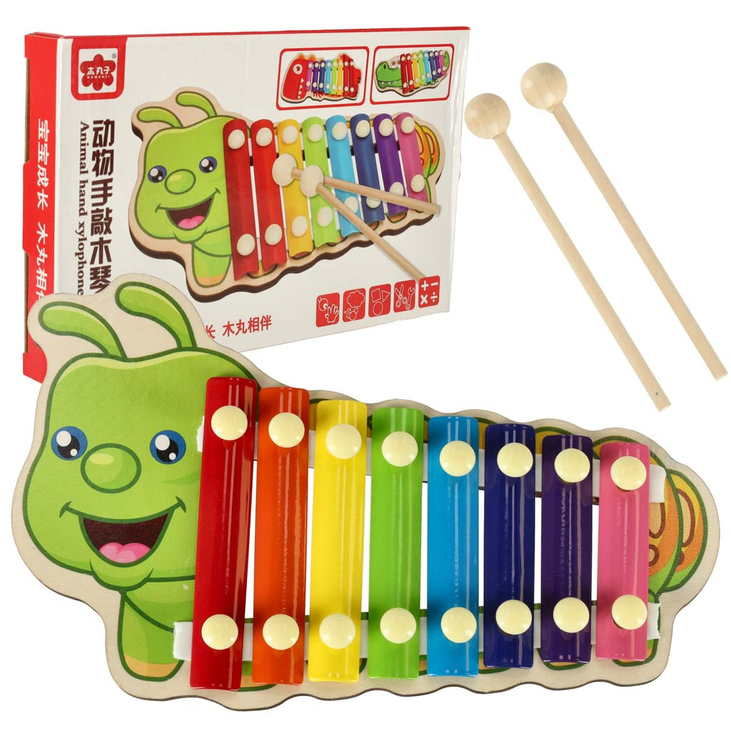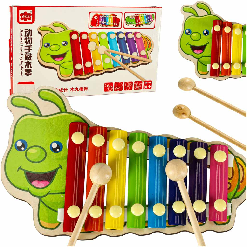 Цветният дървен ксилофон е идеален за начинаещи музиканти. Ксилофонът е изработен от осем метални пластини в различни цветове. Играта с инструмента учи децата да разпознават звуци и подобрява усещането им за ритъм. Освен това стимулира креативността и творческото мислене, учи на търпение и подобрява паметта и концентрацията. Осем различни звука ви позволяват да свирите прости мелодии.