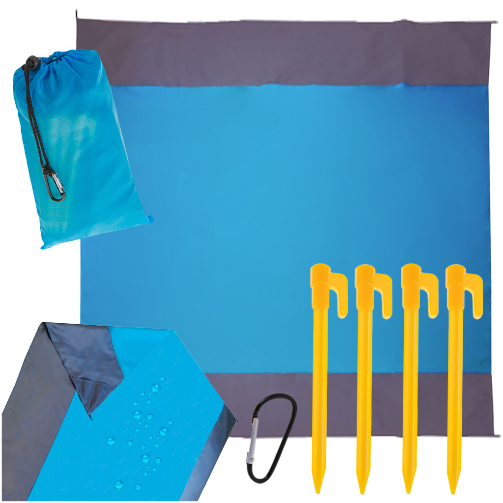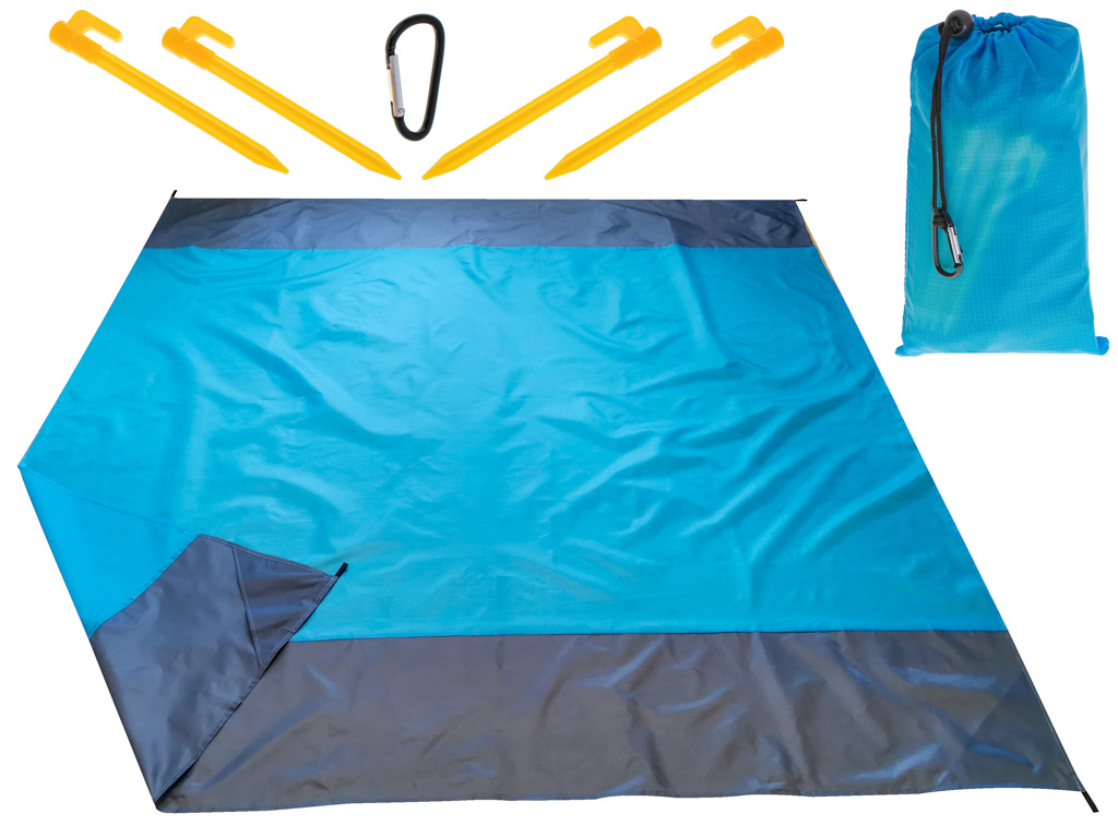 Никой не обича, когато се вдигне вятър, развява ъглите на одеялото и разпръсква пясък по всичко, което е върху него. Постоянното оправяне на завивката също не е много удобно. Всичко при това одеяло е внимателно обмислено - включени в комплекта са 4 колчета, с които можете лесно да закрепите одеялото към земята!