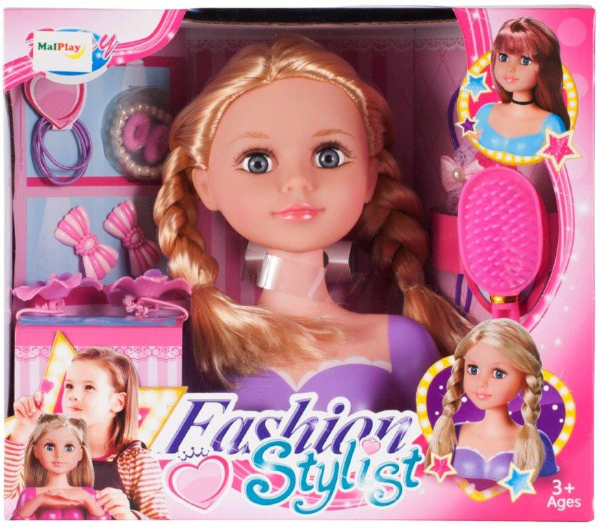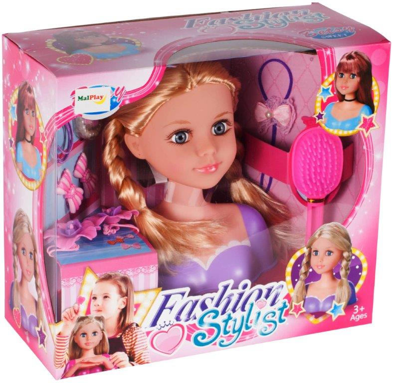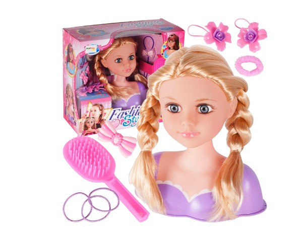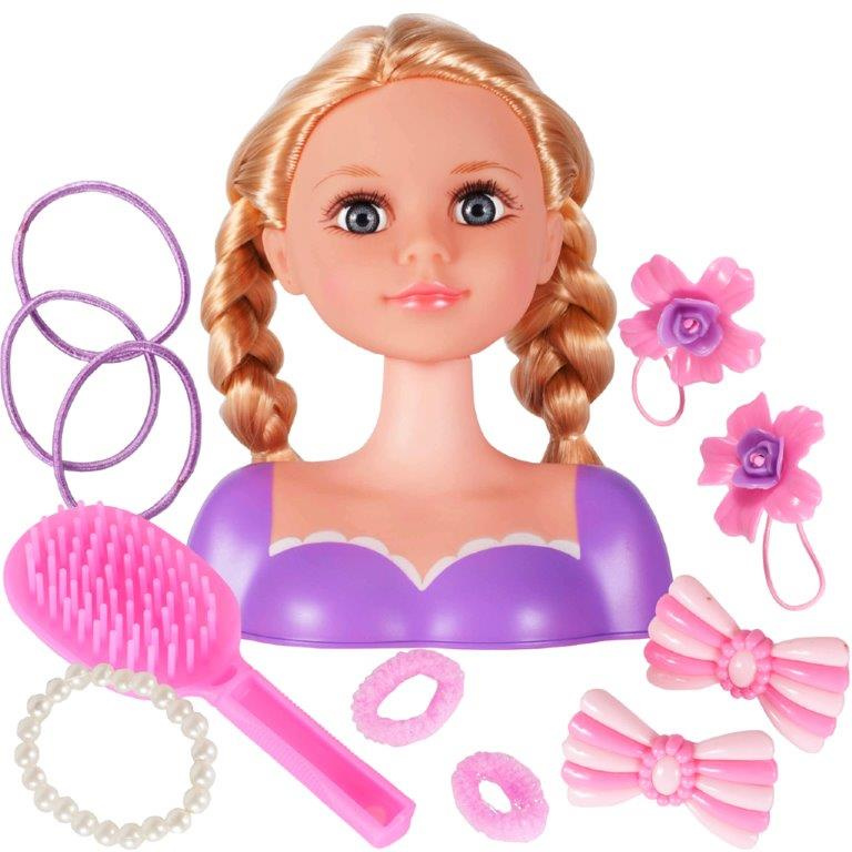 Супер глава за оформяне и разресване. Всички момичета ще го харесат. Благодарение на разнообразието от аксесоари всеки малък стилист може да създаде голям брой прически. Включва: бюст на кукла, гумени ленти, четка, гривна, щипки. Размери. кукли: 20x17,5x9cm.Цялото описание