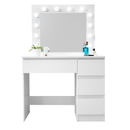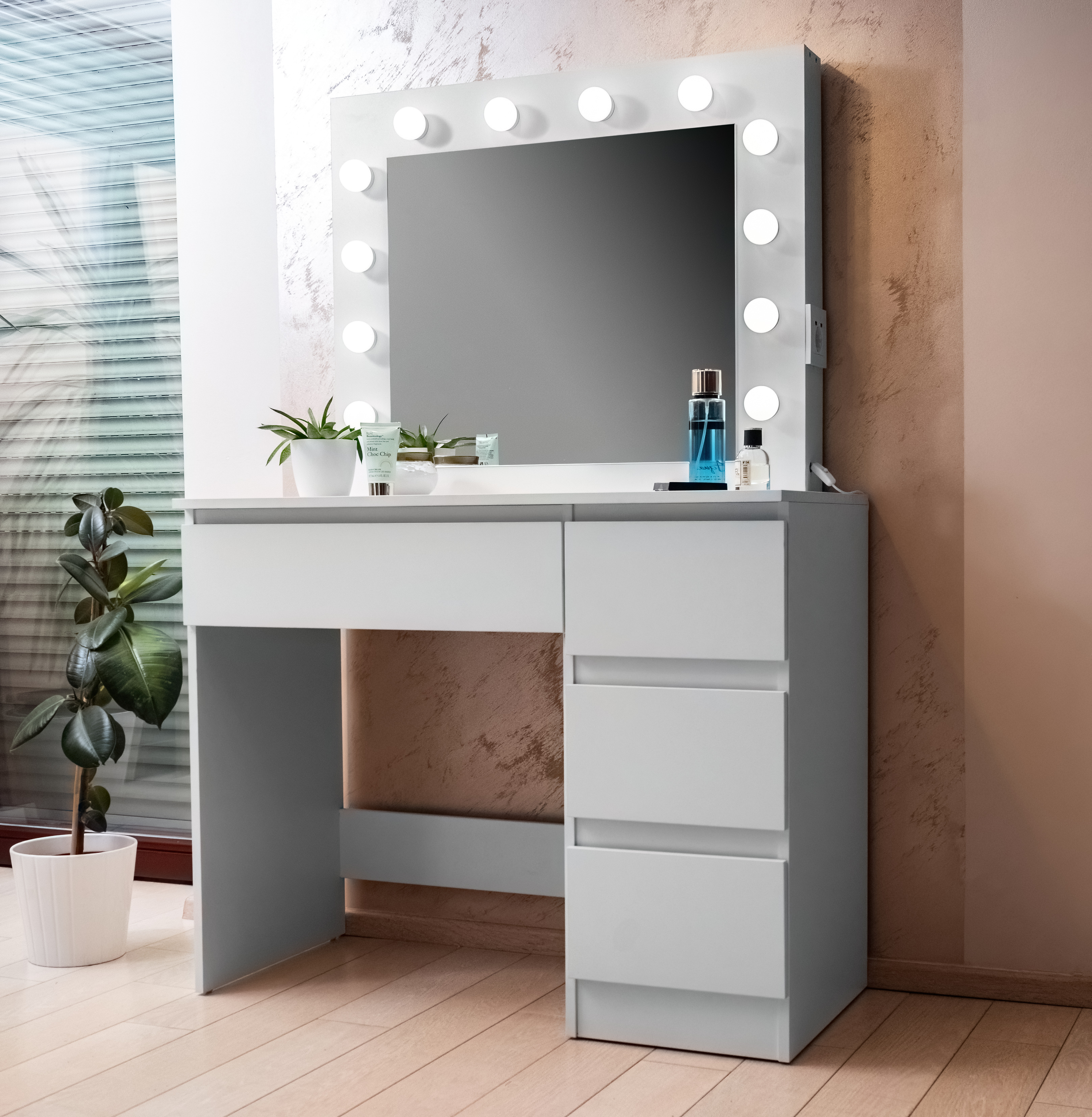 На огледалото има 12 LED крушки, така че можете удобно да се гримирате дори при лоша естествена светлина. Отстрани на огледалото има електрически контакт, например за сешоар, преса за коса и USB връзки за зареждане на мобилни устройства.