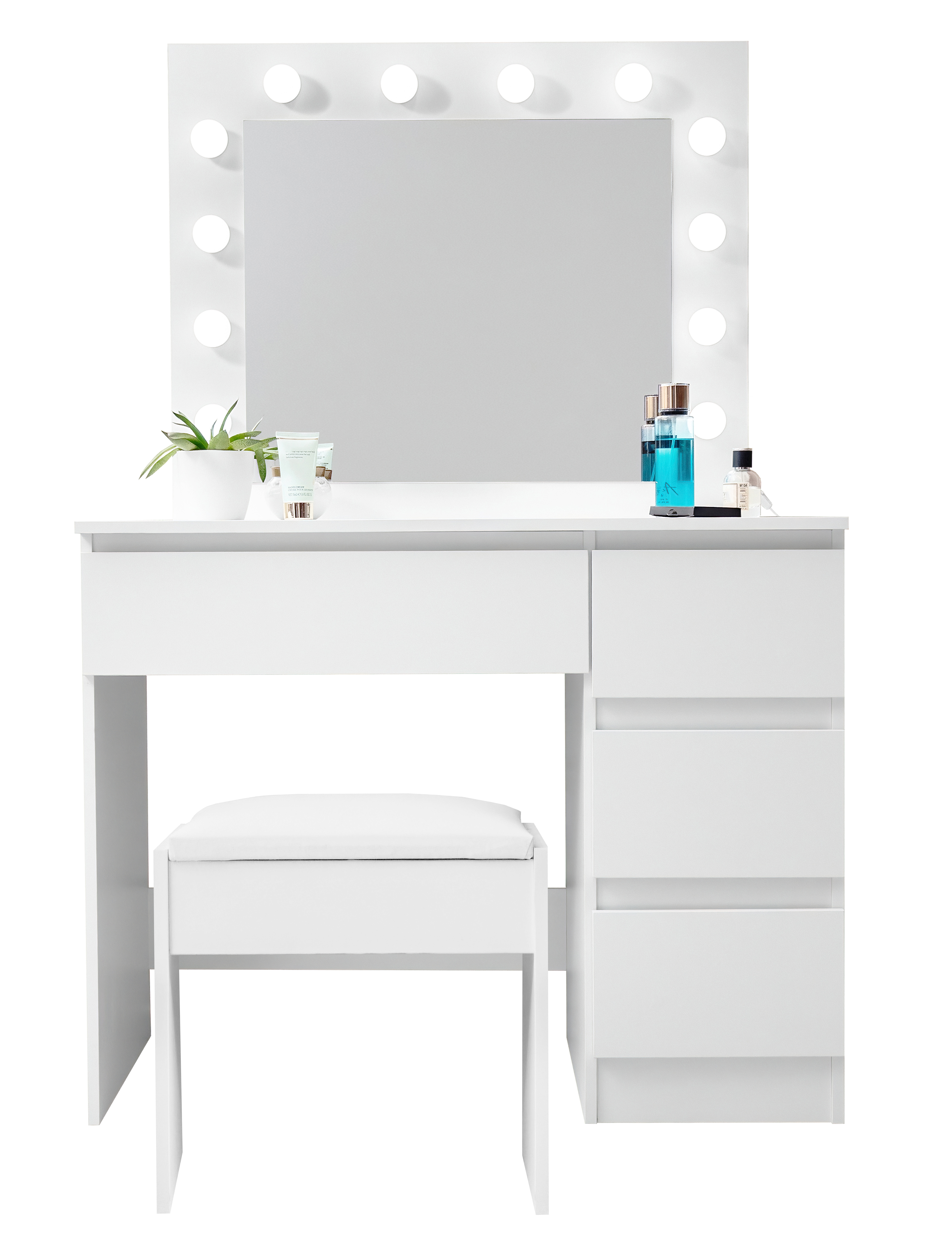 На огледалото има 12 LED крушки, така че можете удобно да се гримирате дори при лоша естествена светлина.Табуретката е изработена от висококачествена мека пяна, на която може да се седи с часове.