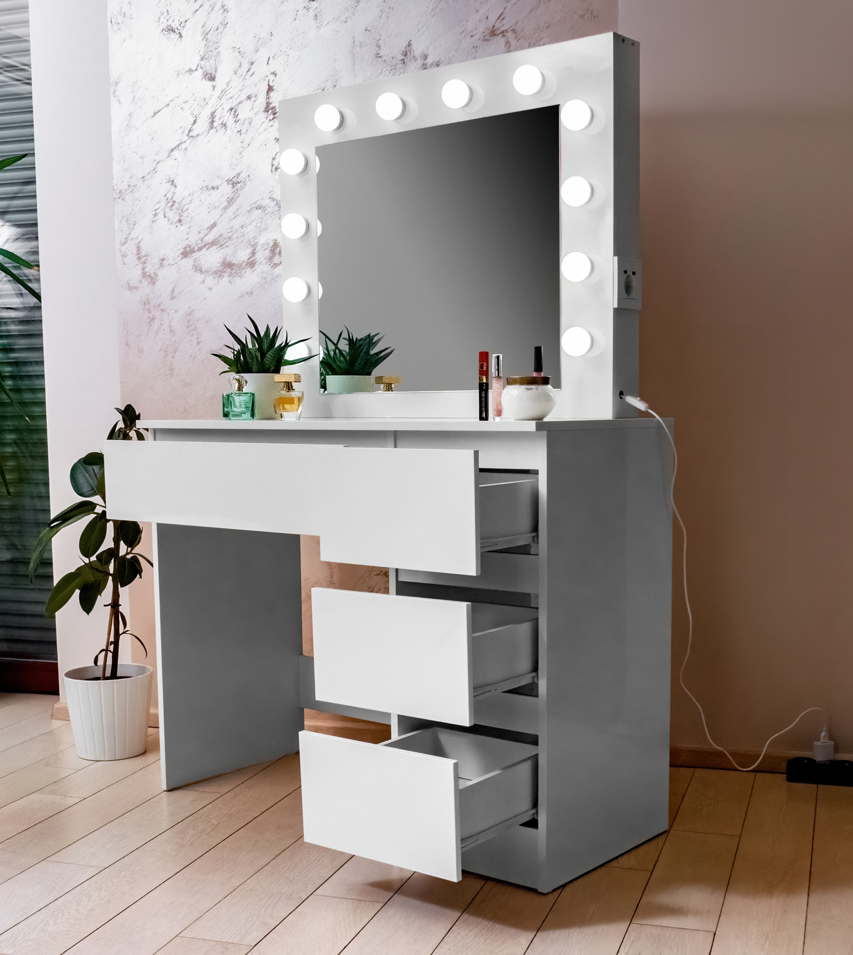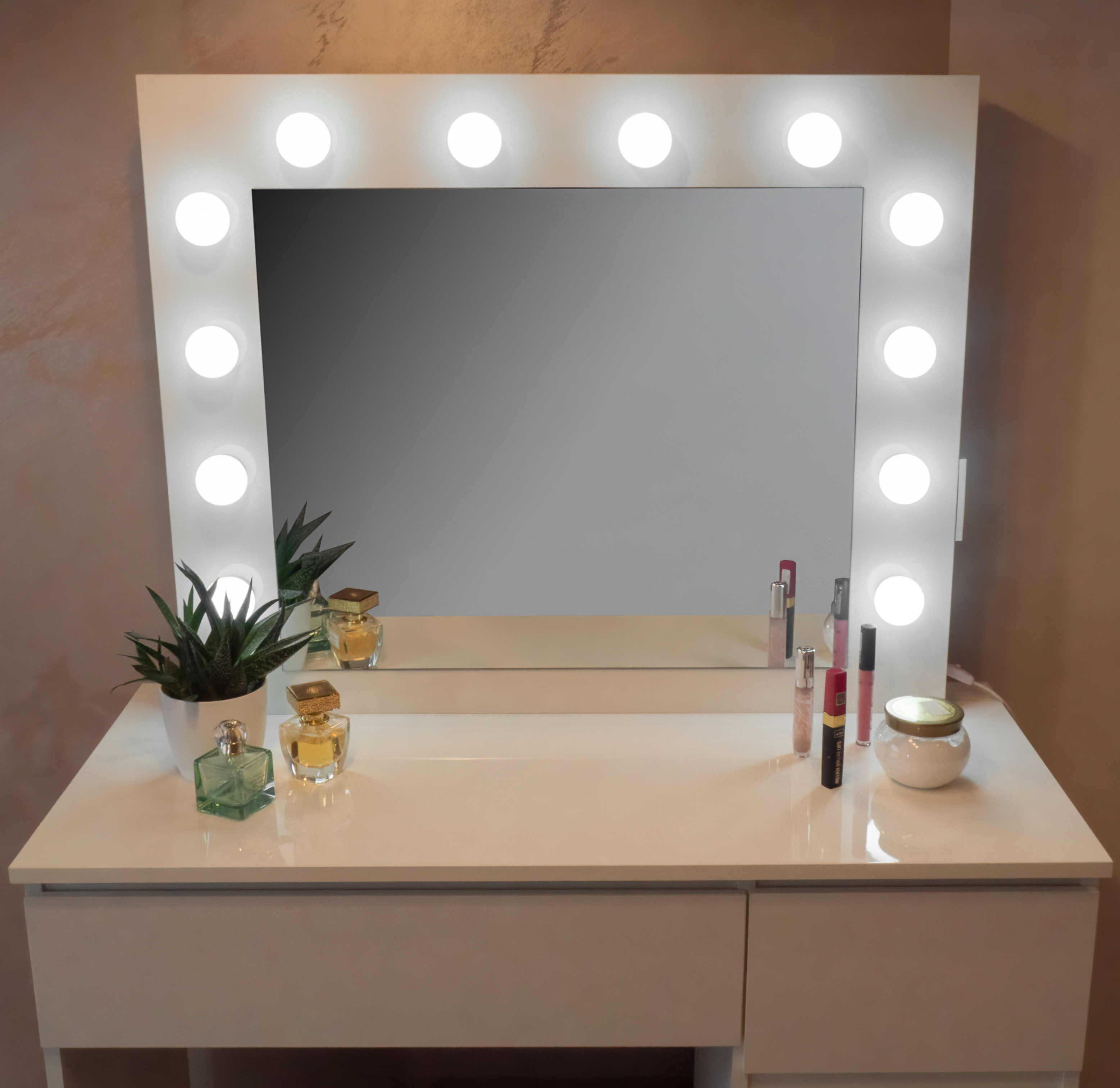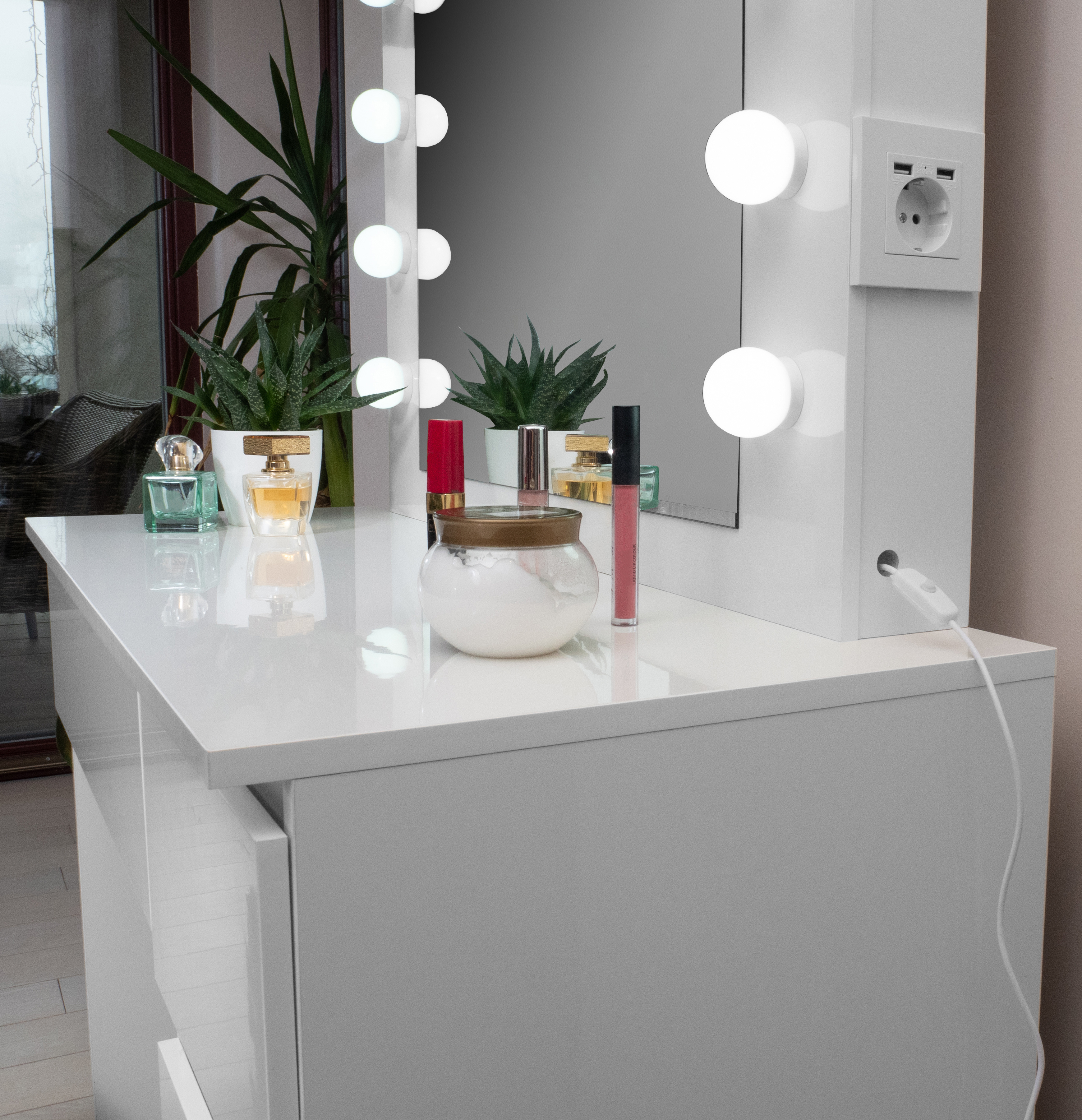 На огледалото има 12 LED крушки, така че можете удобно да се гримирате дори при лоша естествена светлина. Отстрани на огледалото има електрически контакт, например за сешоар, преса за коса и USB връзки за зареждане на мобилни устройства.