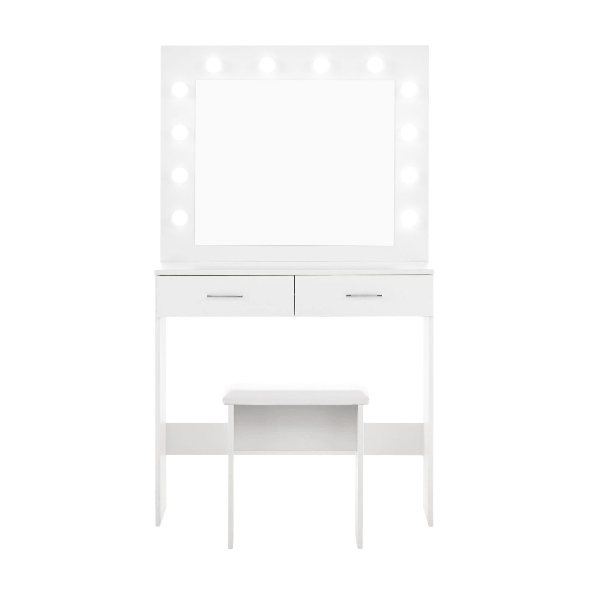 На огледалото има 12 LED крушки, така че можете удобно да се гримирате дори при лоша естествена светлина.Табуретката е изработена от висококачествена мека пяна, на която може да се седи с часове.