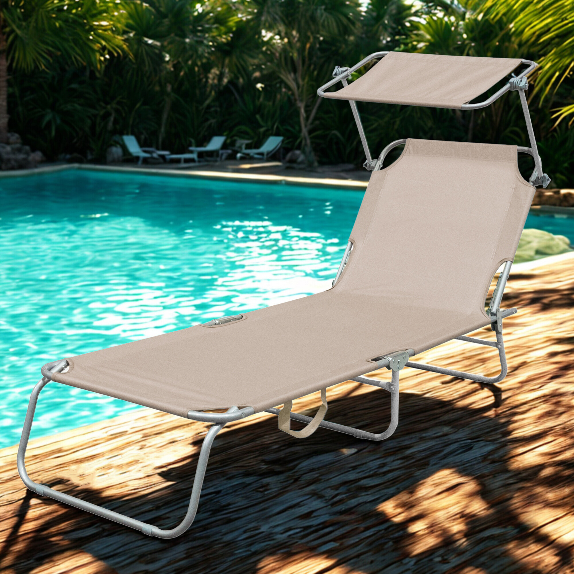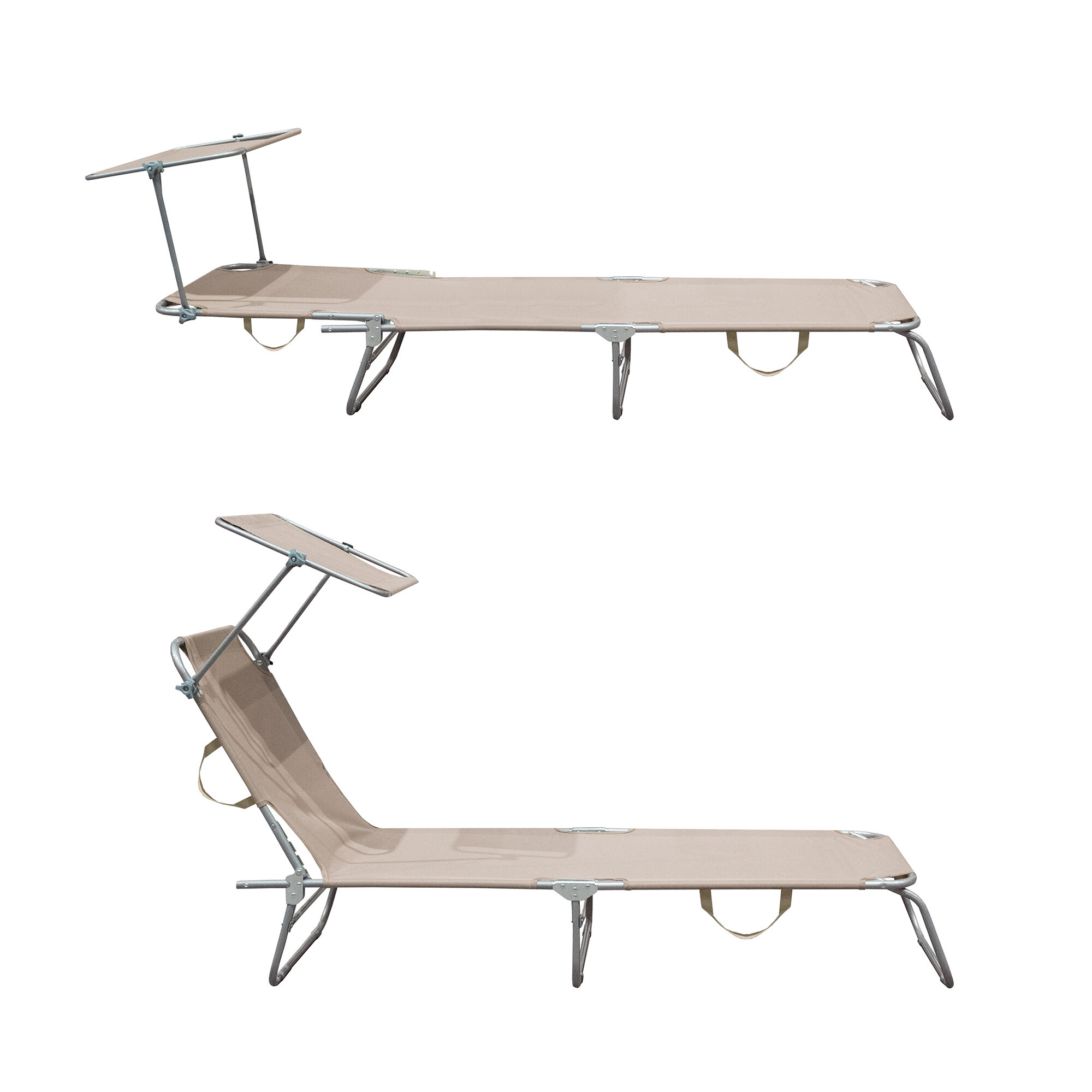 Част от шезлонга е подвижен сенник, който може да се регулира по желание и предпазва лицето от силното слънце.Облегалката на шезлонга може да се регулира в 4 различни позиции.