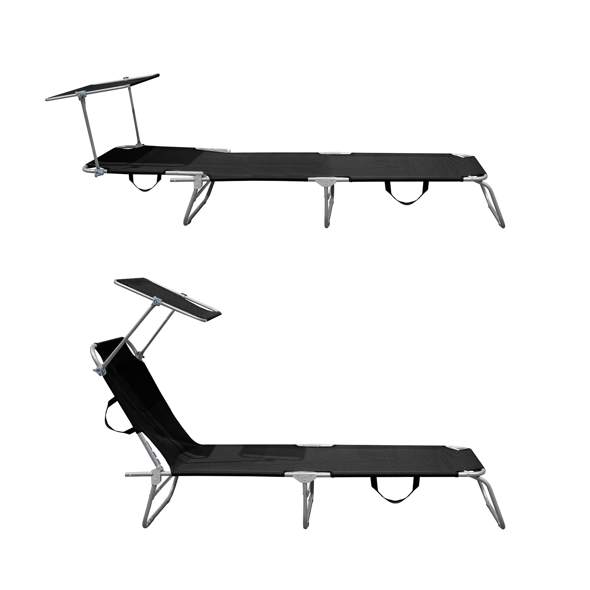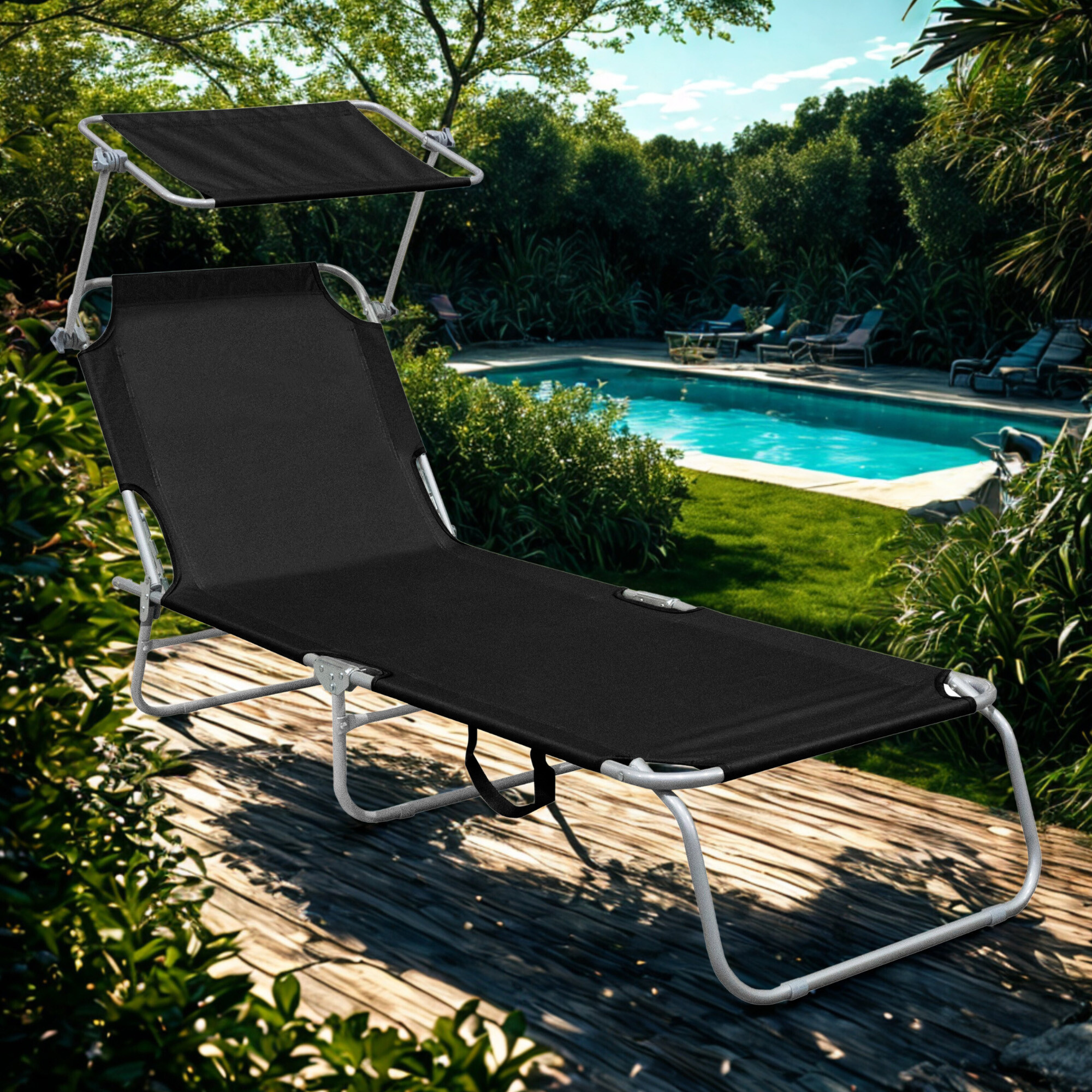 Част от шезлонга е подвижен сенник, който може да се регулира по желание и предпазва лицето от силното слънце.Облегалката на шезлонга може да се регулира в 4 различни позиции.
