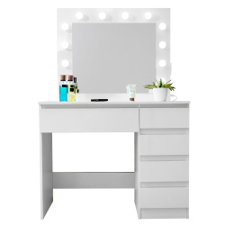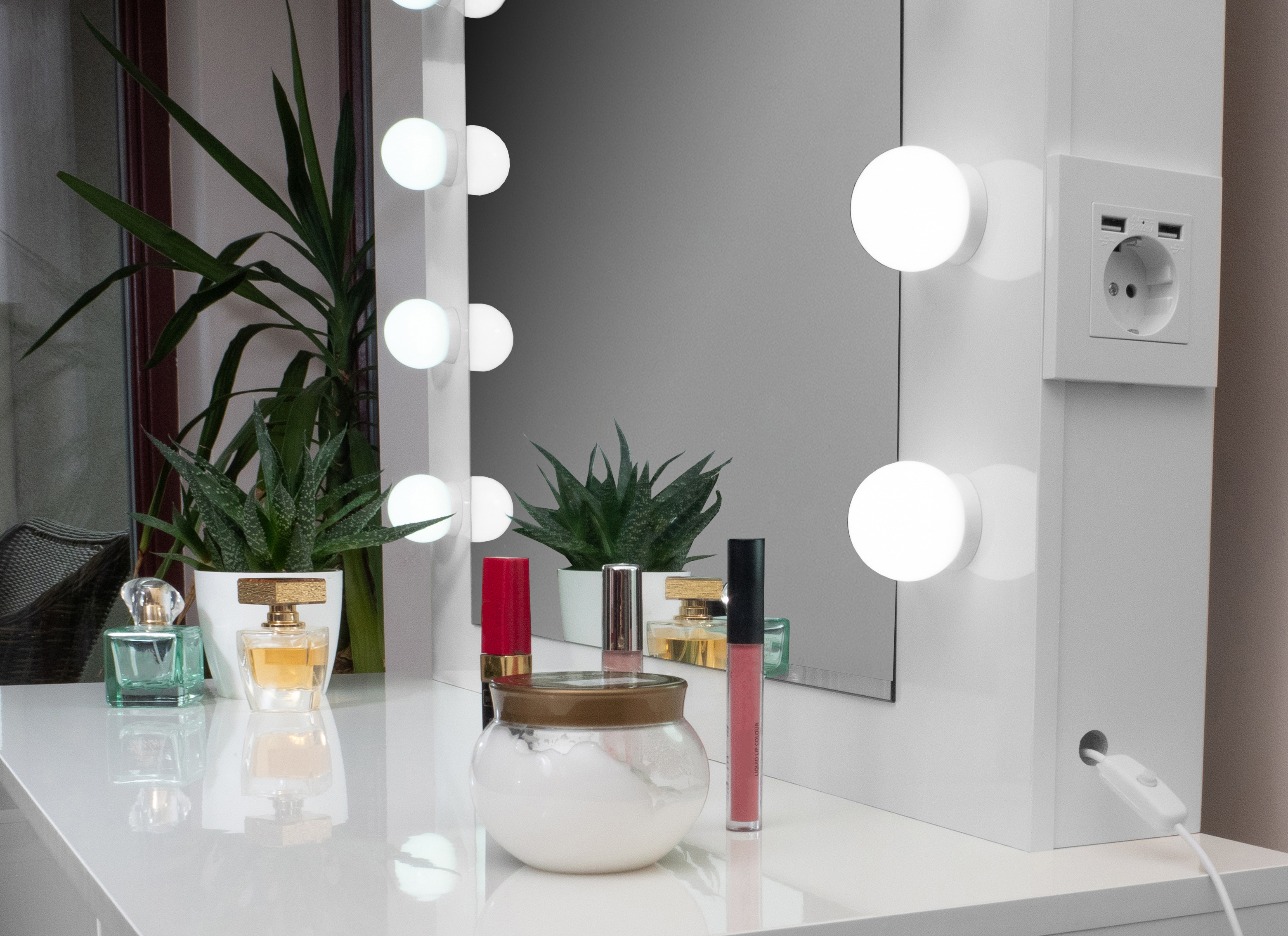 На огледалото има 12 LED крушки, така че можете удобно да се гримирате дори при лоша естествена светлина. Отстрани на огледалото има електрически контакт, например за сешоар, преса за коса и USB връзки за зареждане на мобилни устройства.