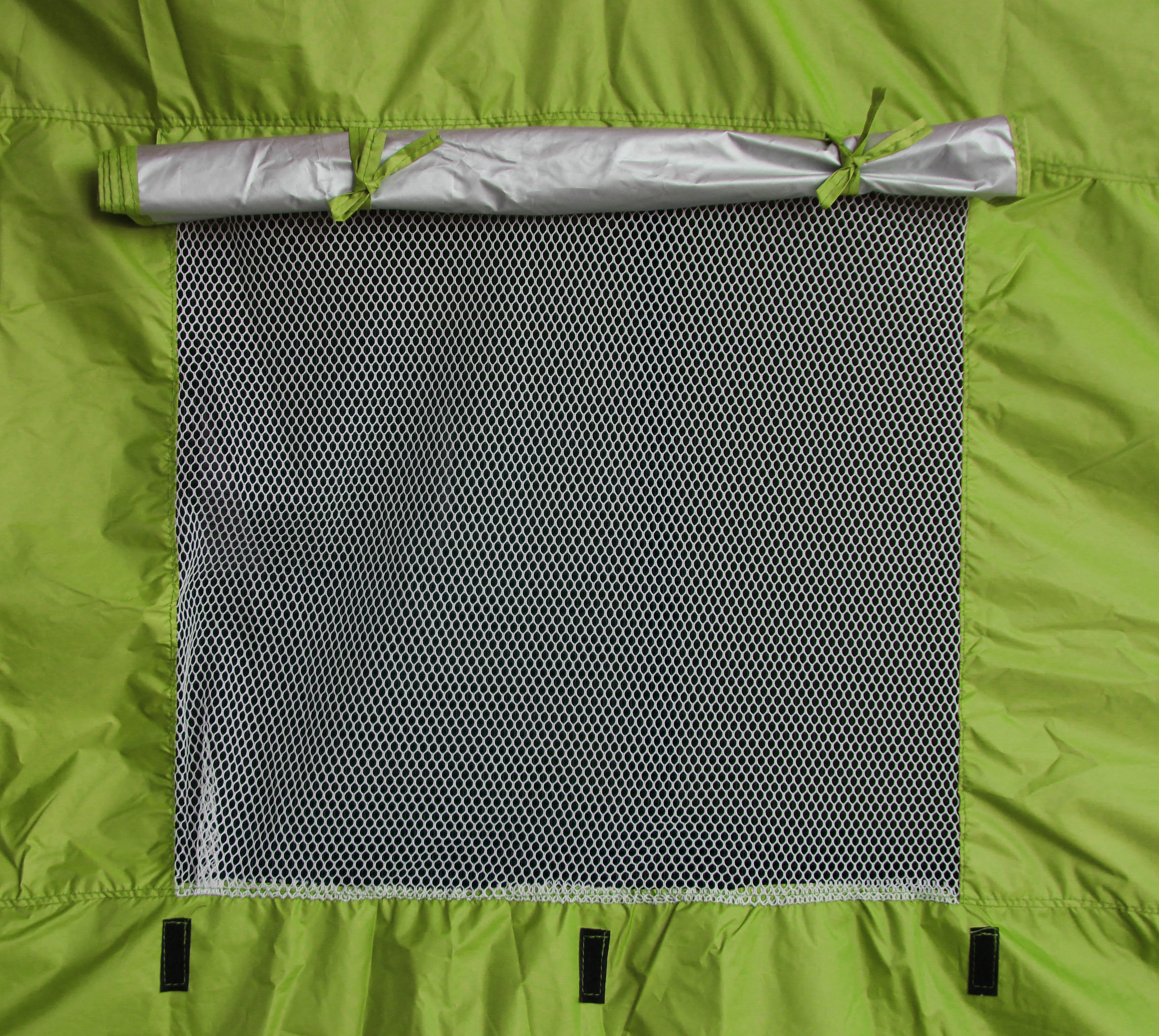 Шатрата е оборудвана с вентилационни отвори, снабдени с регулируеми щори и мрежи против насекоми.