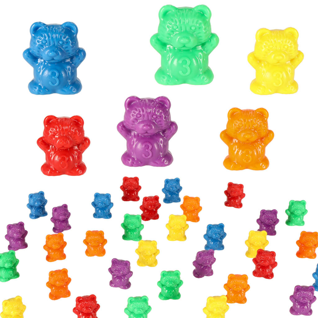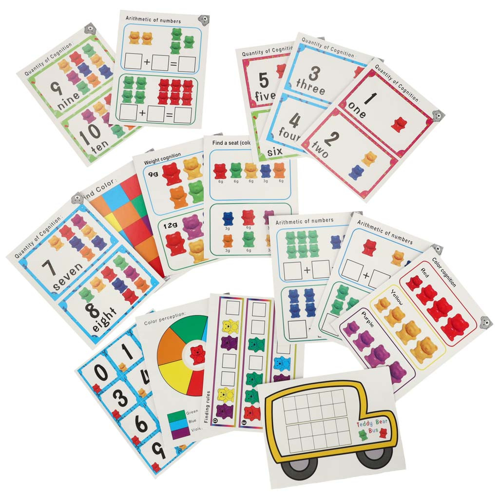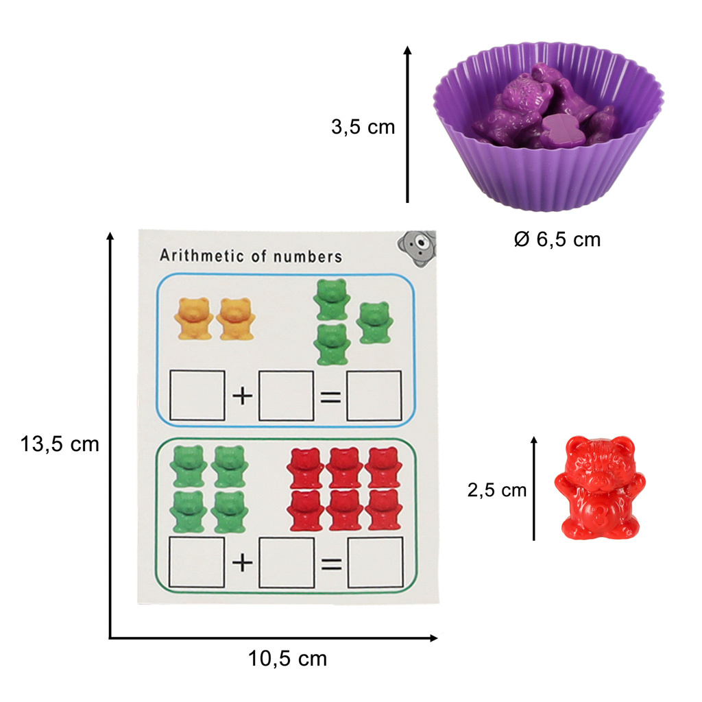 Комплектът съдържа 36 мечета за броене в 6 цвята. Комплектът развива разпознаването на цветове и числа.