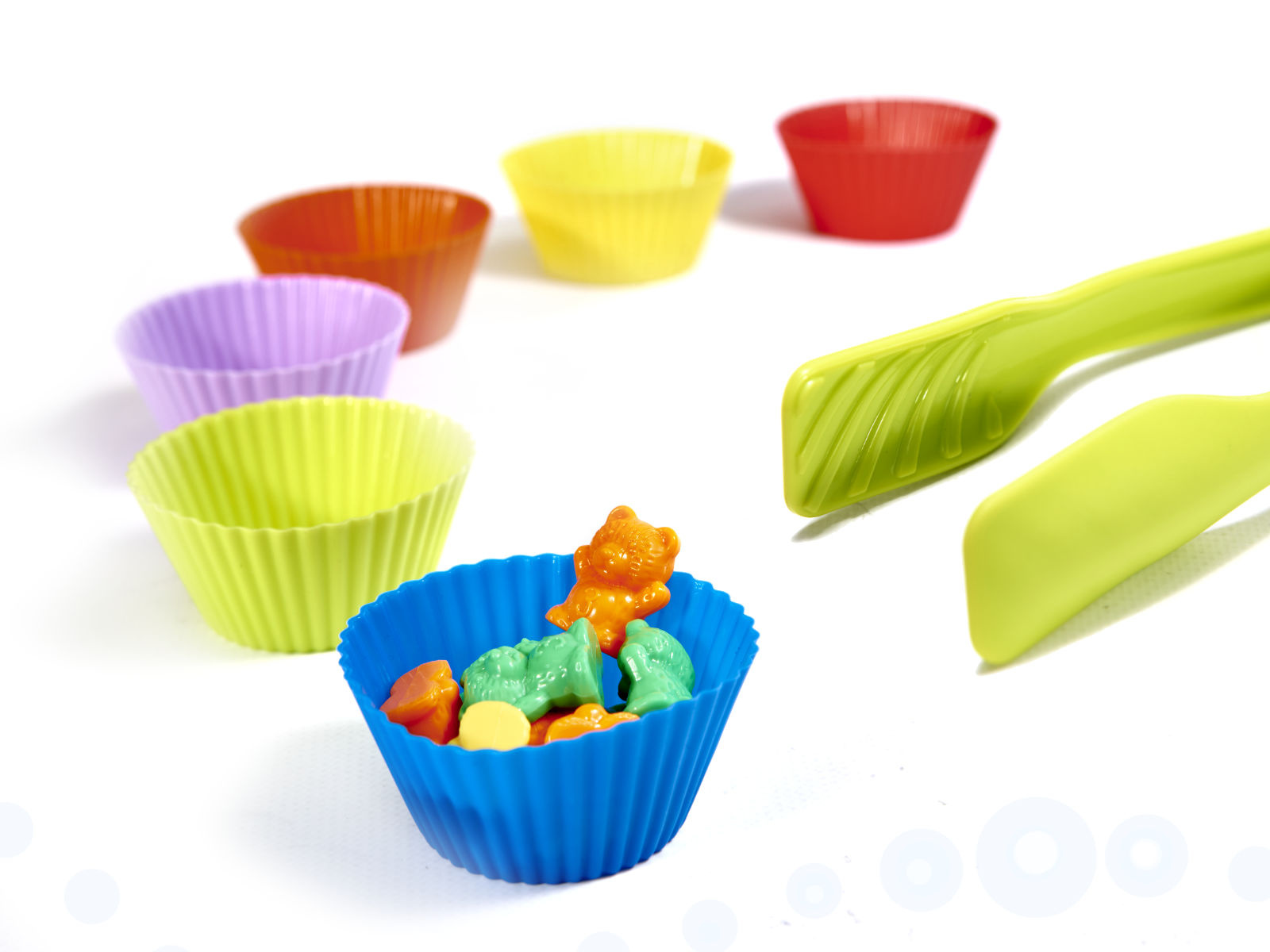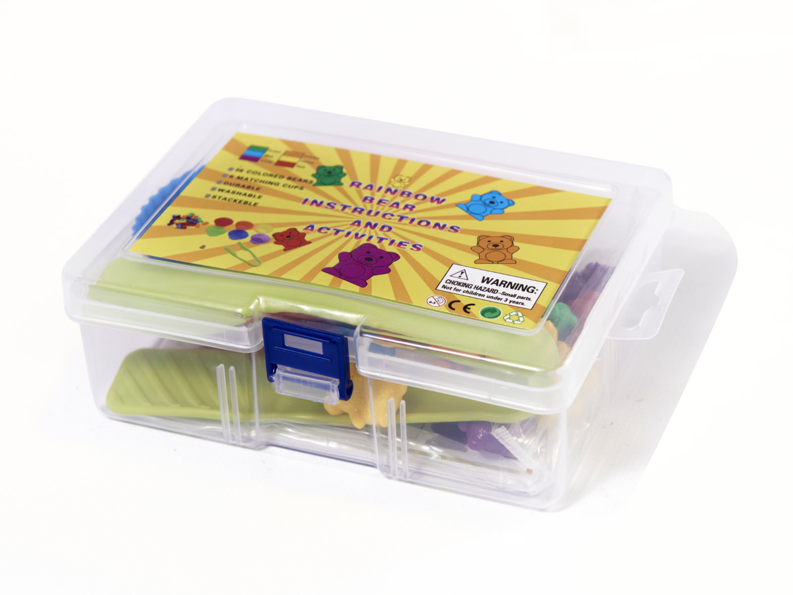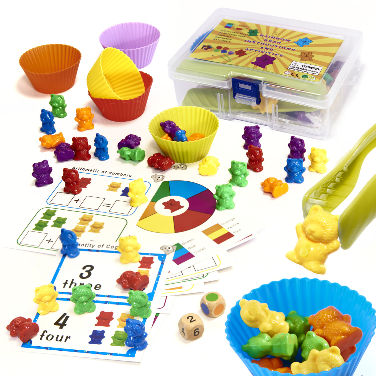 Комплектът съдържа 36 мечета за броене в 6 цвята. Комплектът развива разпознаването на цветове и числа.