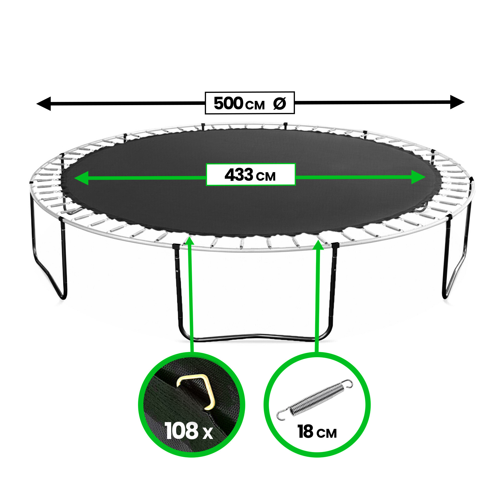 За повърхностите за отскок винаги посочваме общия диаметър на батута, а не диаметъра на самата повърхност за отскок!