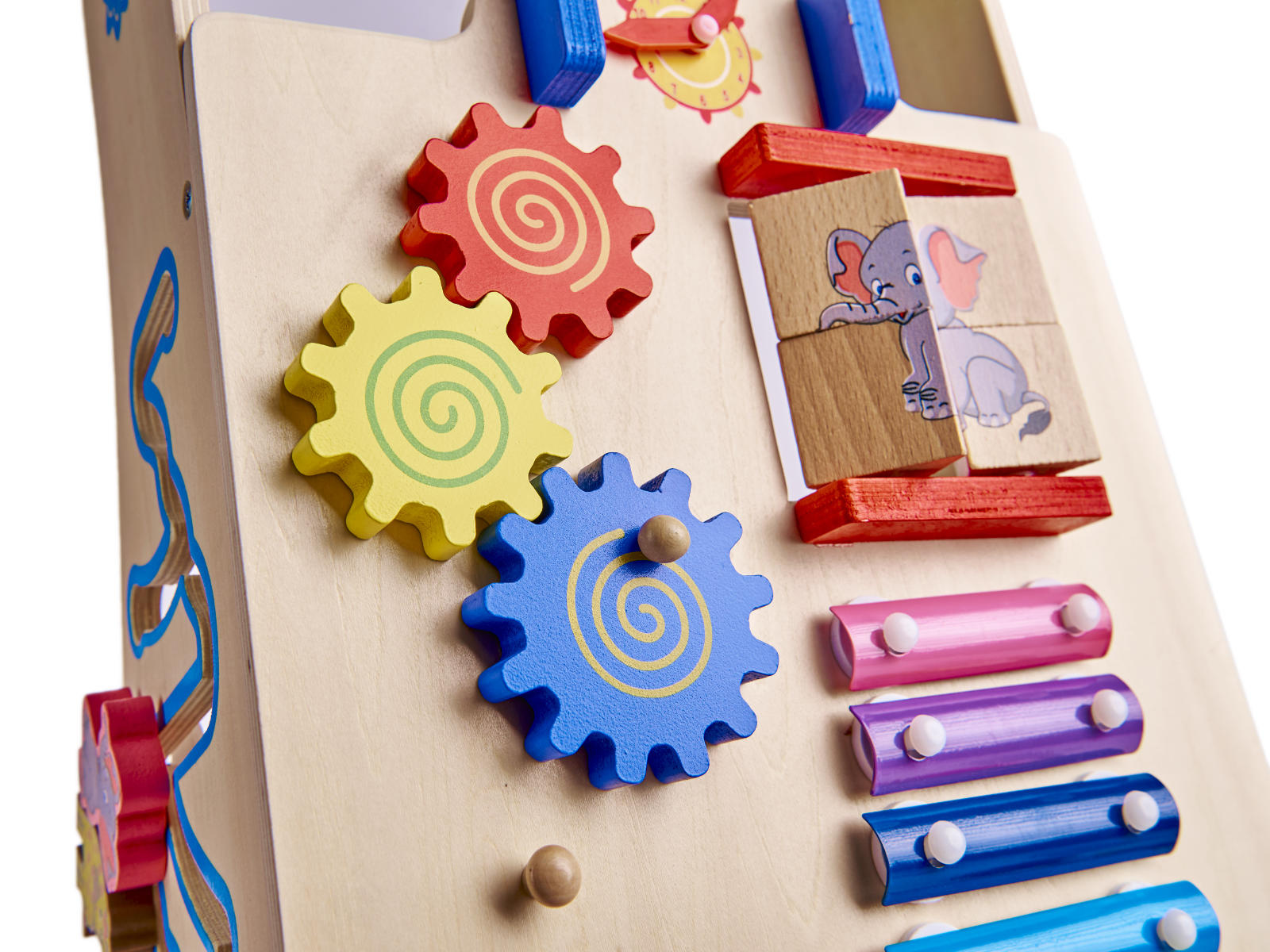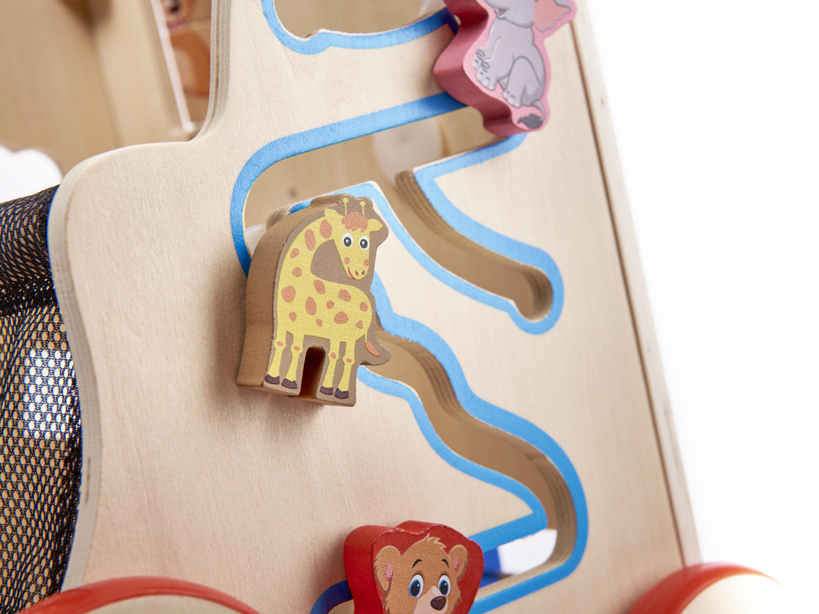 Цветните елементи привличат окото и малките ръчички с цветовете си. Благодарение на неутралната дървена основа играчката не предизвиква прекомерни дразнения у детето.