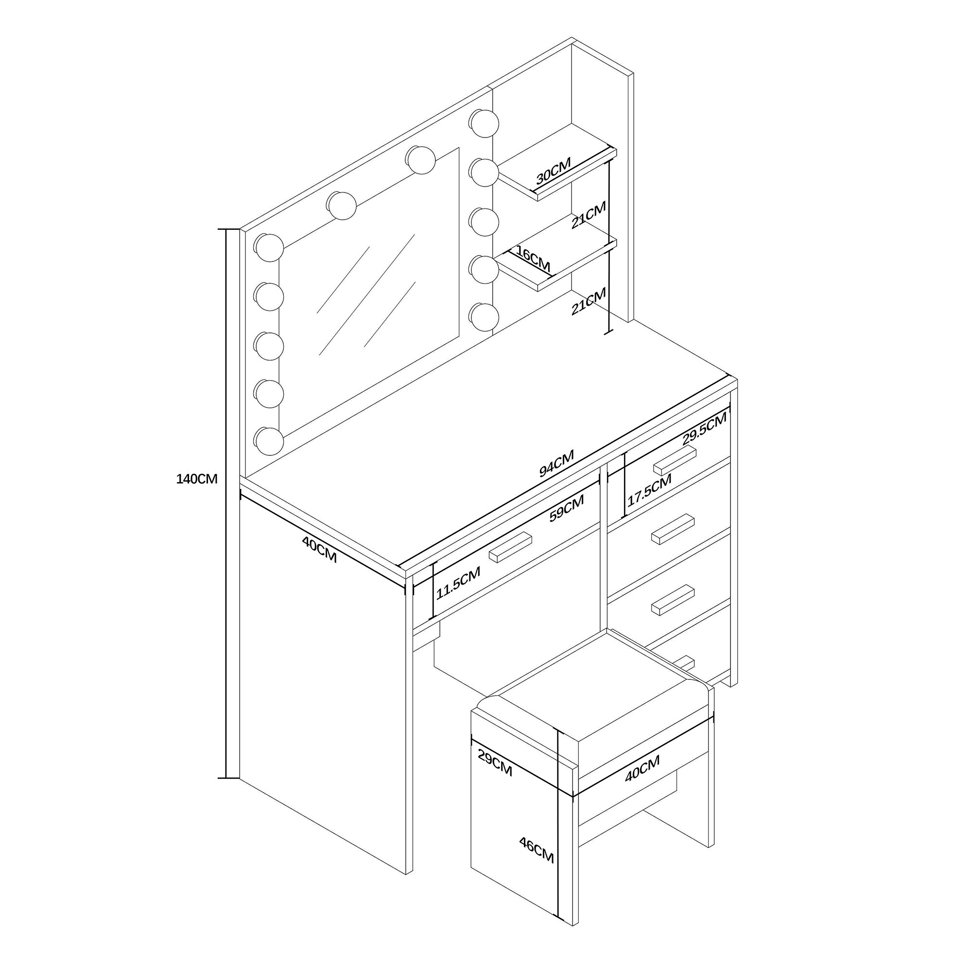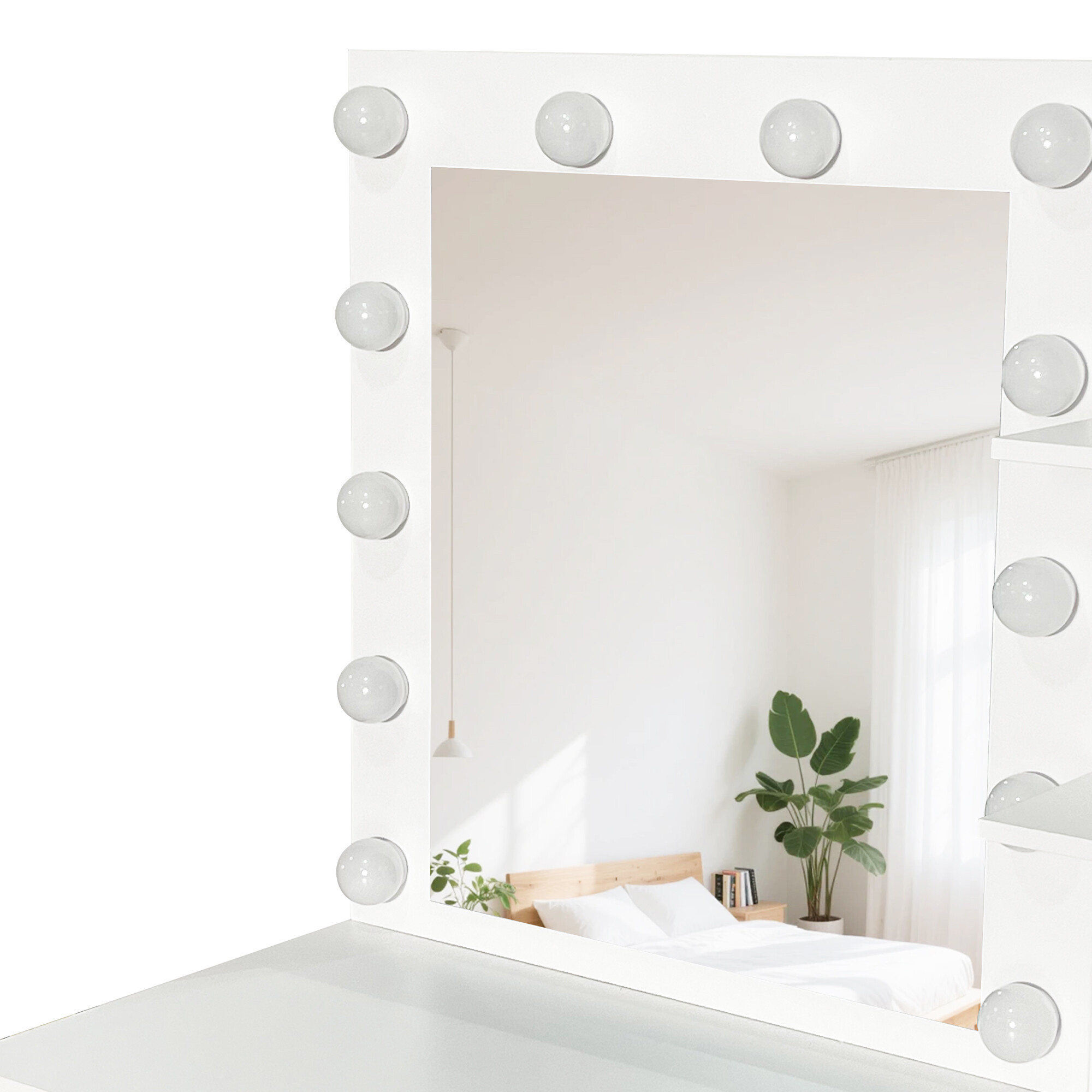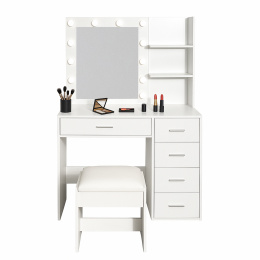 Доминиращият елемент на масата е голямо огледало с 12 LED крушки. Благодарение на това винаги ще си осигурите идеално осветление за гримиране, оформяне на косата или вечерна грижа за кожата.
