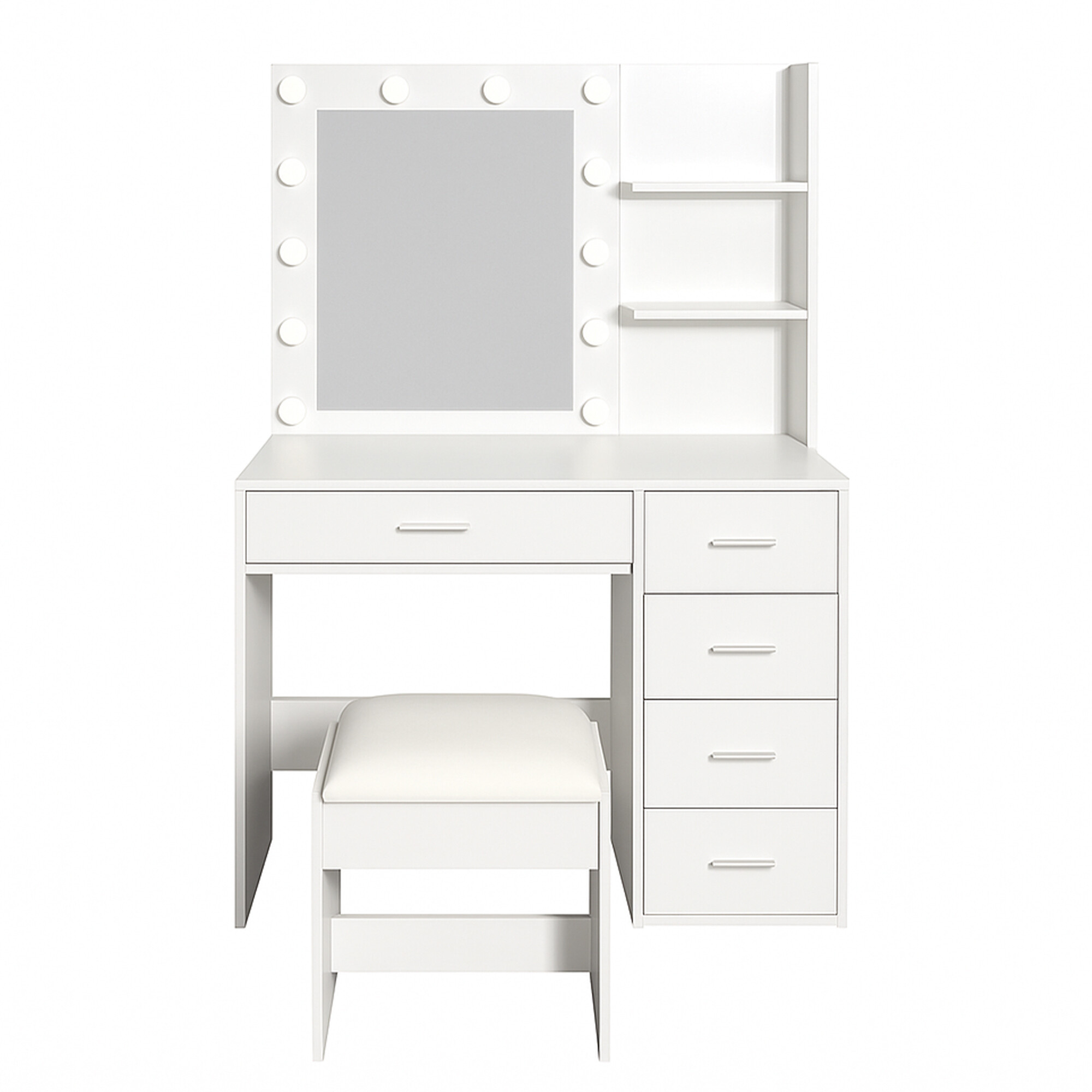 До огледалото има две практични отворени полици, на които можете да изложите любимите си козметични продукти, парфюми или декорации. Петте просторни чекмеджета предлагат достатъчно място за съхранение на грим, бижута и други аксесоари, които ще имате винаги подредени и под ръка.