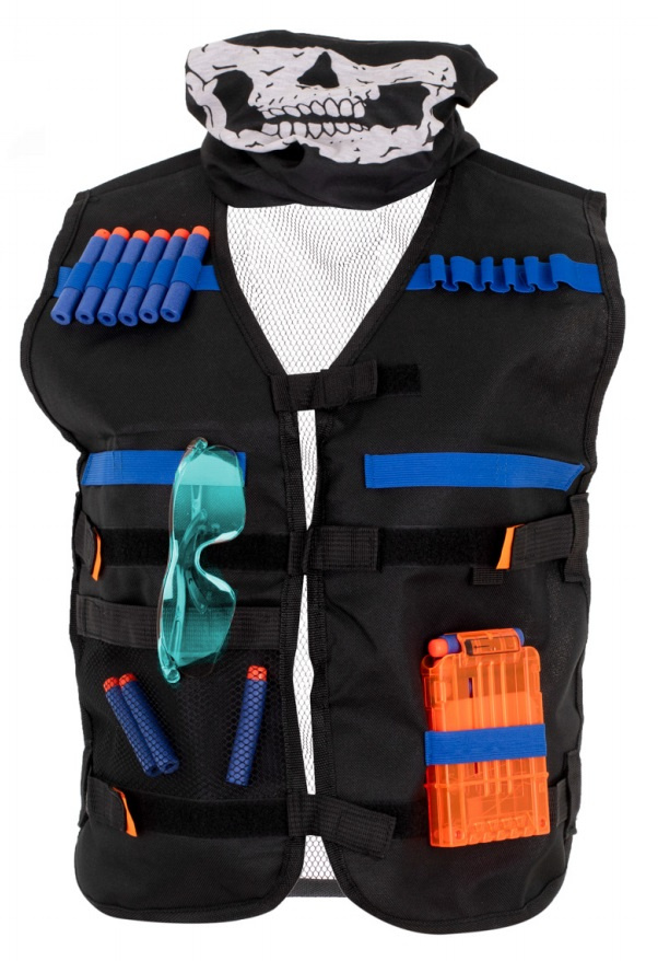 Жилетка, изработена от издръжлив материал. Той има каишки с велкро и допълнително място за съхранение на необходимите аксесоари. Включва: жилетка, шал, очила, 20 стрелички, списание и гривна. Размери: 52x46 cm.Цялото описание