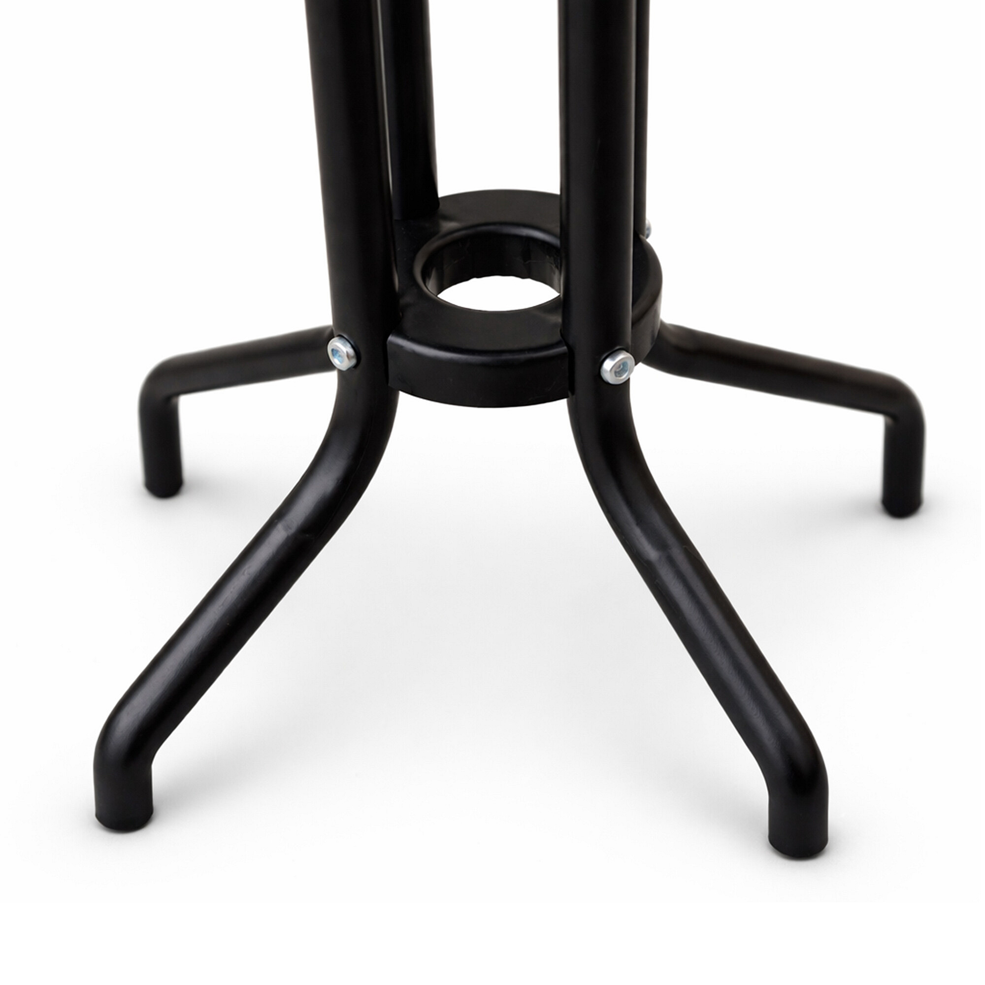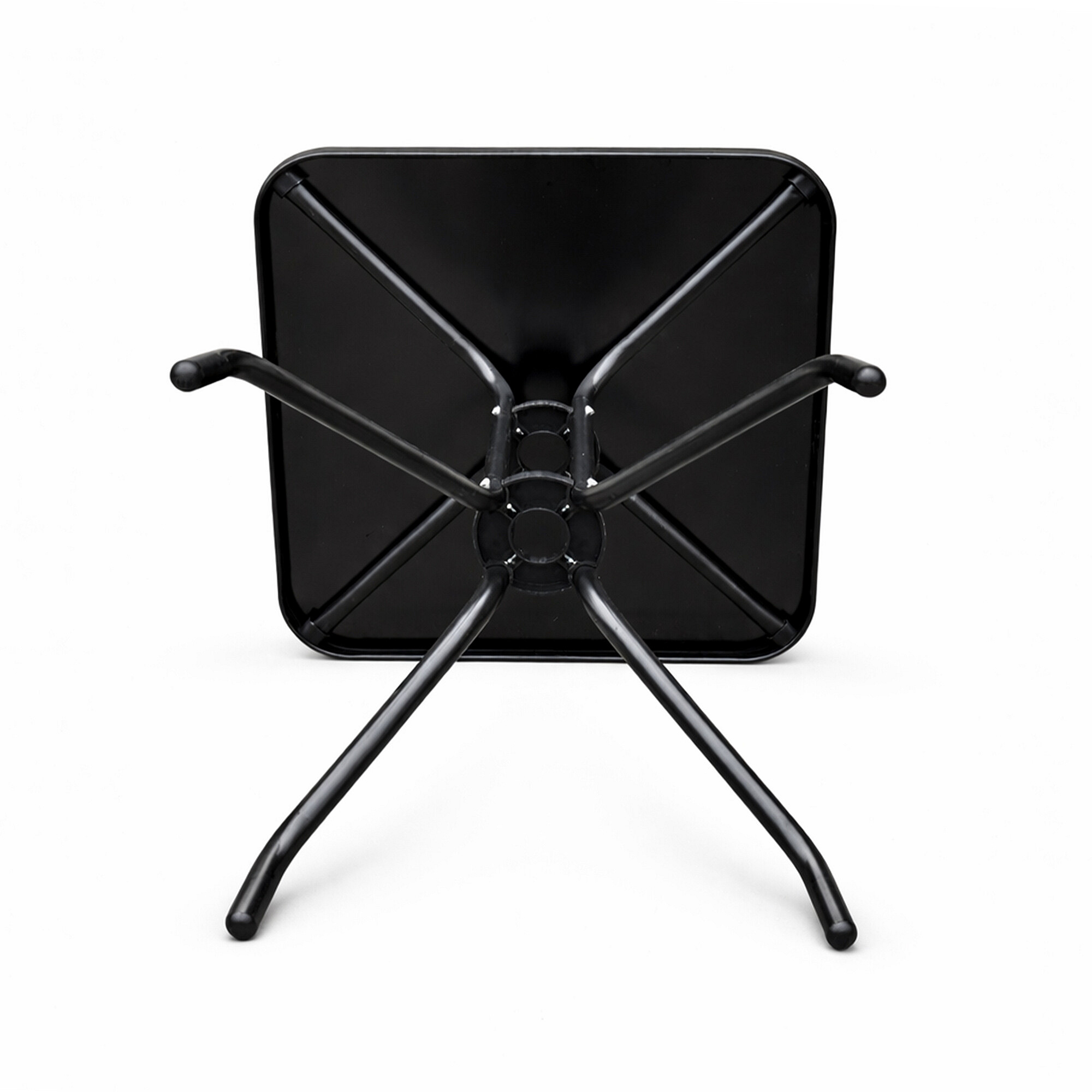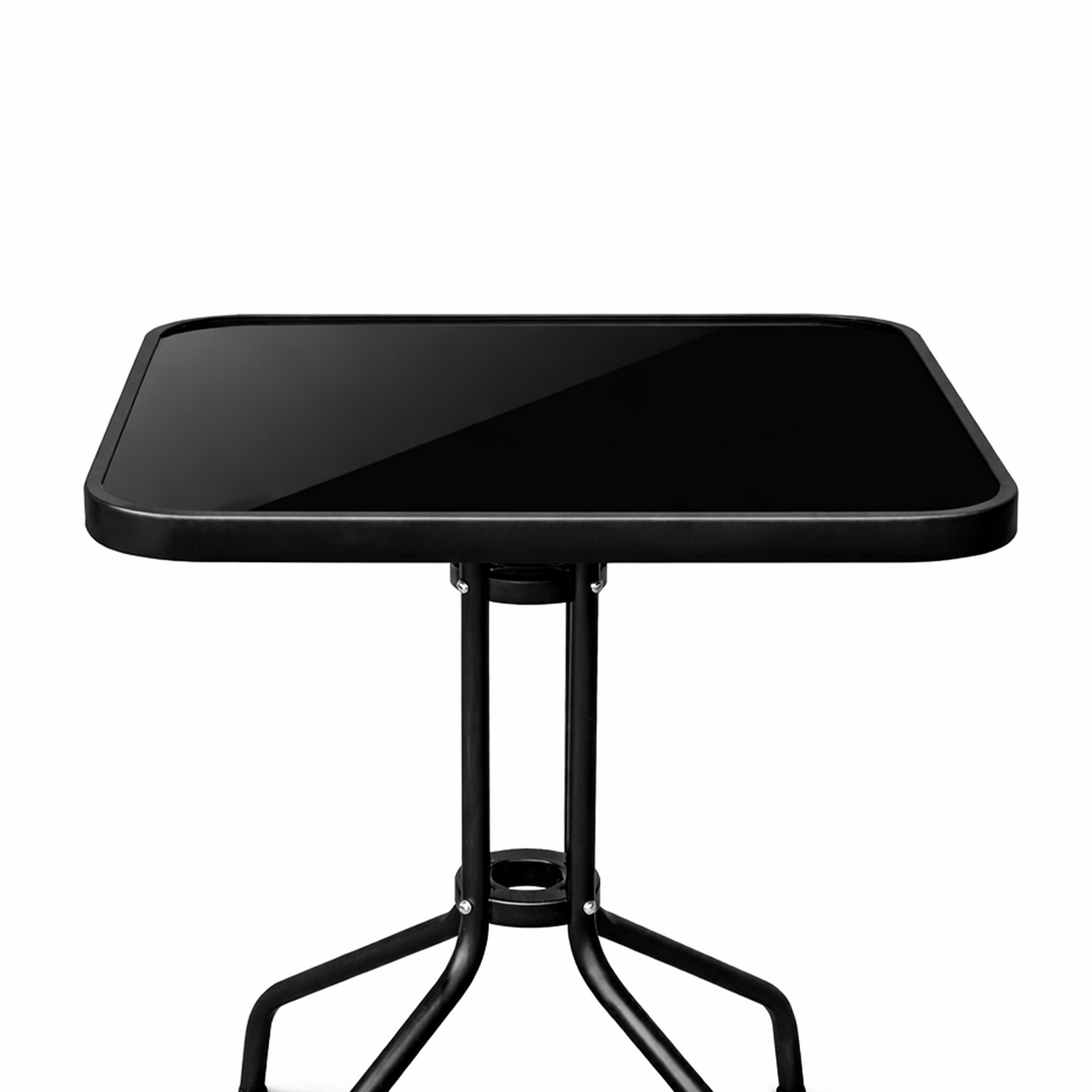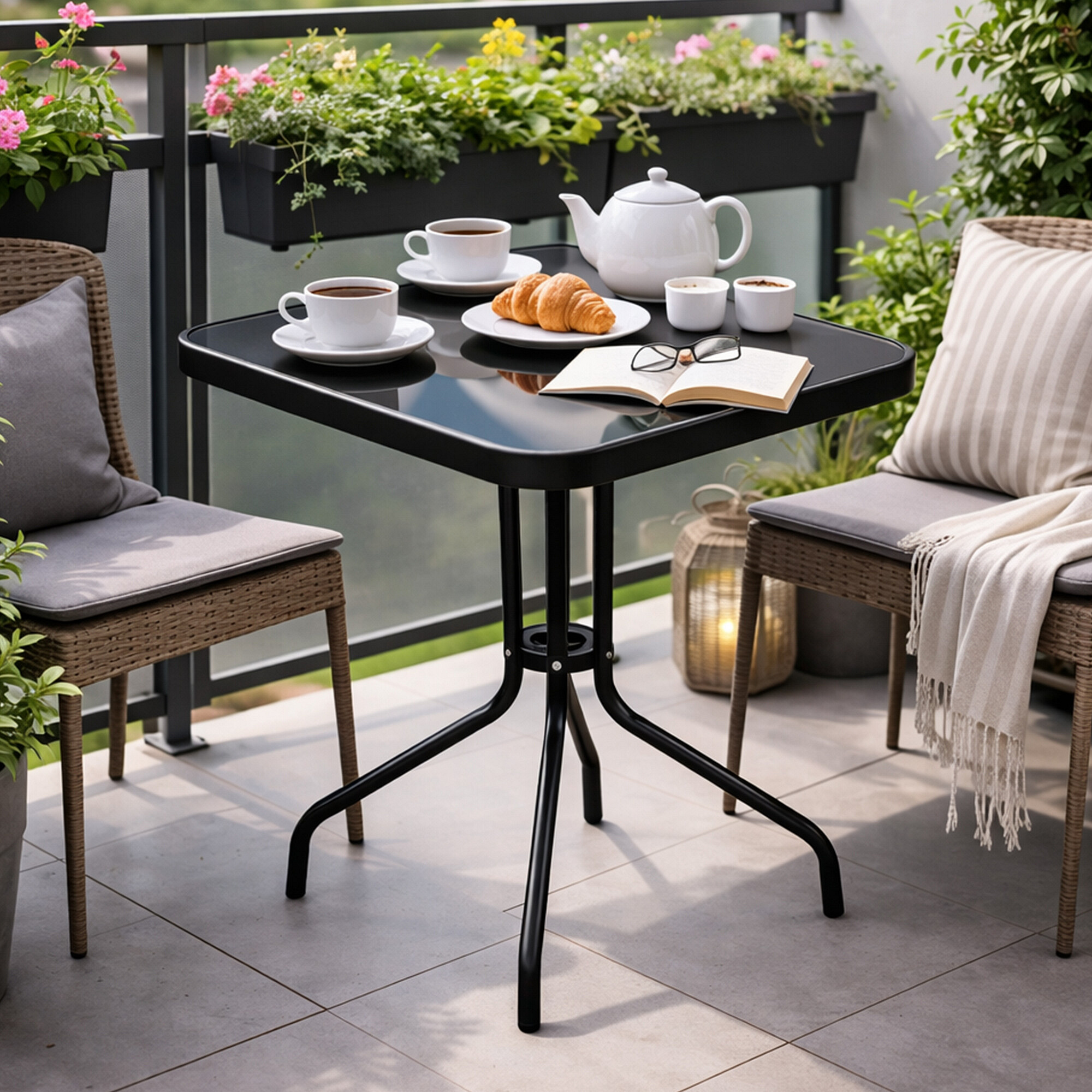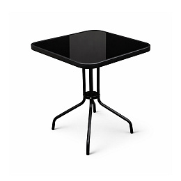 Градинска маса BISTRO със здрав метален рам и стъклен плот в модерен дизайн, подходяща за градини, тераси, кафенета, беседки, балкони или плажове.