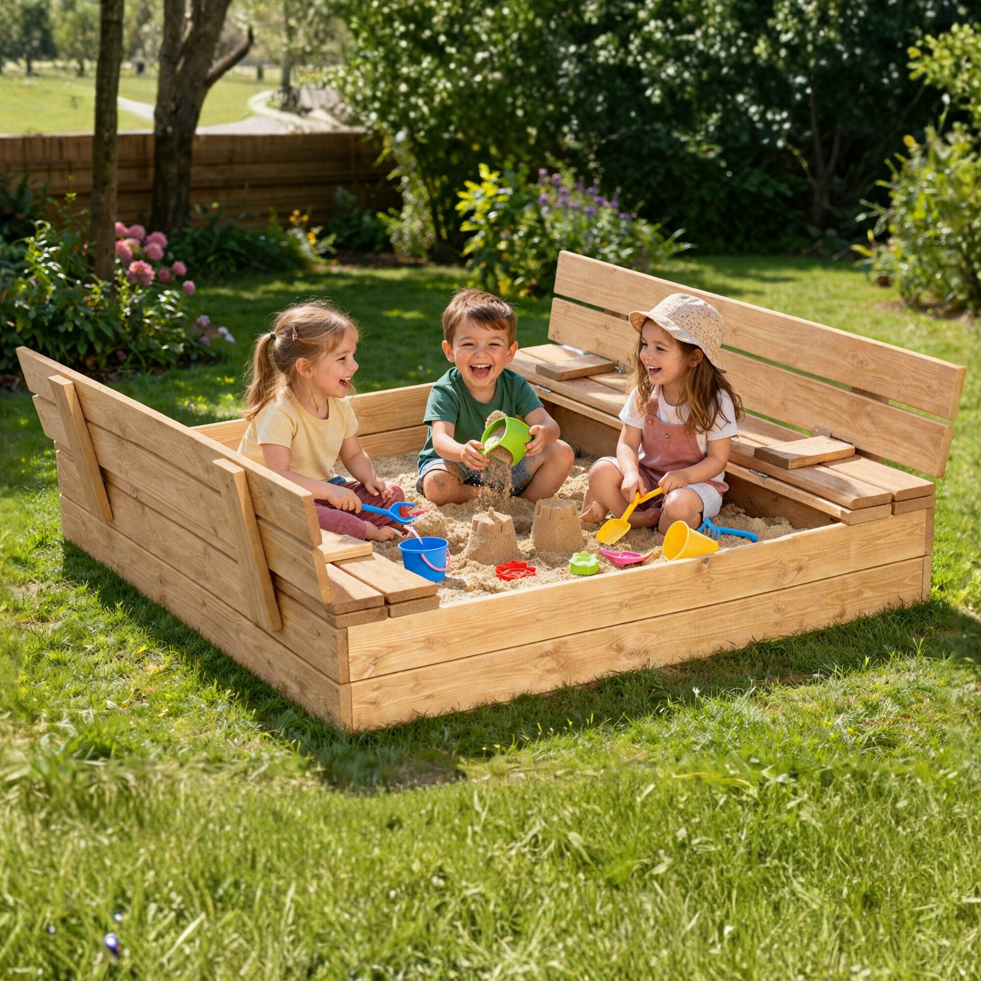 Голямо предимство е практичният защитен капак, който предпазва пясъка от замърсявания, дъжд и животни. След отваряне капакът лесно се превръща в удобни пейки, на които децата могат да седнат по време на игра.