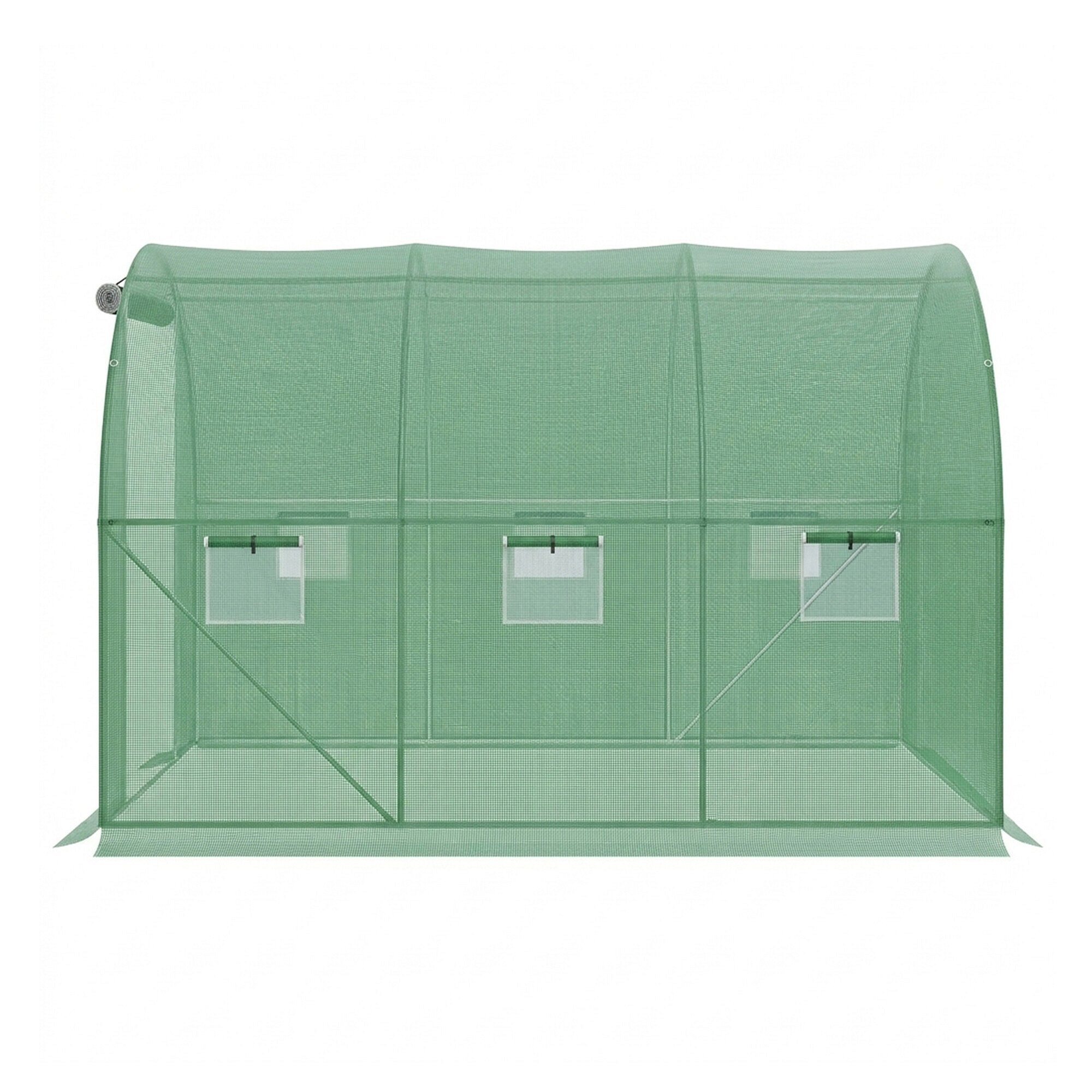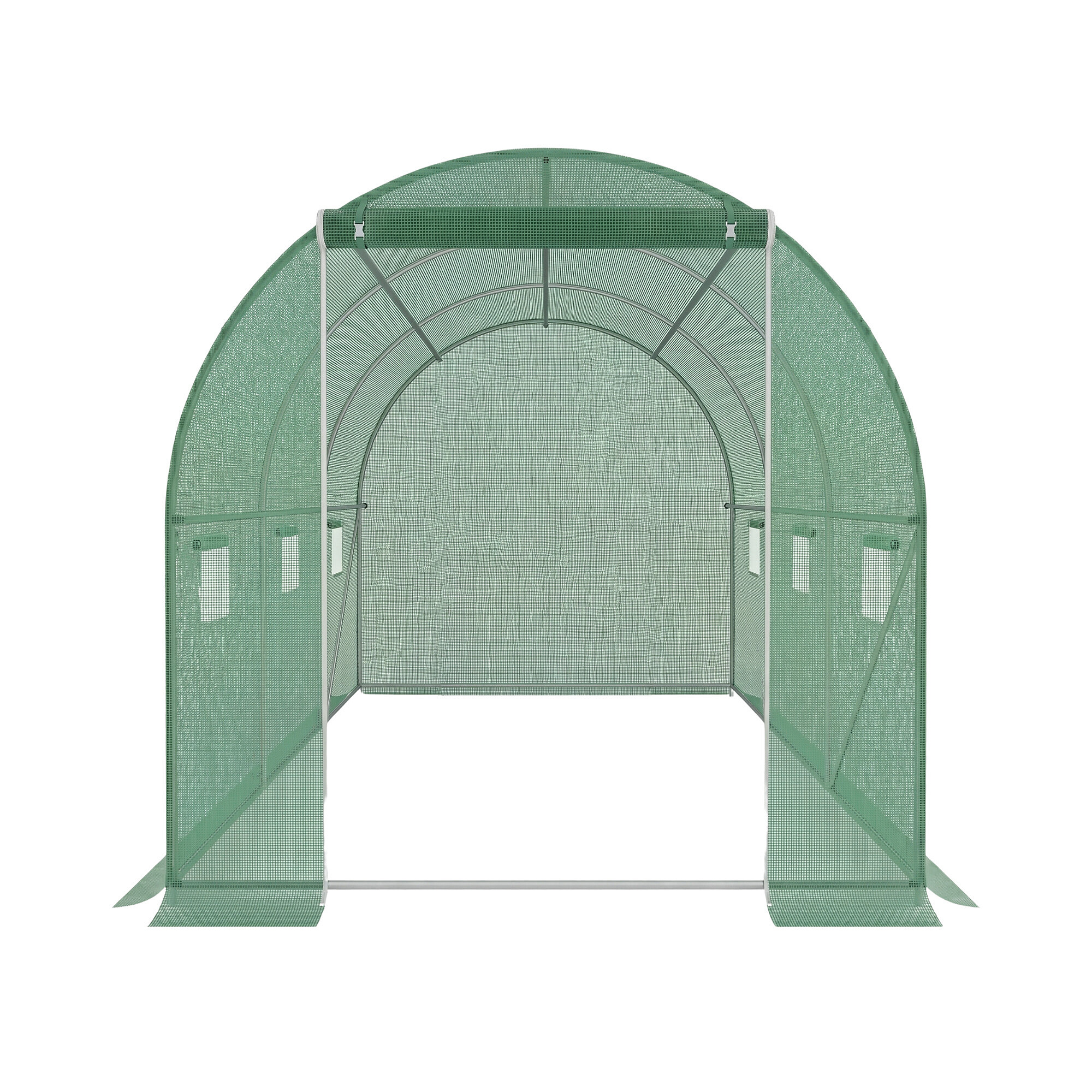 Широки ролетни врати на фолио тунела с двойни ципове за по-лесен достъп.Ролетните врати могат да бъдат навити и закрепени отгоре.
