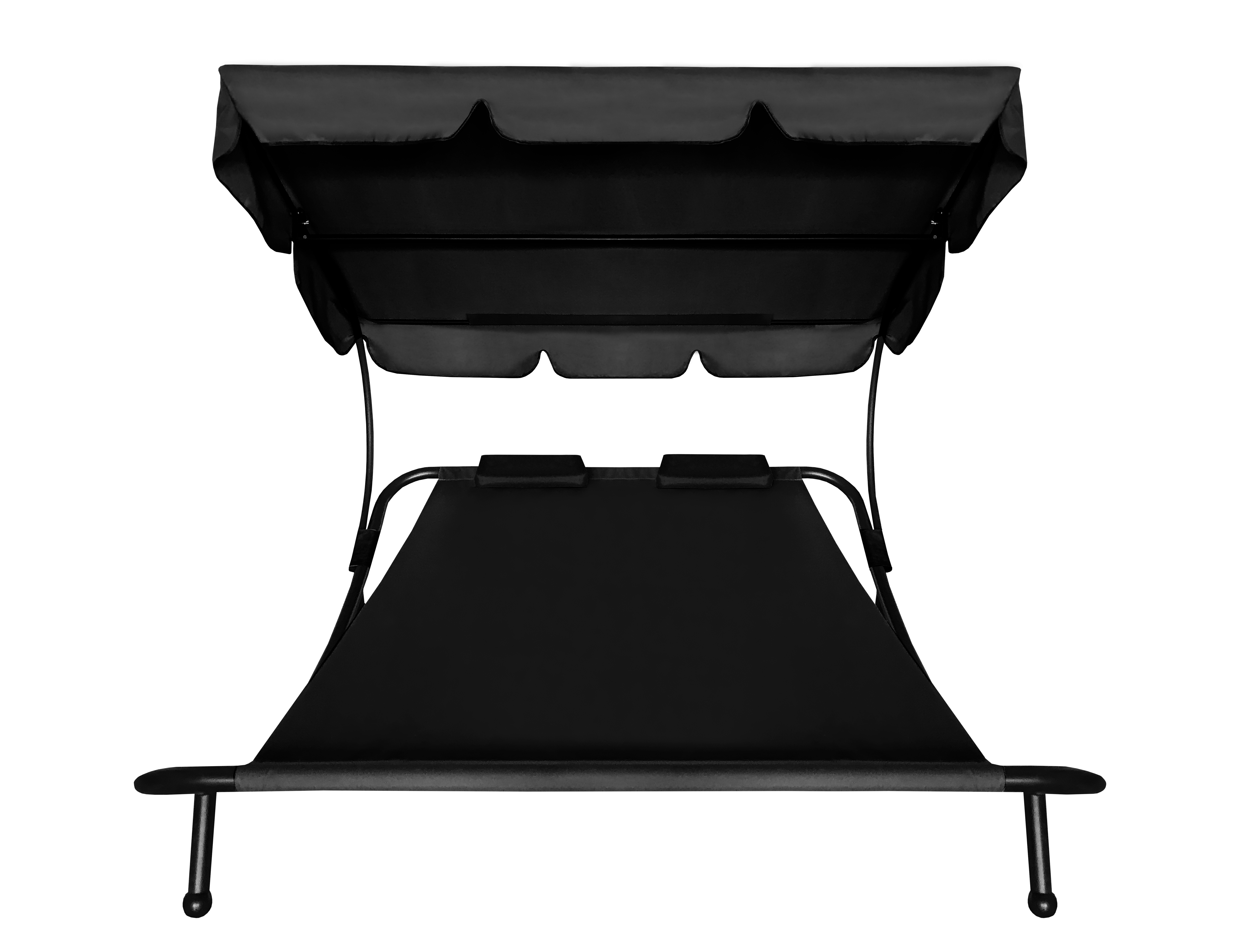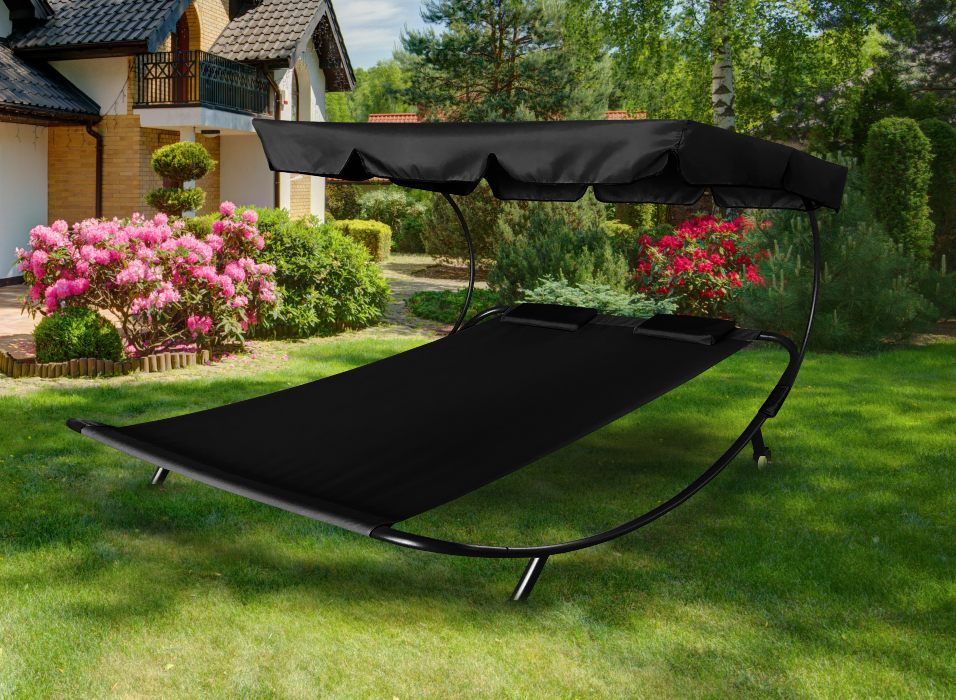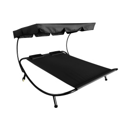 Двойното легло е изработено от висококачествена оксфордска тъкан, която отлично устоява на атмосферните влияния. Накланящият се сенник ще ви предпази от слънцето.