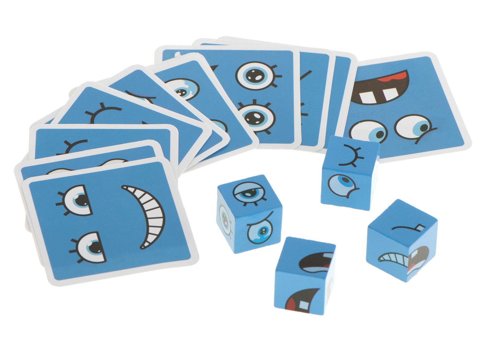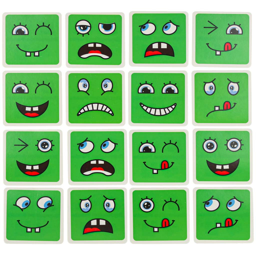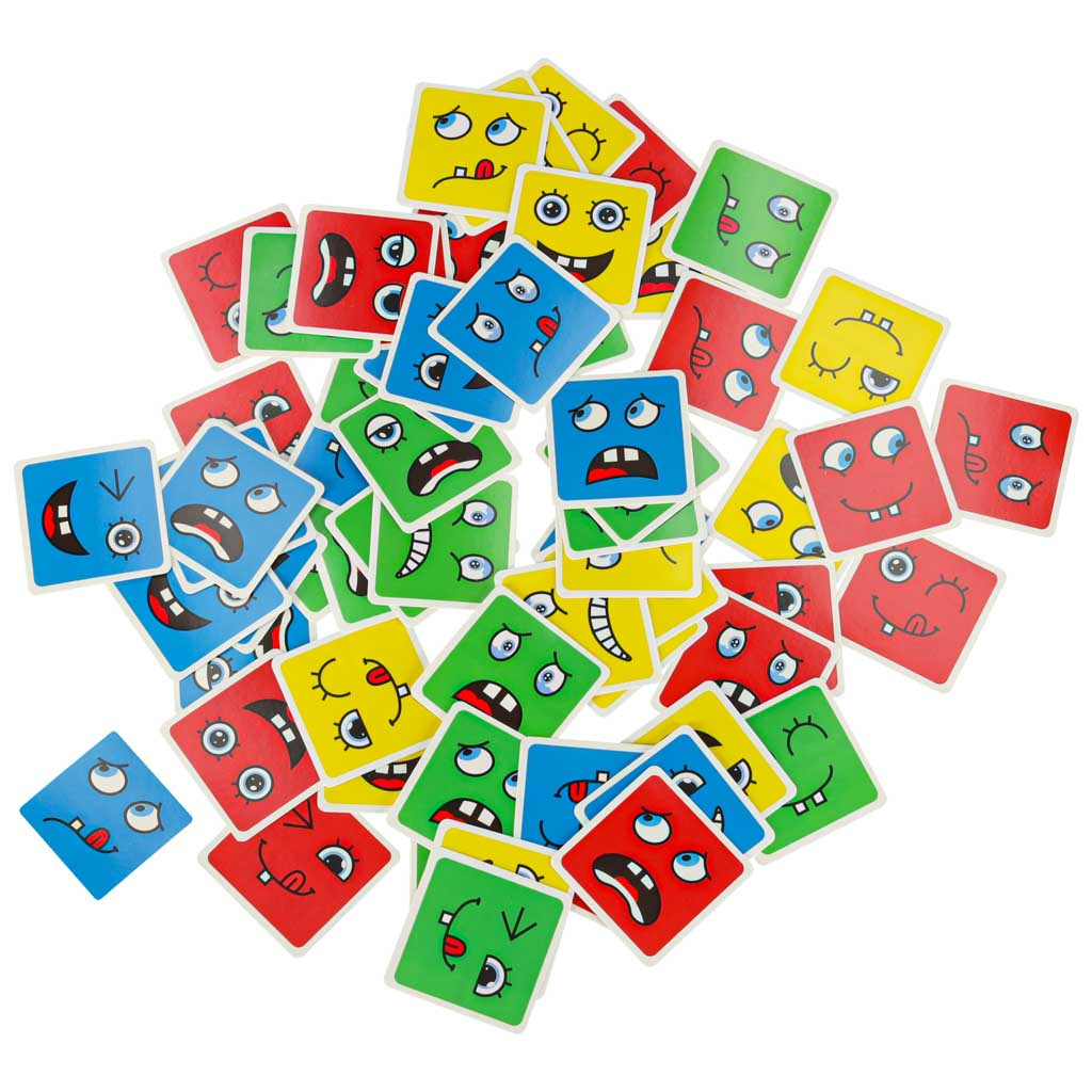 - Изтеглете една от картите с усмивка и с помощта на заровете възможно най-бързо създайте изобразеното лице.