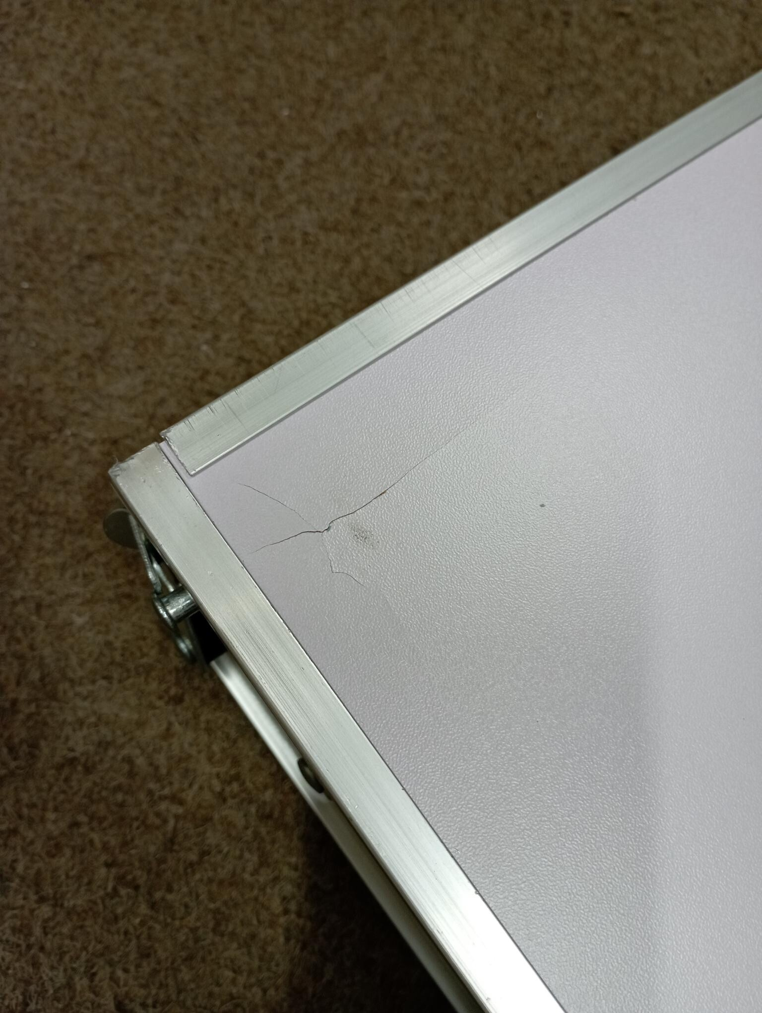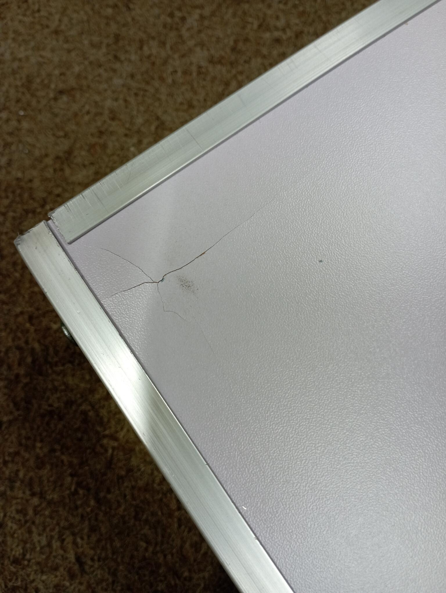 Масата е пълна и напълно функционална. Плотът на масата е напукан в един ъгъл, повърхността е леко надраскана и прашна.