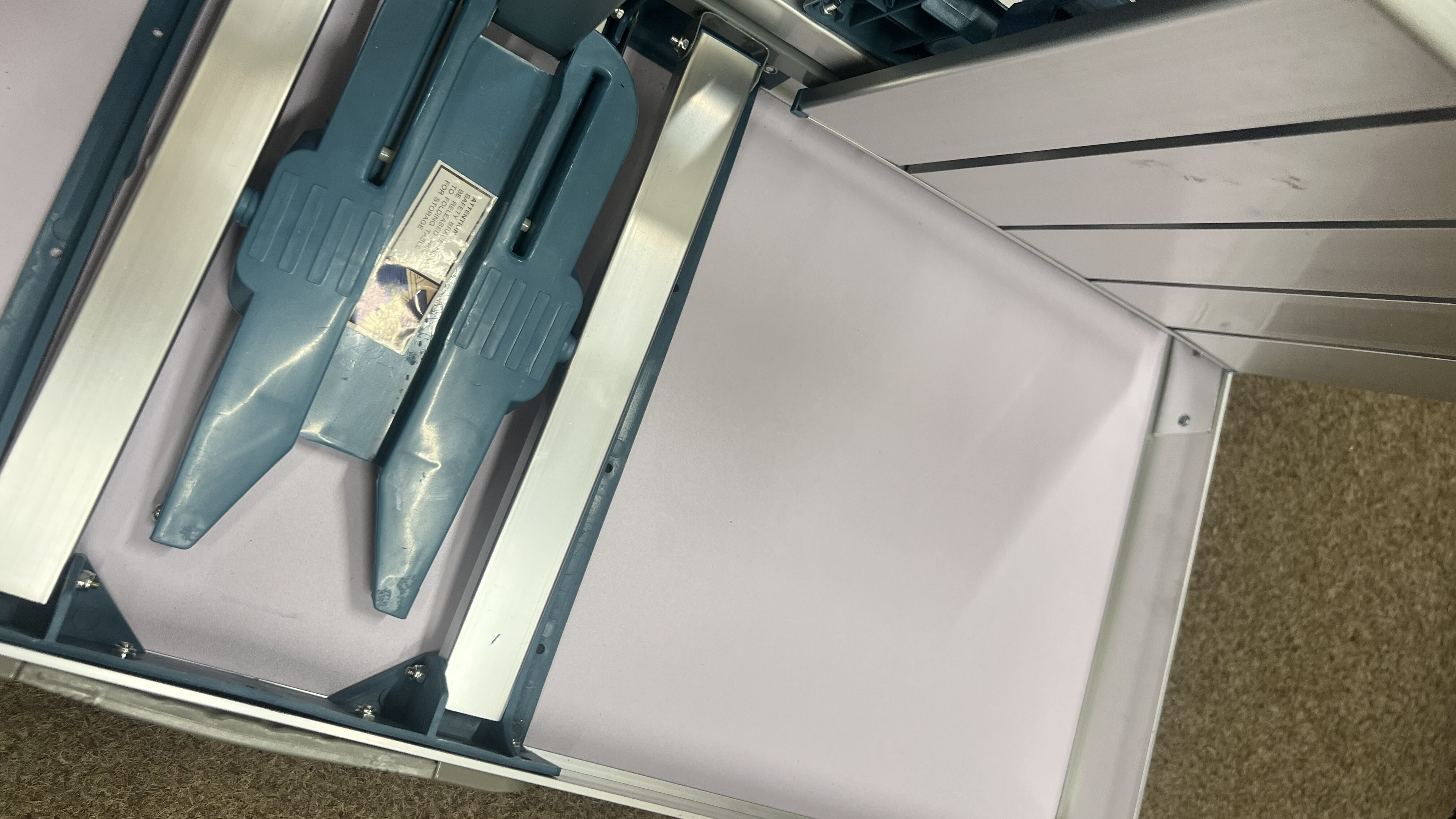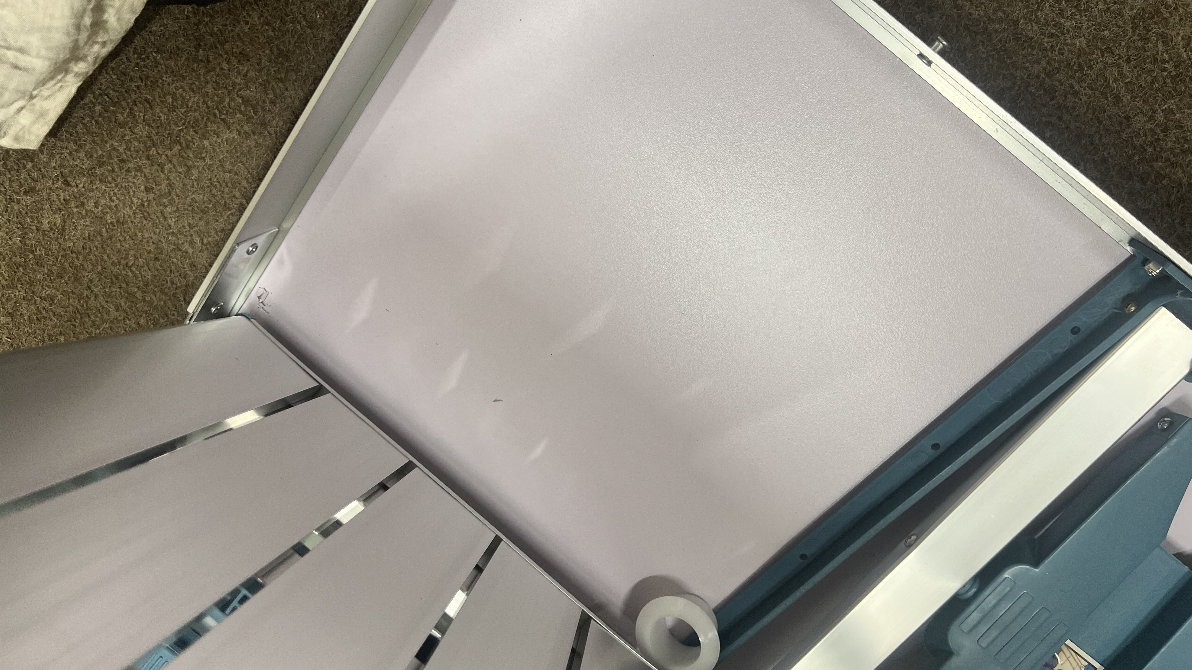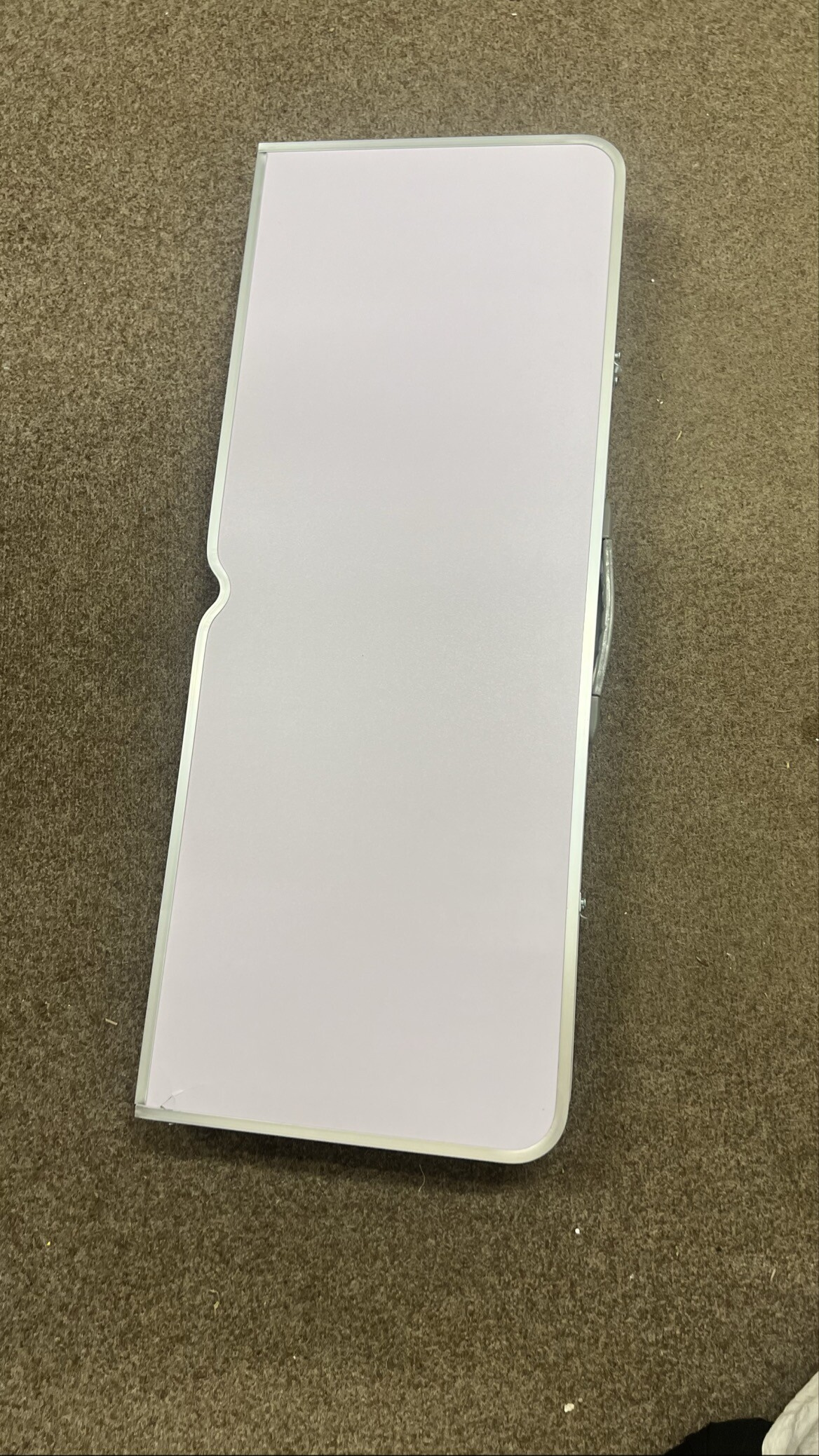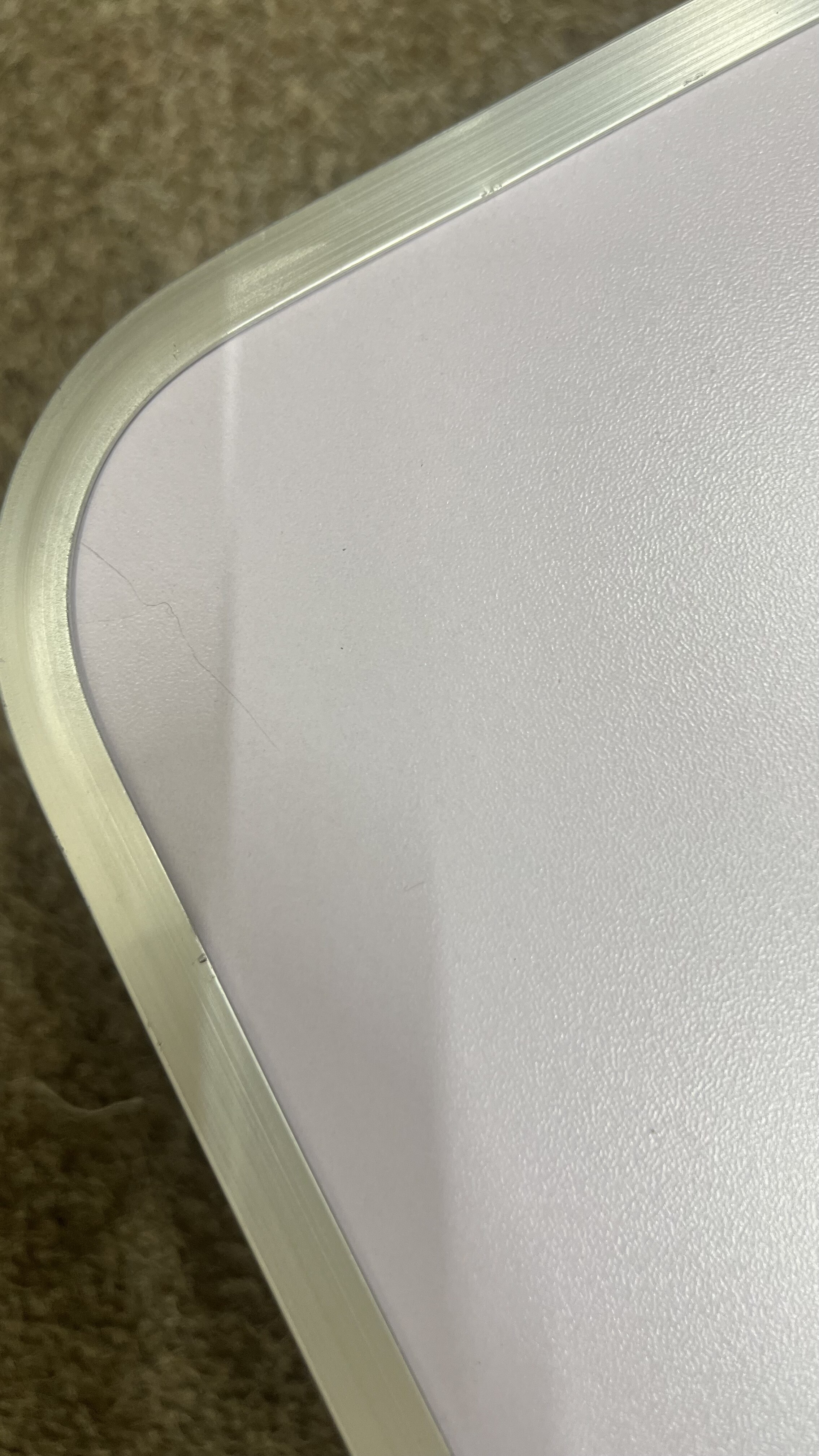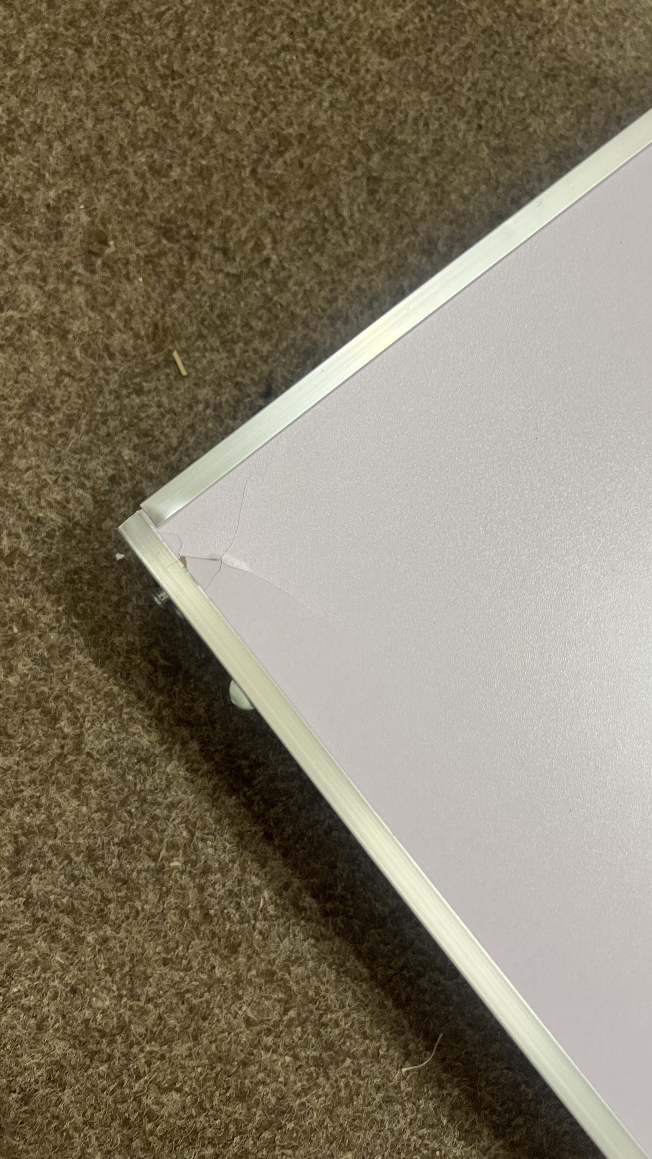Къмпинг сгъваемият комплект е пълен и напълно функционален. Дефектът се състои в пукнатини на плочата в два ъгъла, повърхността освен това на места е леко надраскана и прашна.