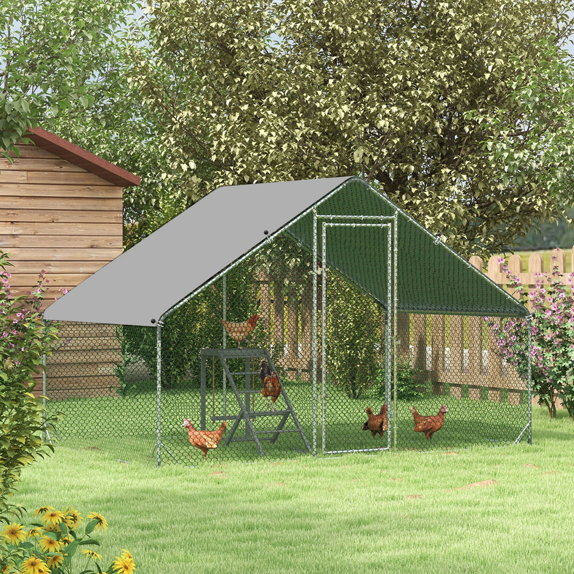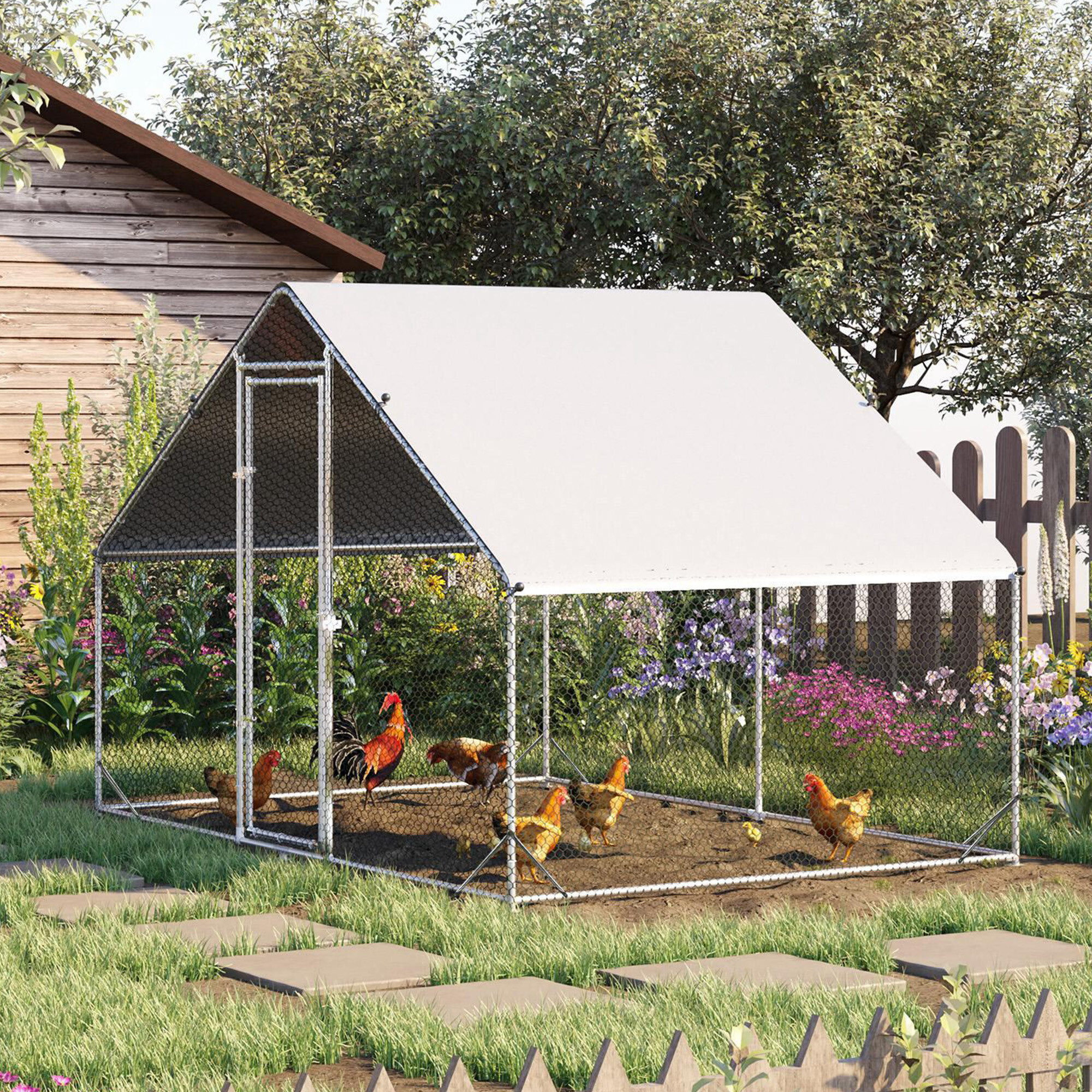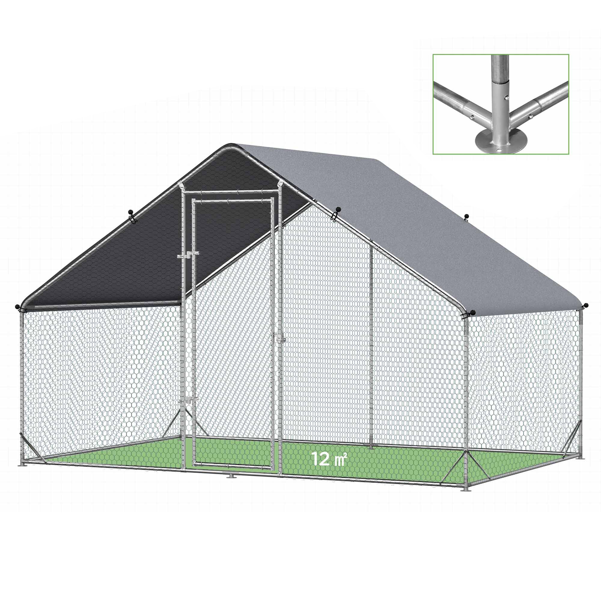 Кошарата може да бъде сглобена за миг благодарение на модулната система за включване и можете да прикрепите покривно платно към нея, което ще предпазва птиците от пряка слънчева светлина. Заграждението има просторна врата, която лесно се отваря и можете без проблеми да влезете в заграждението.
