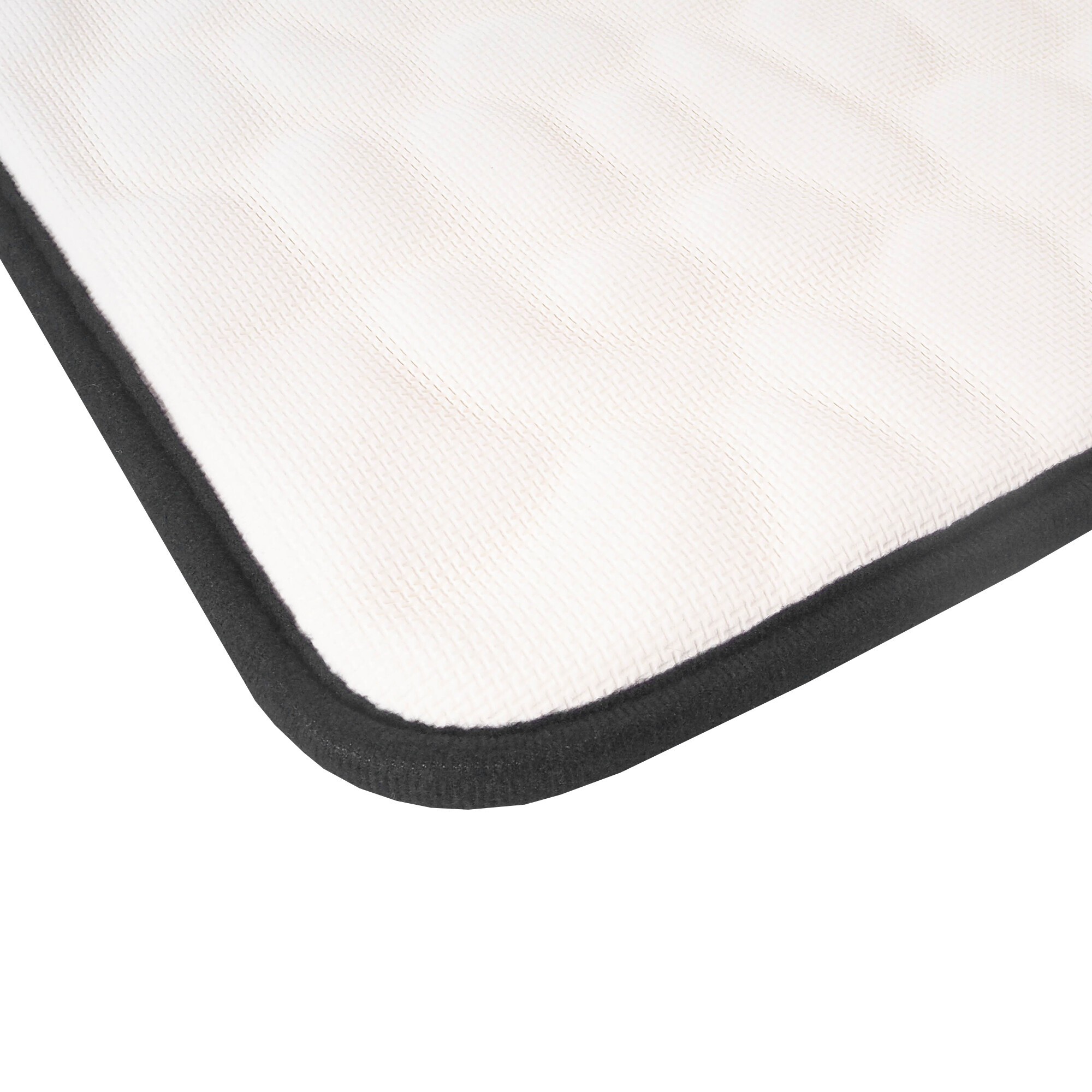 Безопасността е ключов елемент на всяка баня, затова нашата постелка е оборудвана с противоплъзгаща се долна страна от материал SBR. Този материал гарантира, че подложката остава здраво на мястото си, независимо дали подът е сух или мокър. С нашата подложка не е нужно да се притеснявате от опасни подхлъзвания и падания.