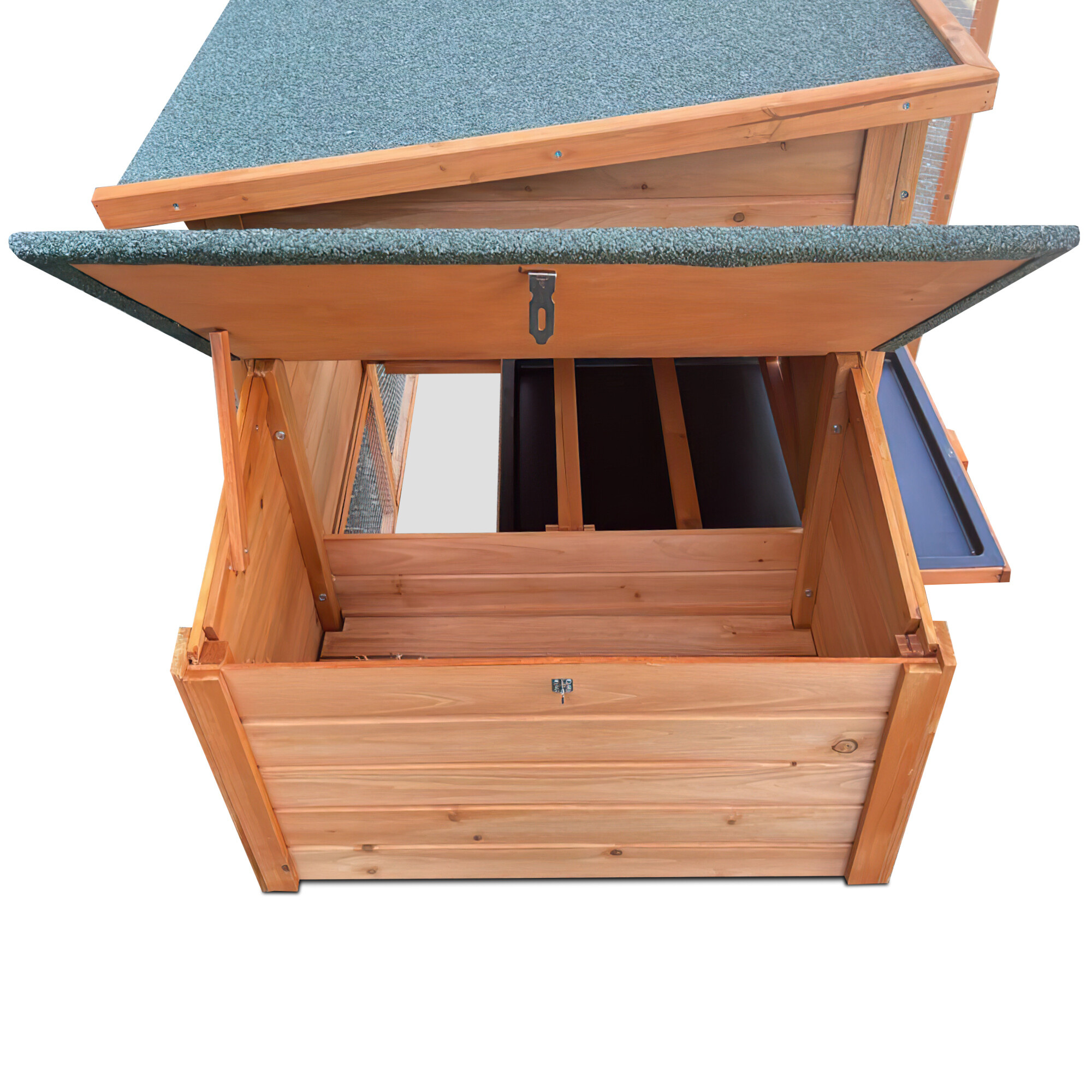 Едно от основните предимства на този кокошарник е сгъваемият покрив, който осигурява лесен достъп до яйцата. Вече няма нужда от сложно огъване и разтягане, просто повдигнете покрива и яйцата са на една ръка разстояние.