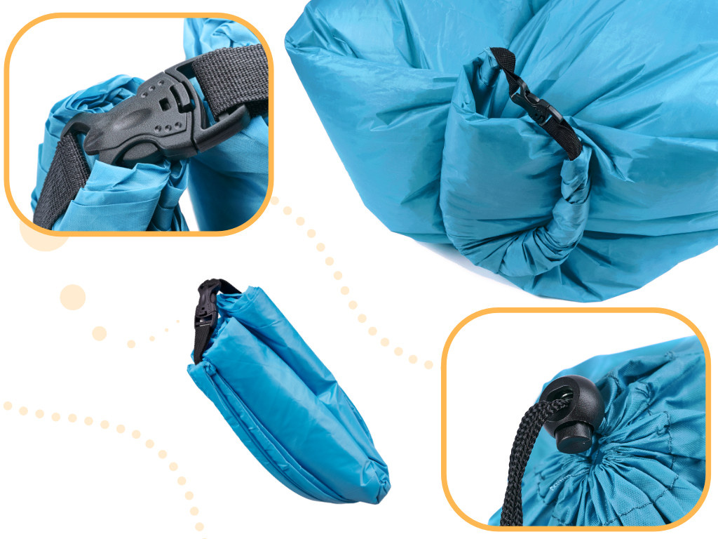 Разгъването отнема буквално само няколко секунди и не изисква помпа. С едно ефективно движение срещу вятъра поемете въздух, свийте се в отвора и закопчайте копчетата. Диванът се напълва с въздух и се превръща в изключително удобен матрак.