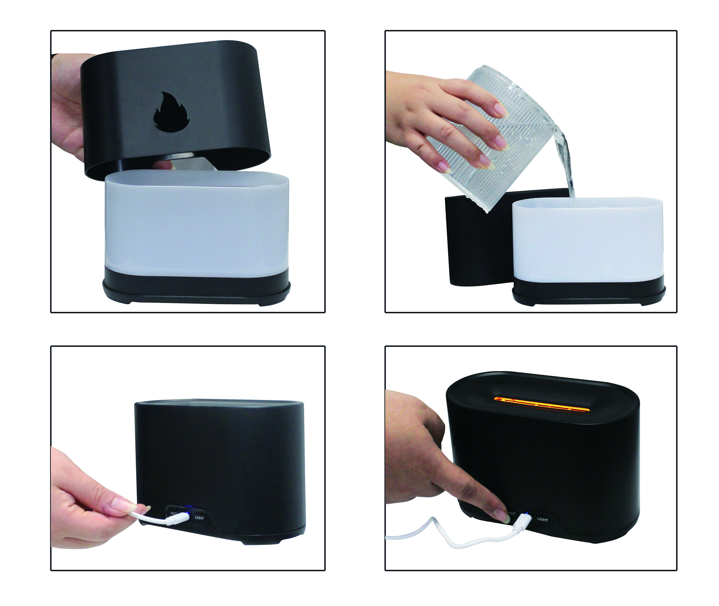 Осветяването на парата, излизаща от дифузера, създава илюзията за огън и по този начин е подходящ като стилен интериорен аксесоар, който също така успява да освети цялата стая с приятна светлина.