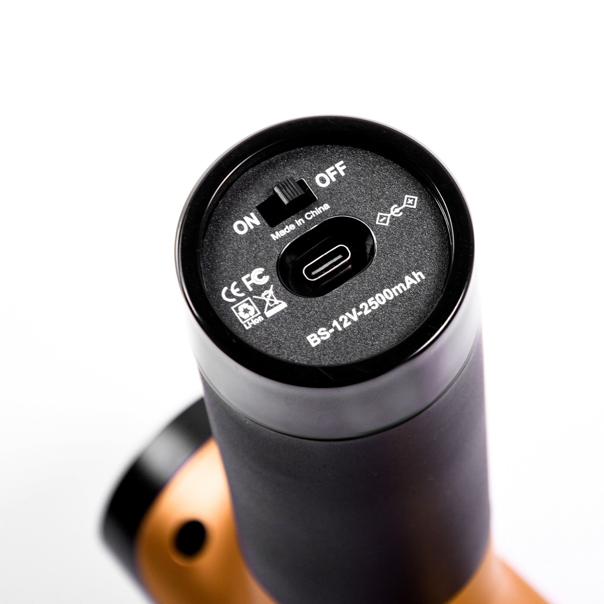 Масажният пистолет има вградена литиево-йонна батерия с капацитет 2500mAh, която издържа до 3 часа с едно зареждане, в зависимост от използваната скоростна степен.