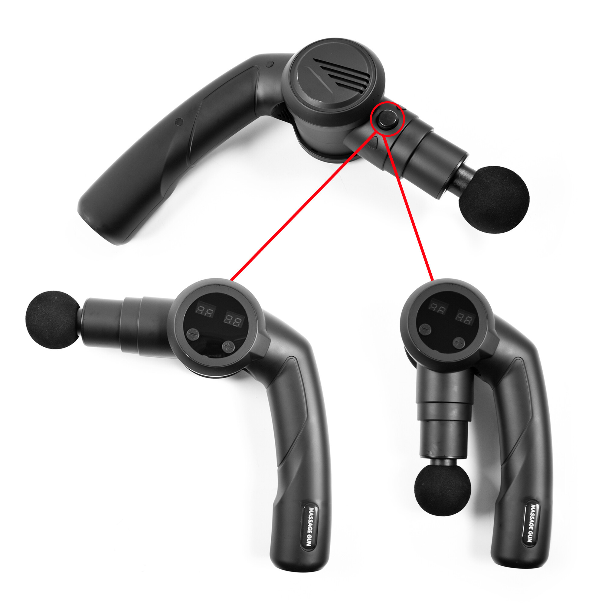 Сгъваем масажен пистолет с ергономична дръжка във формата на L с противоплъзгаща се ръкохватка за здраво захващане. Въртящото се рамо позволява по удобен начин да достигнете точно до мускулите, които изискват вашето внимание.