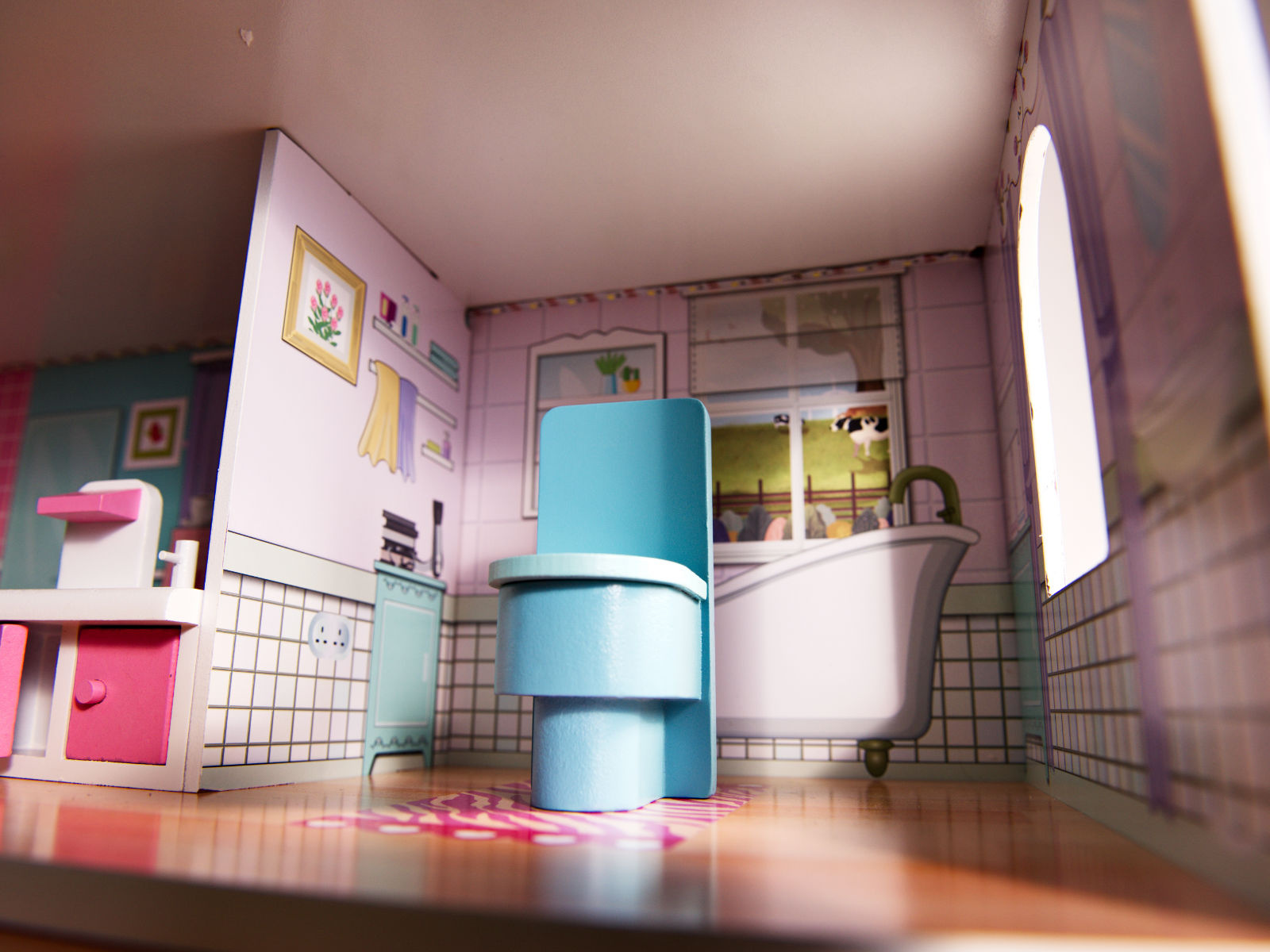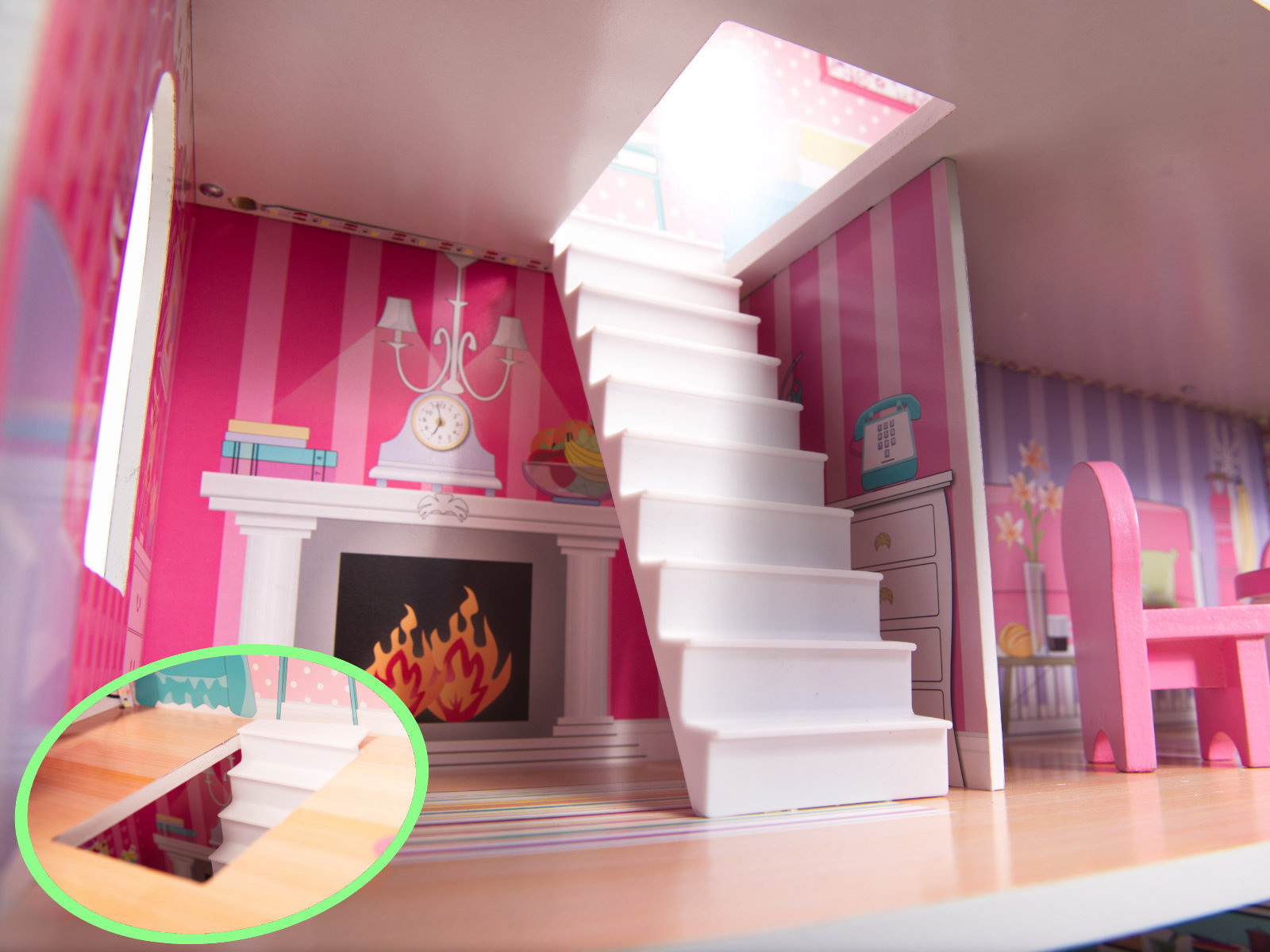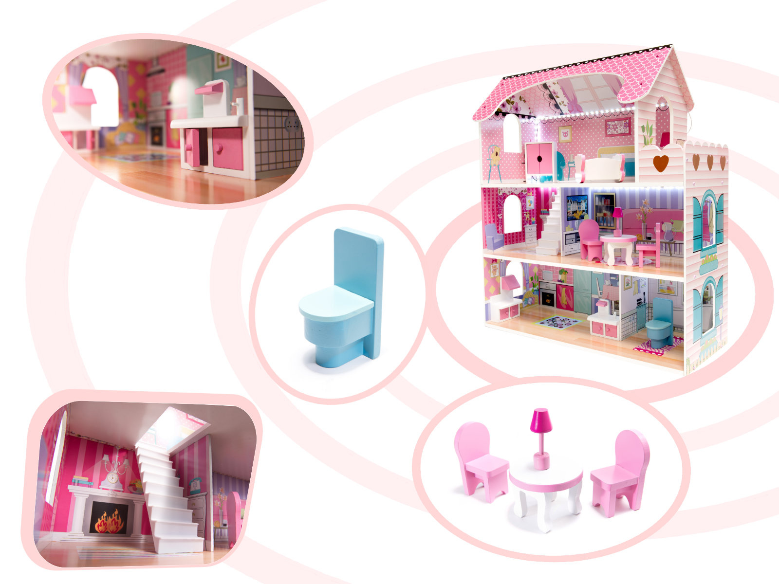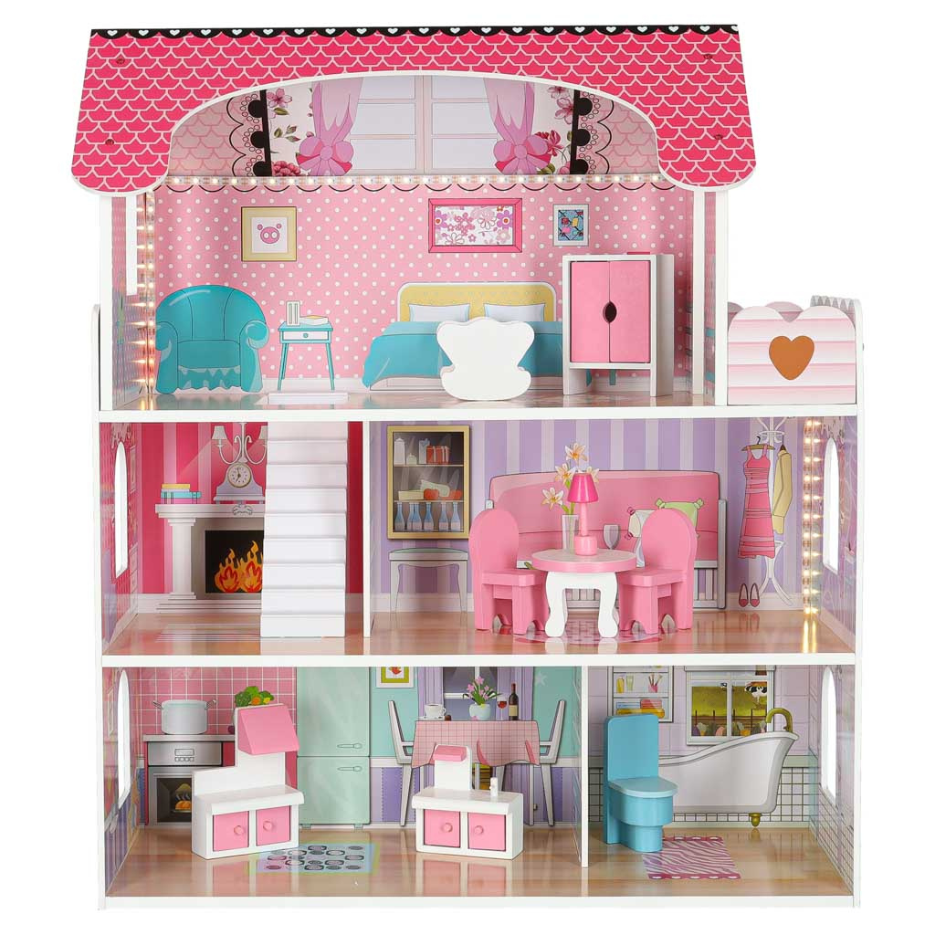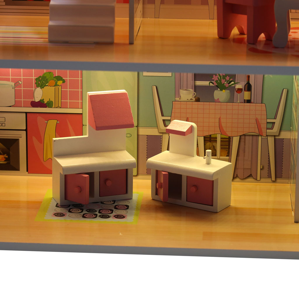 - LED осветление - Къщичките за кукли са оборудвани с впечатляващо LED осветление, което не само изглежда страхотно, но може да се използва и като нощна лампа. Осветителните тела са монтирани на самозалепваща се лента, която просто се залепва на тавана и стените на къщата. Светлините могат да се монтират по всякакъв начин. Захранва се с батерии АА (не са включени).