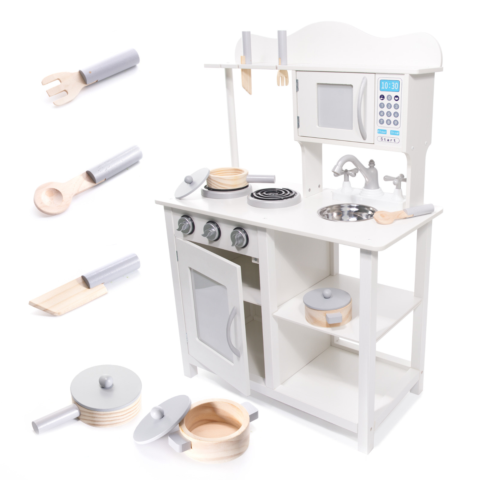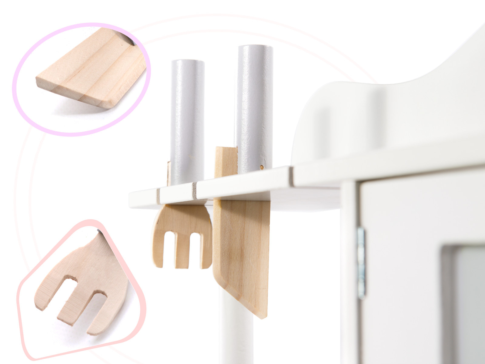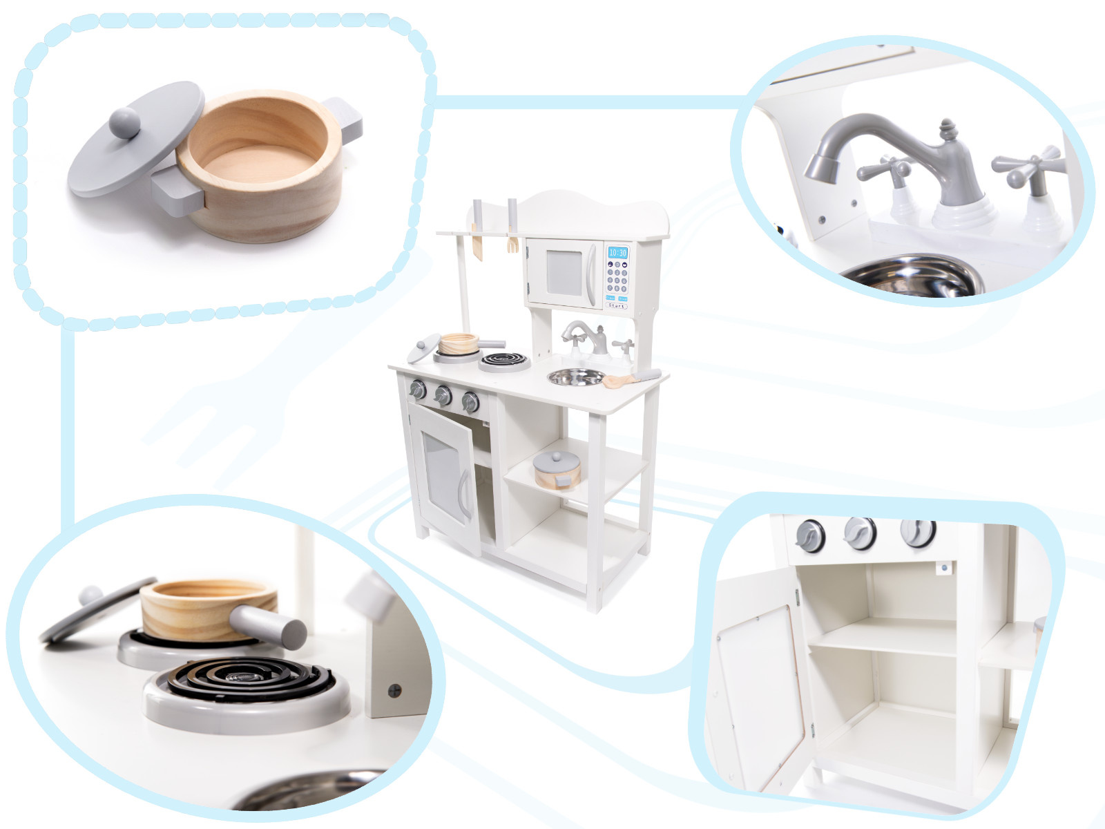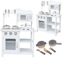 Нашите големи и елегантни дървени кухни са подходящи за всяка детска стая. Универсалният бял цвят напомня на традиционните кухни и позволява на детето ви да се включи още повече в играта.
