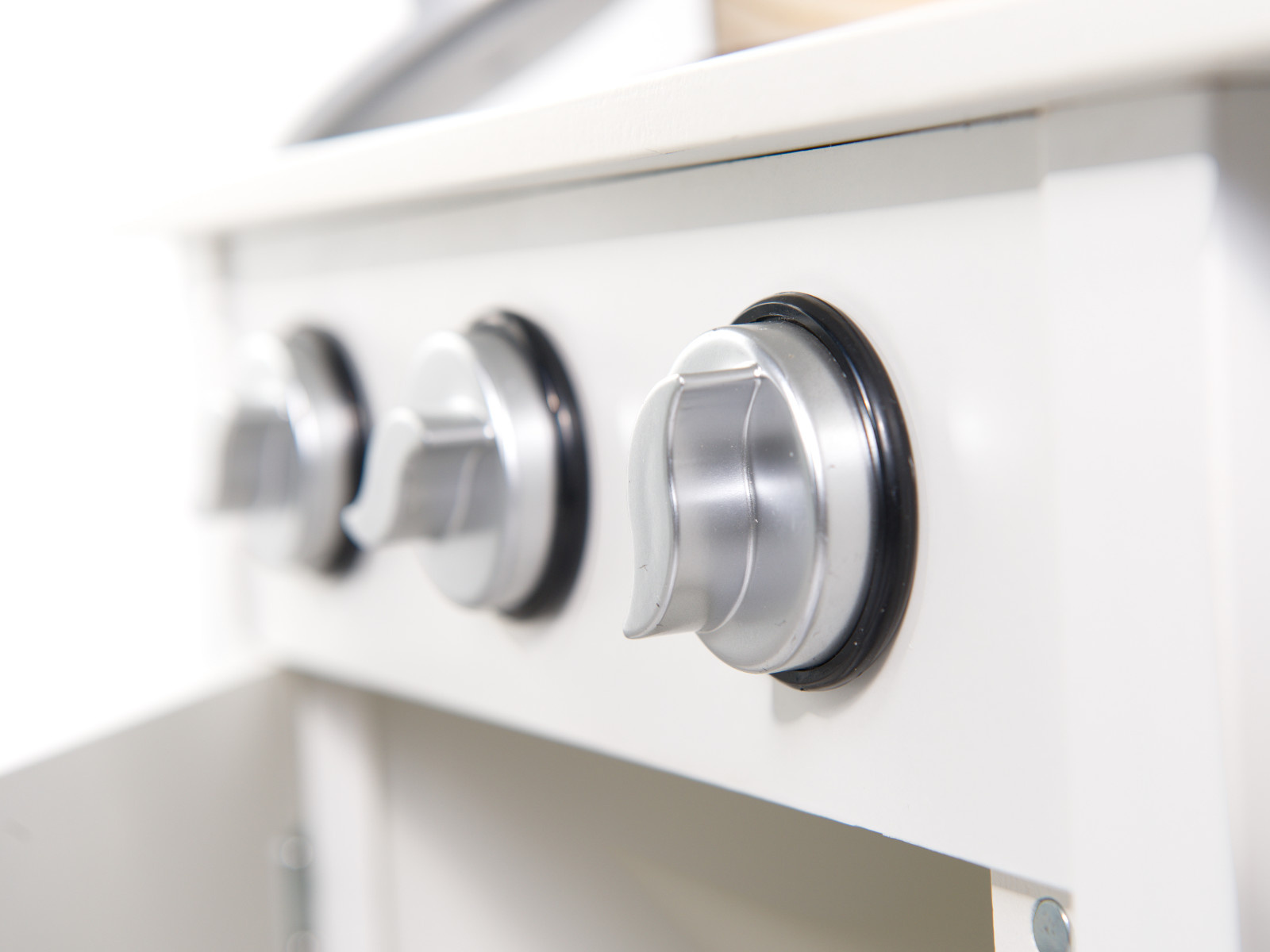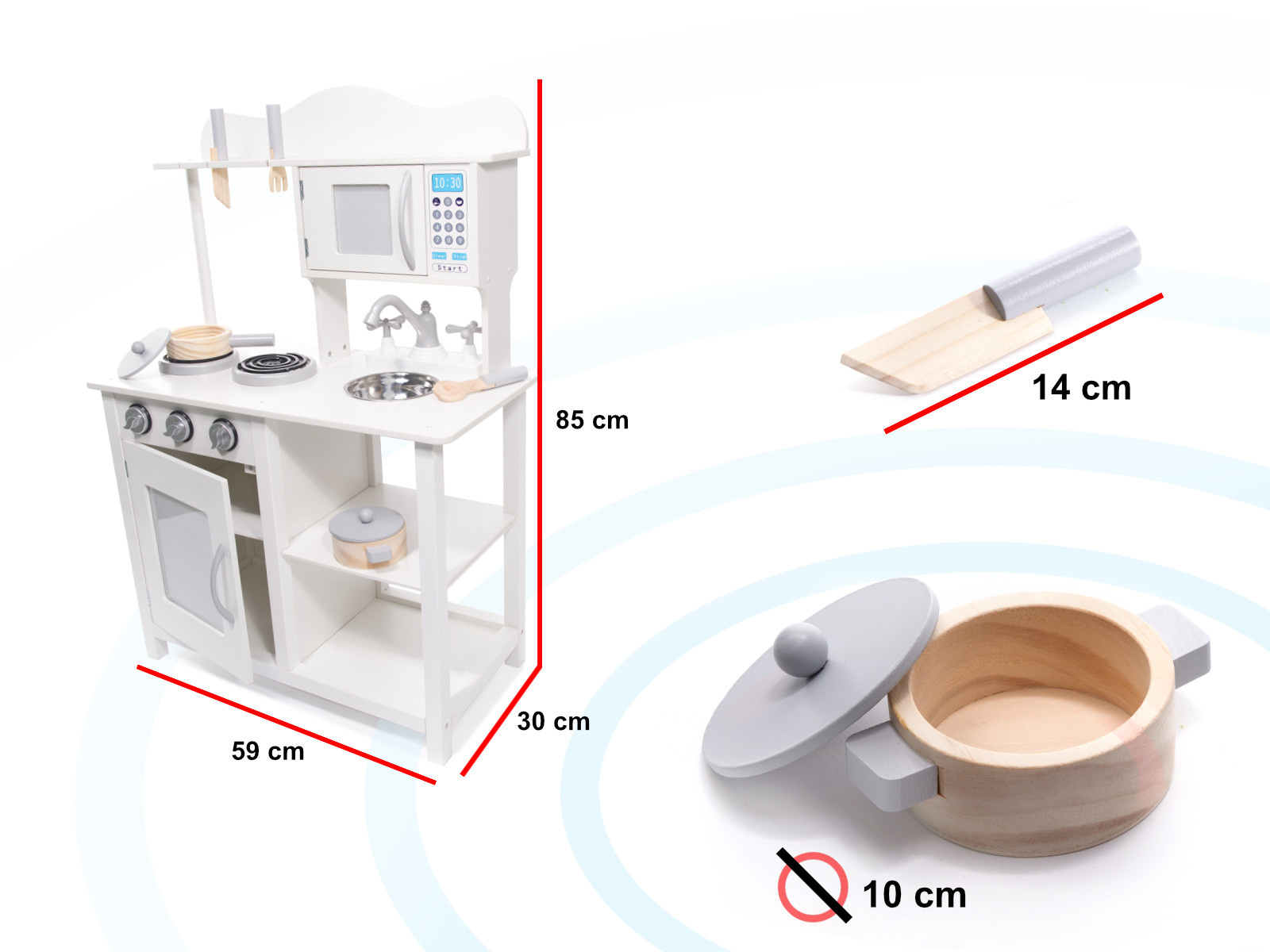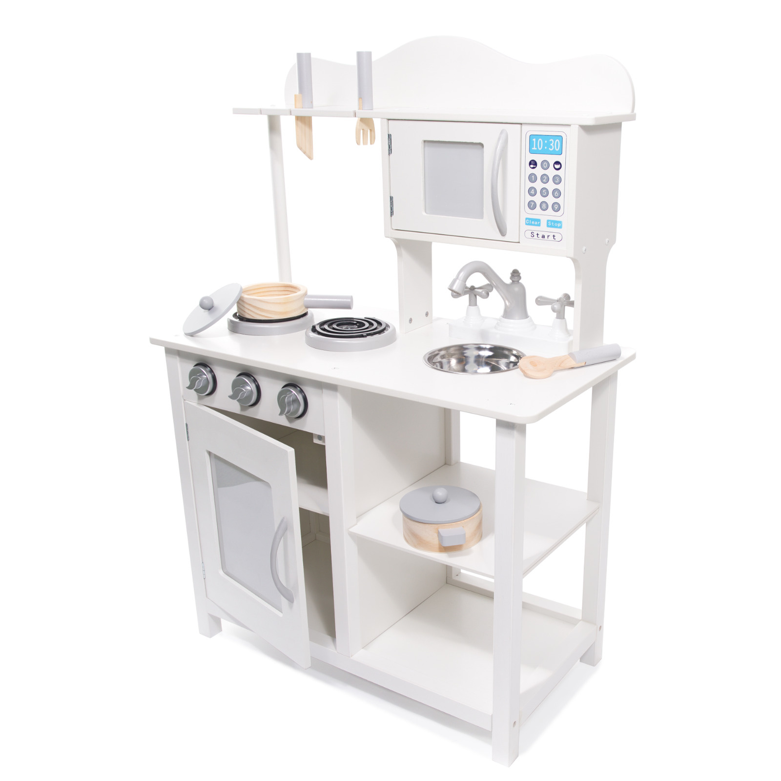 Нашите големи и елегантни дървени кухни са подходящи за всяка детска стая. Универсалният бял цвят напомня на традиционните кухни и позволява на детето ви да се включи още повече в играта.