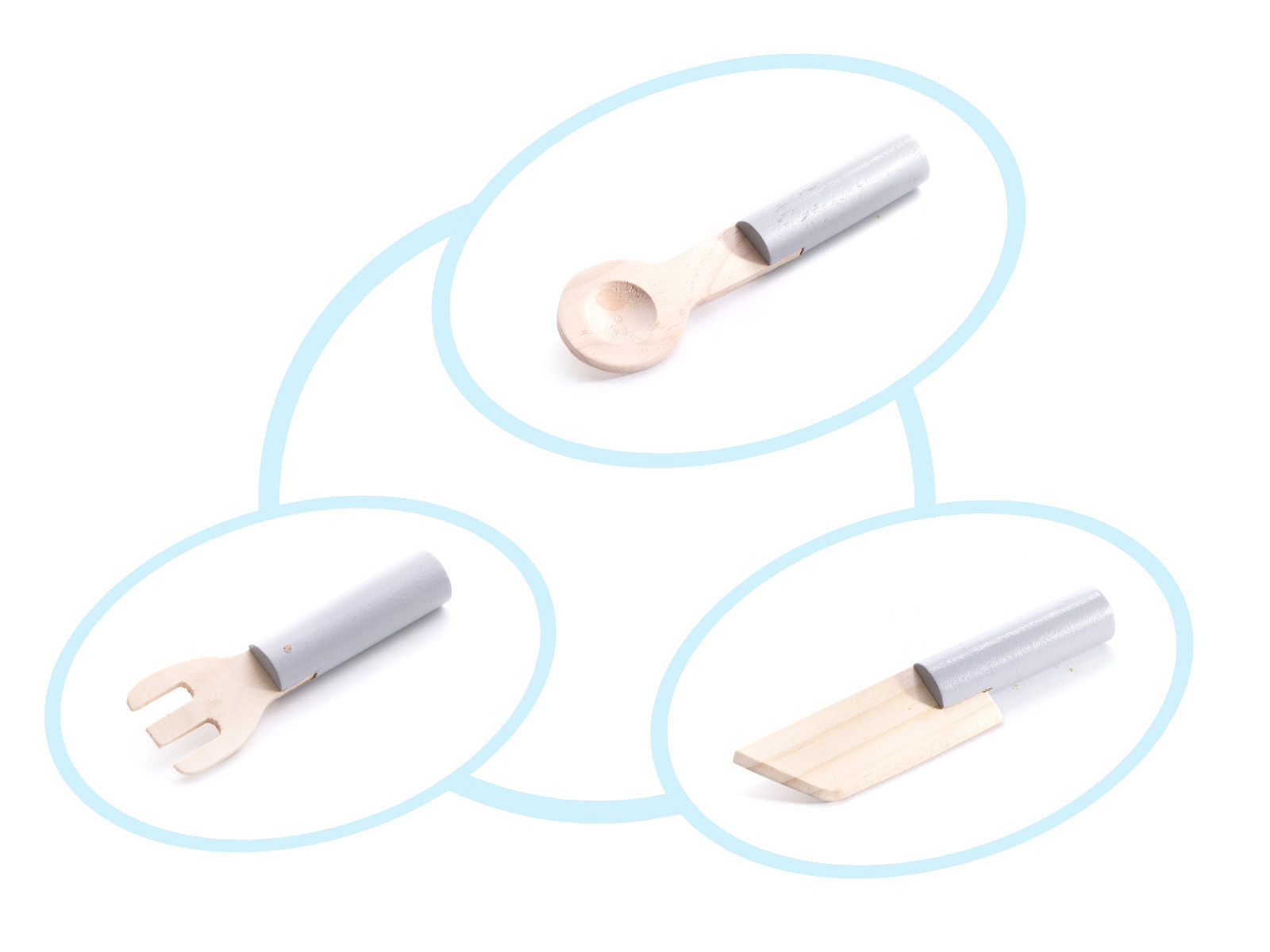 Готварските печки са оборудвани с две горелки със сензорни копчета, върху които можете да поставяте тенджери и тигани (с капаци). Играчките са изработени от дърво.