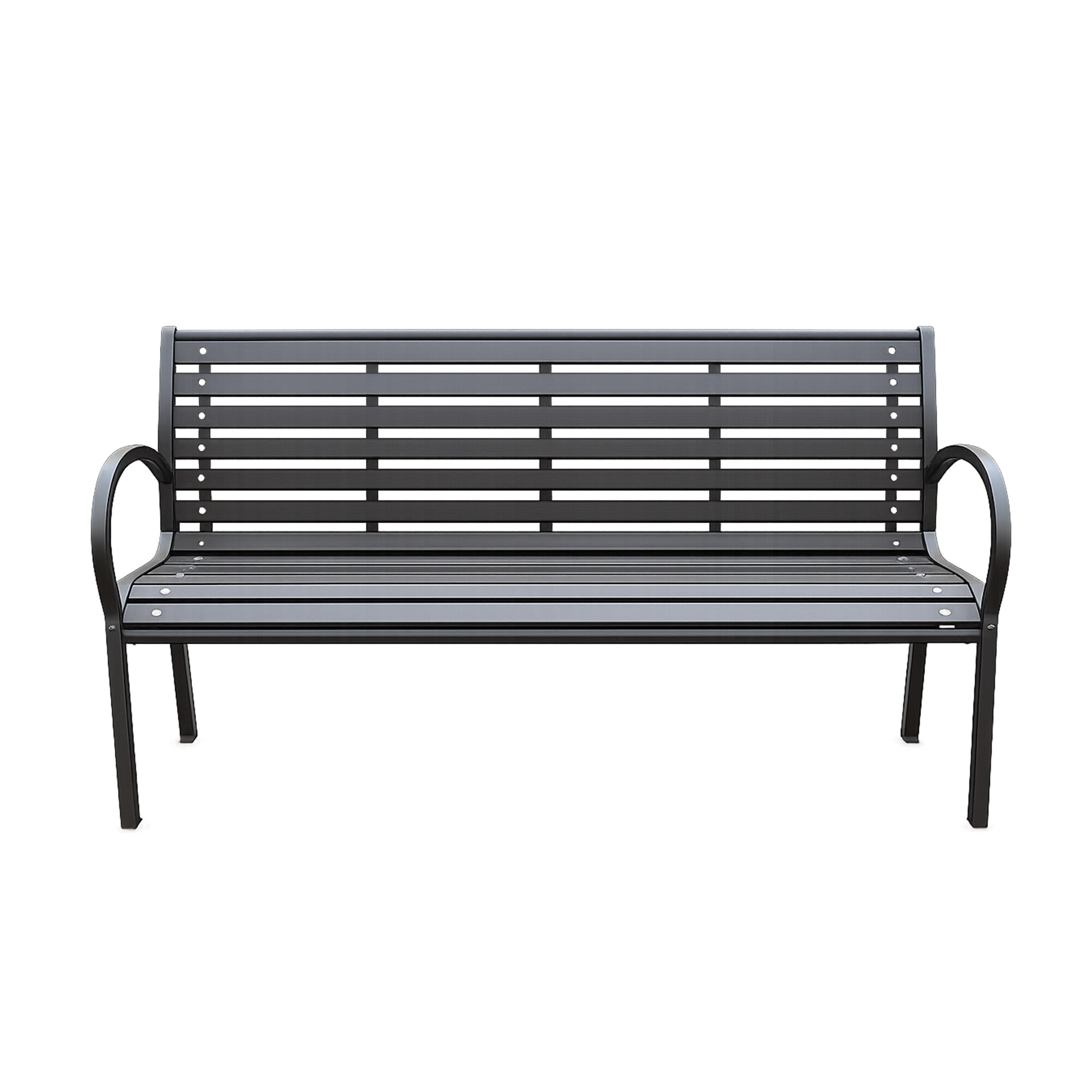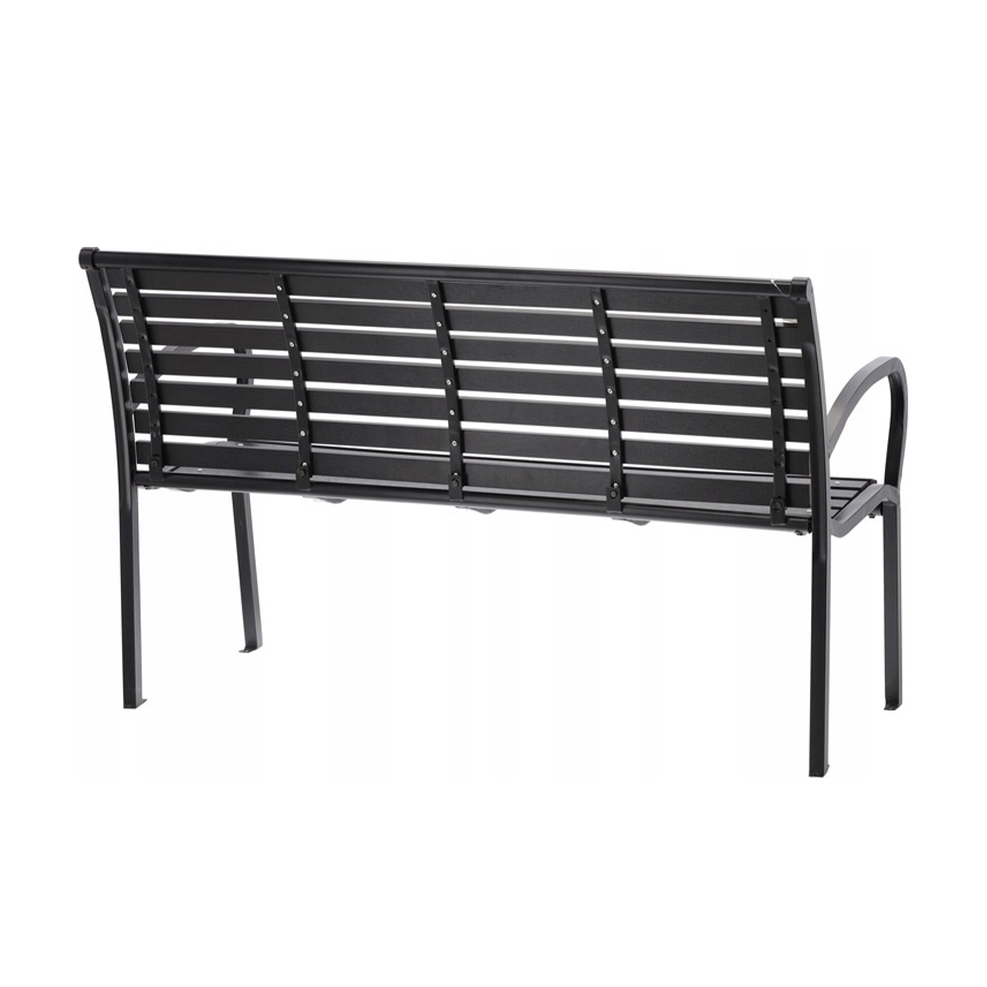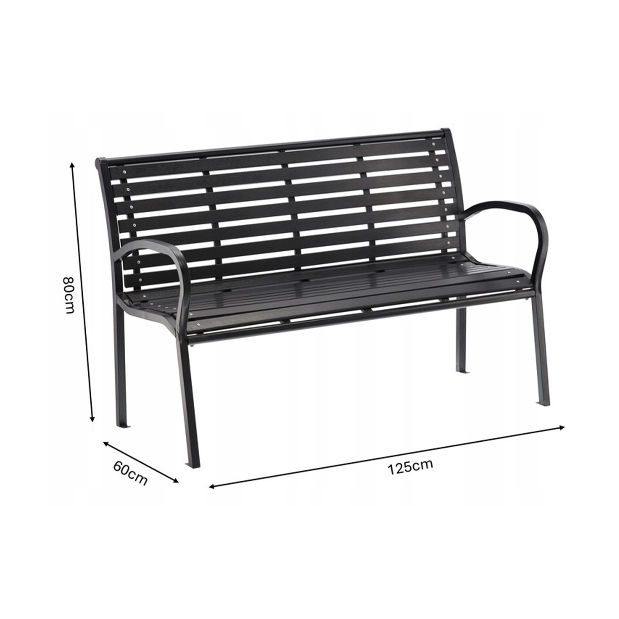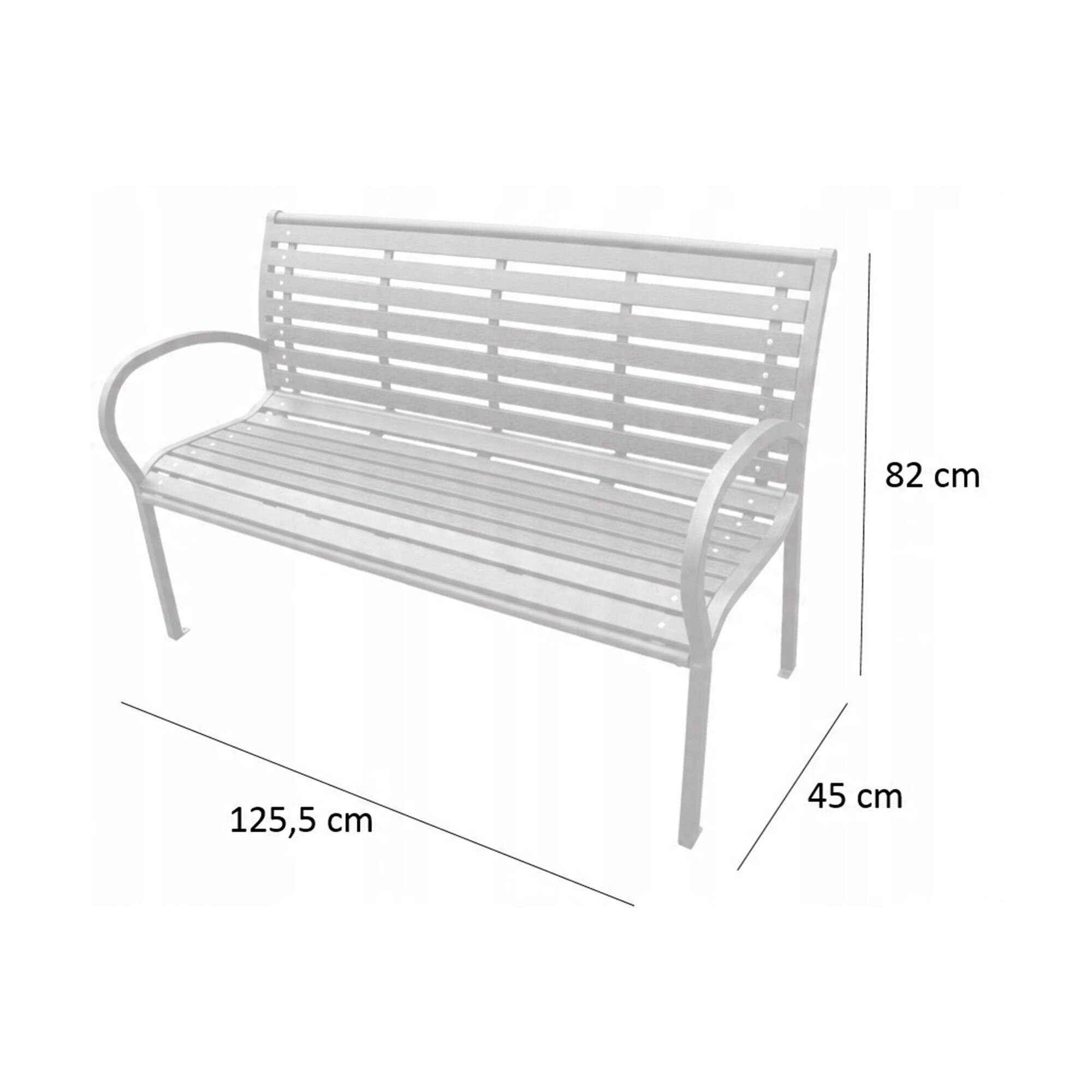 Здрава стоманена конструкция, допълнена с пластмасови летви, имитиращи дърво. Капацитет на пейката 150 кг.