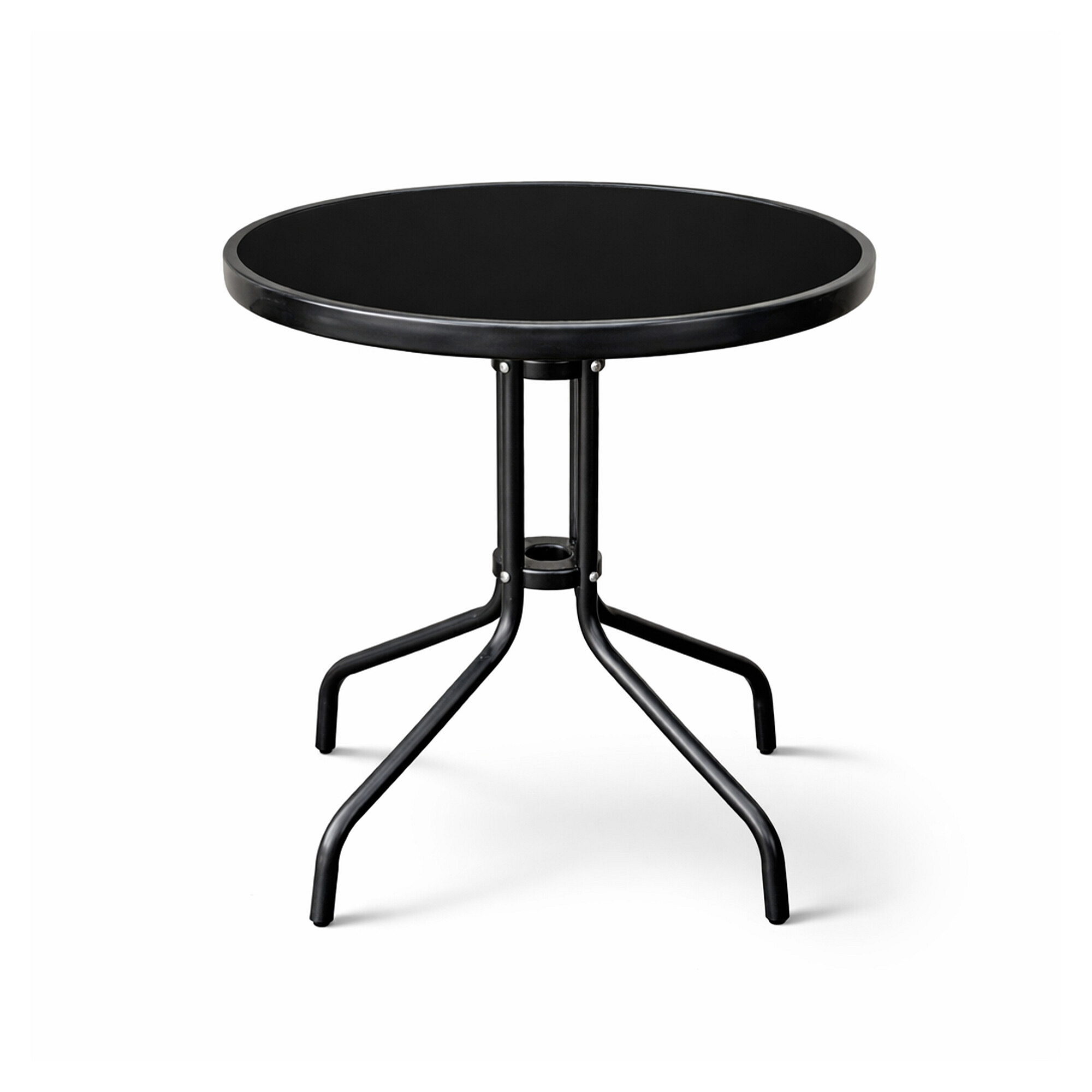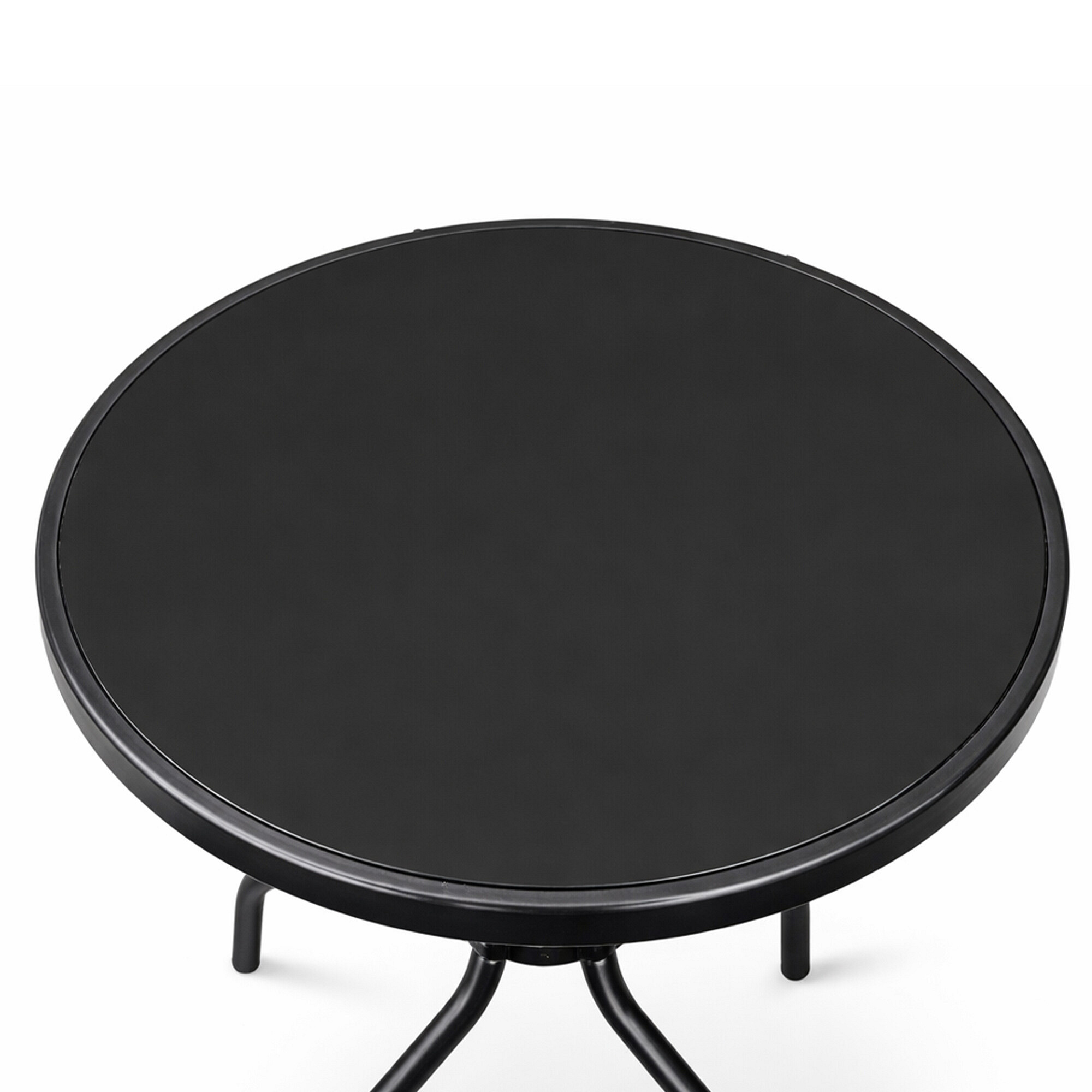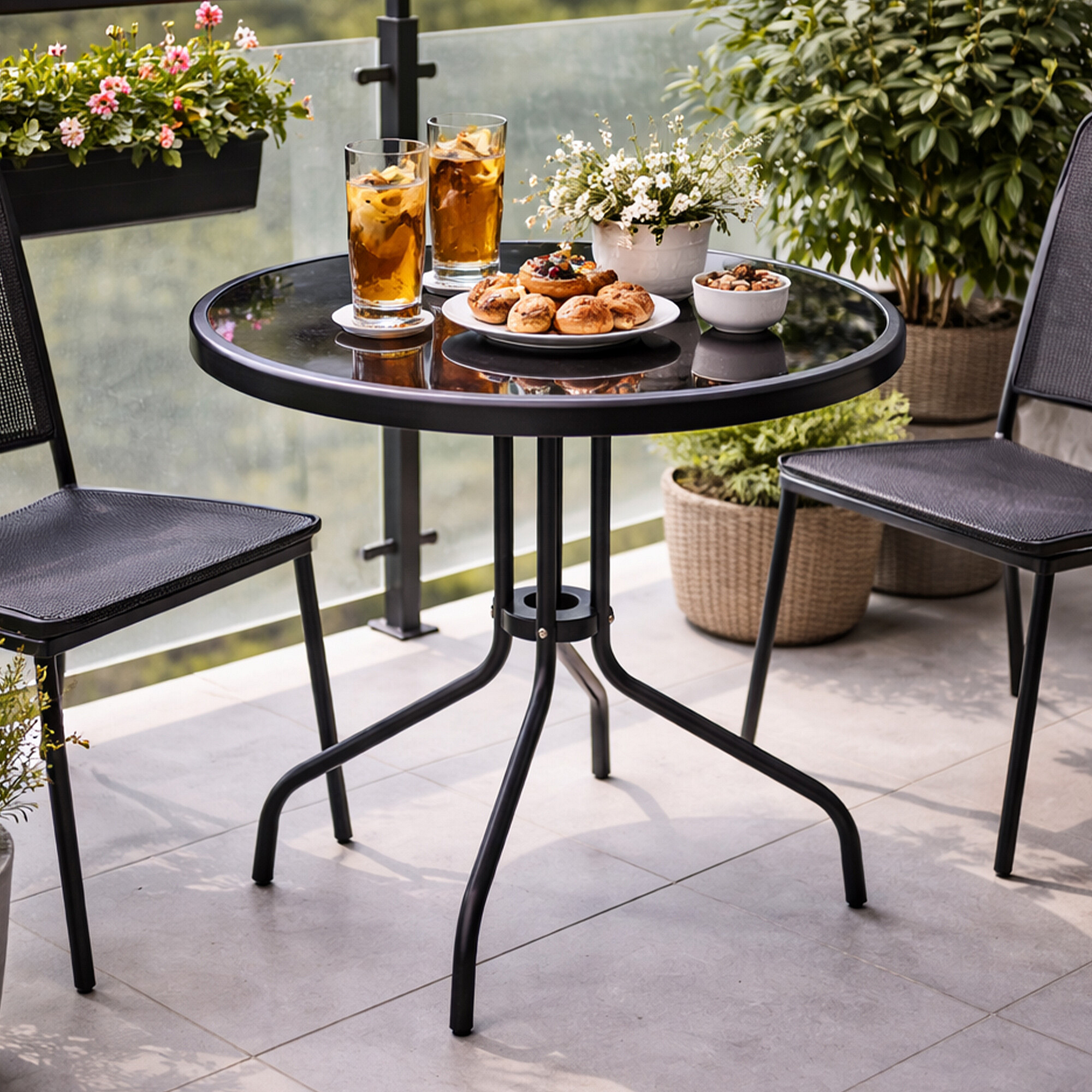 Кръгла градинска маса със здрава метална рамка и стъклен плот, подходяща за градини, тераси, кафенета, беседки, балкони.