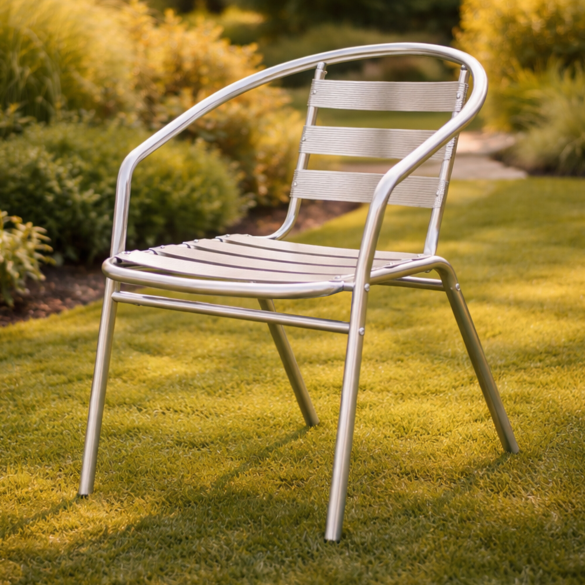 Градински стол с изцяло алуминиева конструкция, в модерен дизайн, подходящ за градини, тераси, веранди, балкони или градински ресторанти.